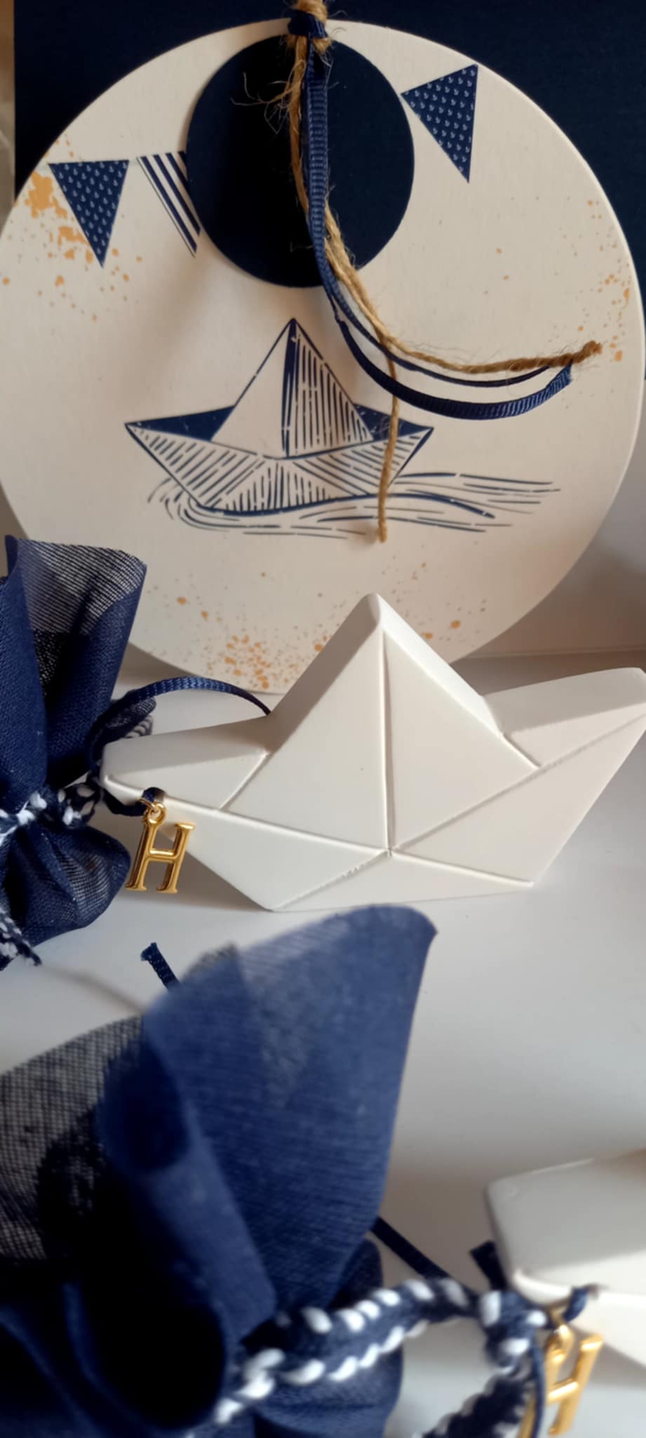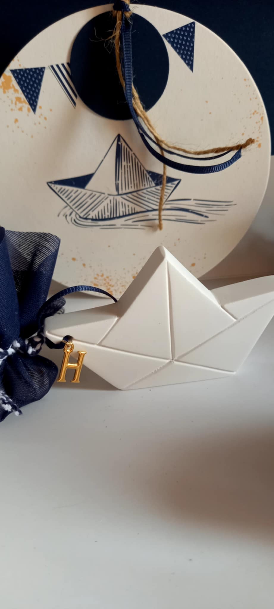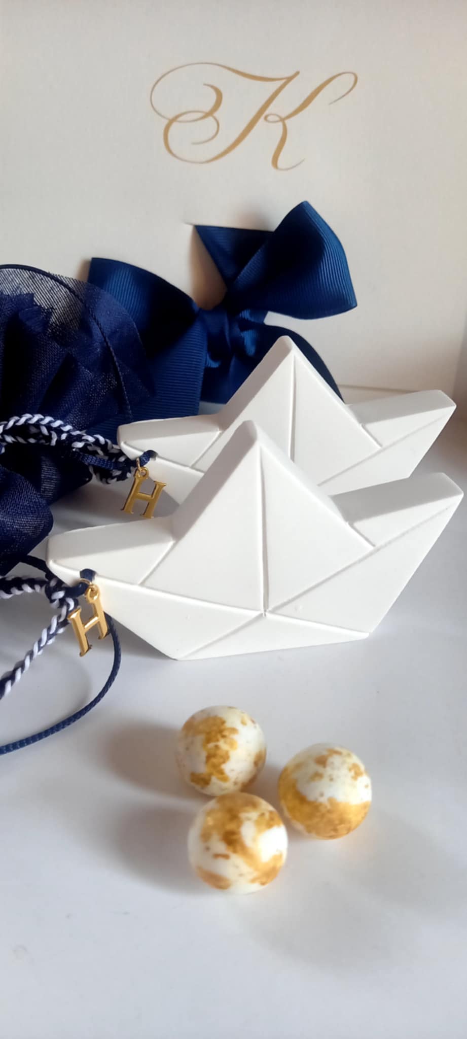 Μπομπονιέρα γάμου - βάπτισης καραβάκι σε λευκό χρώμα με υφή πορσελάνης, κορδέλες σε αποχρώσεις του μπλε και επιχρυσωμένο μονόγραμμα της επιλογής σας.