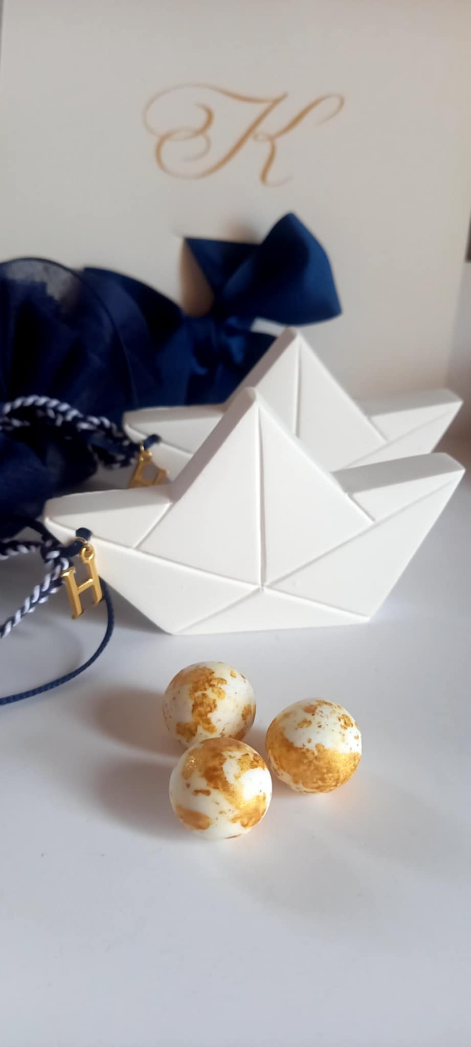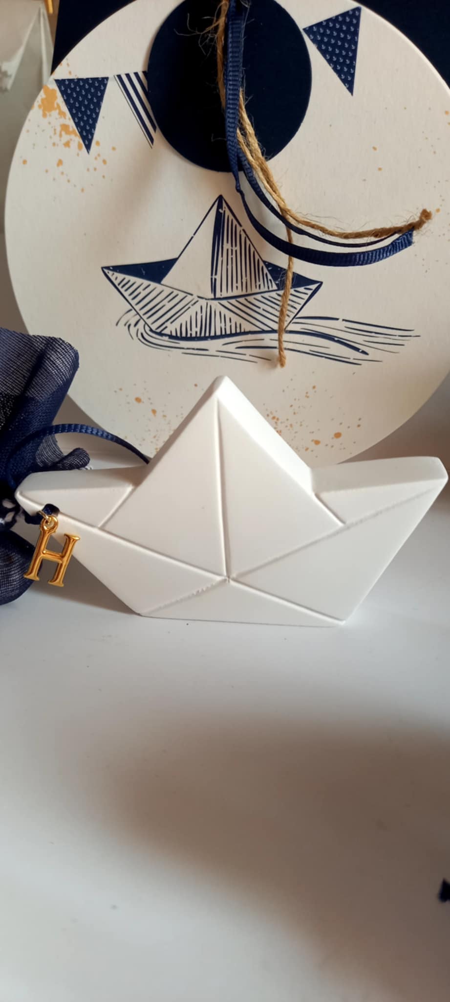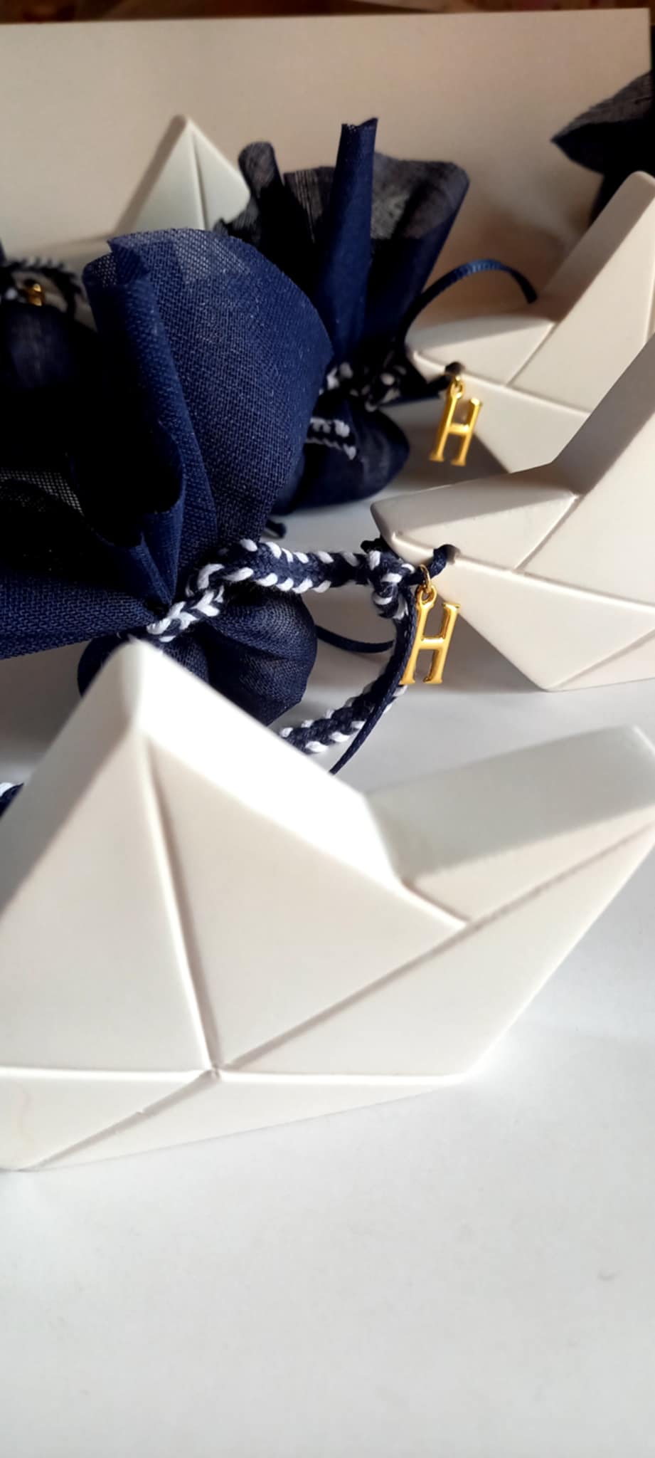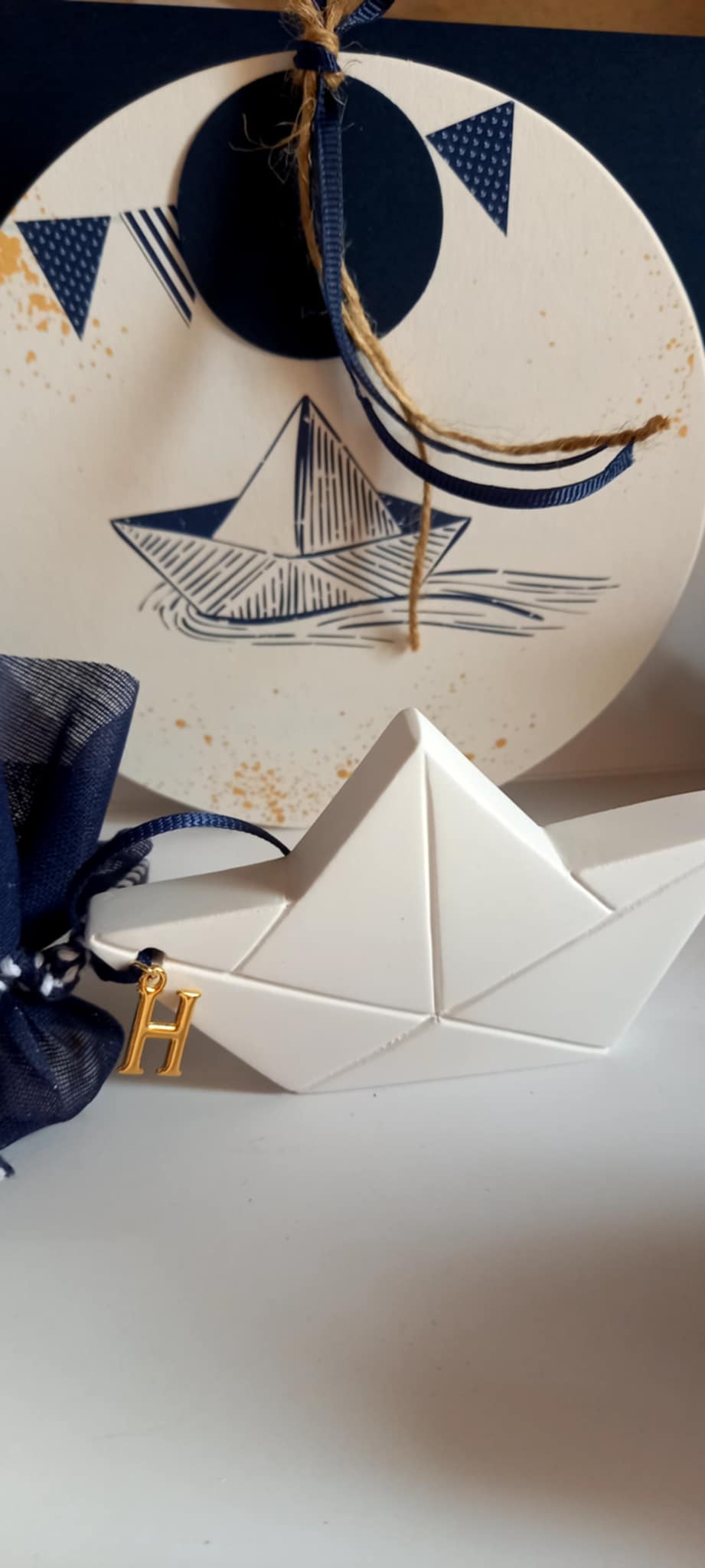 Μπομπονιέρα γάμου - βάπτισης καραβάκι σε λευκό χρώμα με υφή πορσελάνης, κορδέλες σε αποχρώσεις του μπλε και επιχρυσωμένο μονόγραμμα της επιλογής σας.