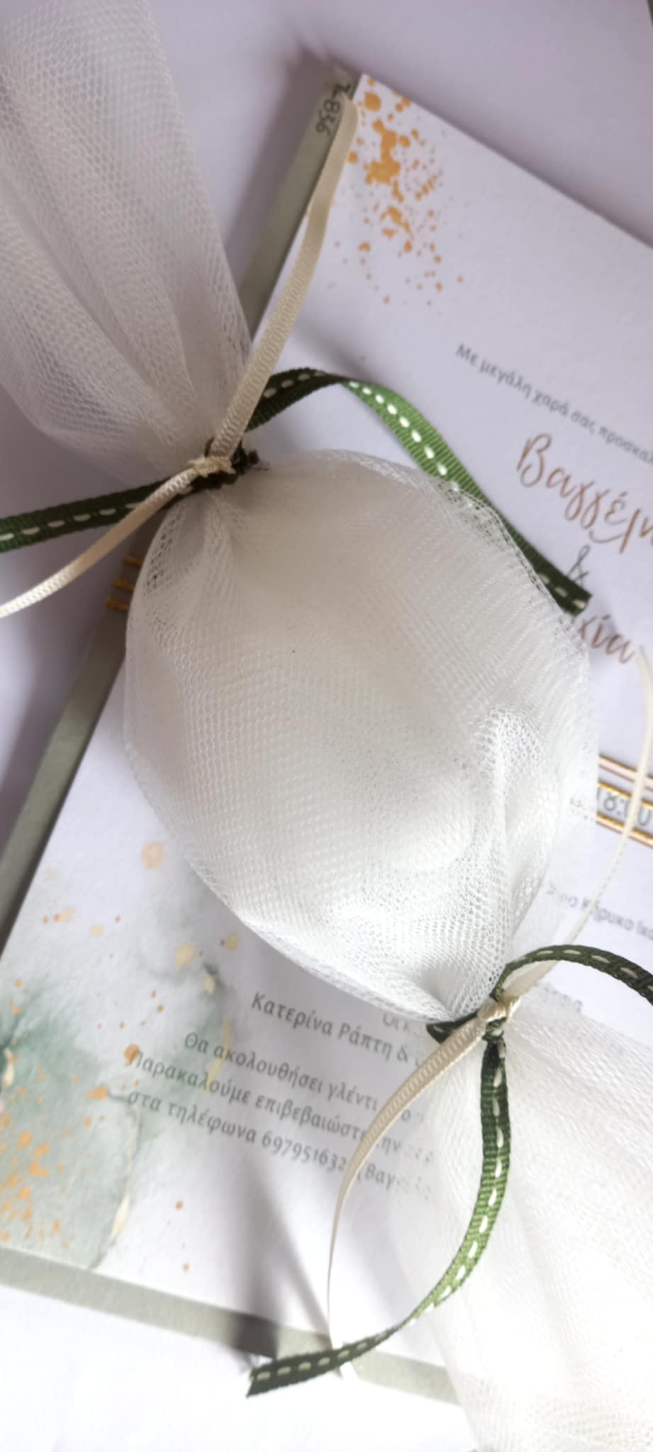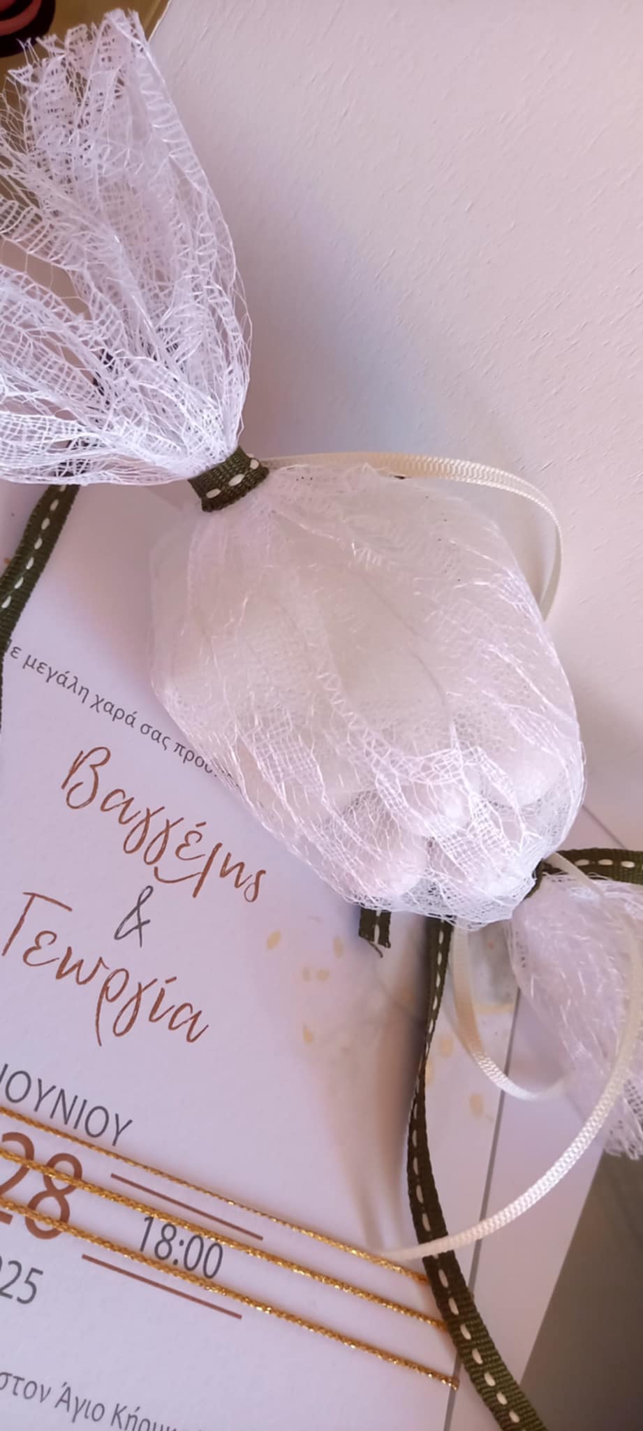 Περιλαμβάνει πέντε κουφέτα αμυγδάλου Χατζηγιαννάκη τυλιγμένα σε τούλι.