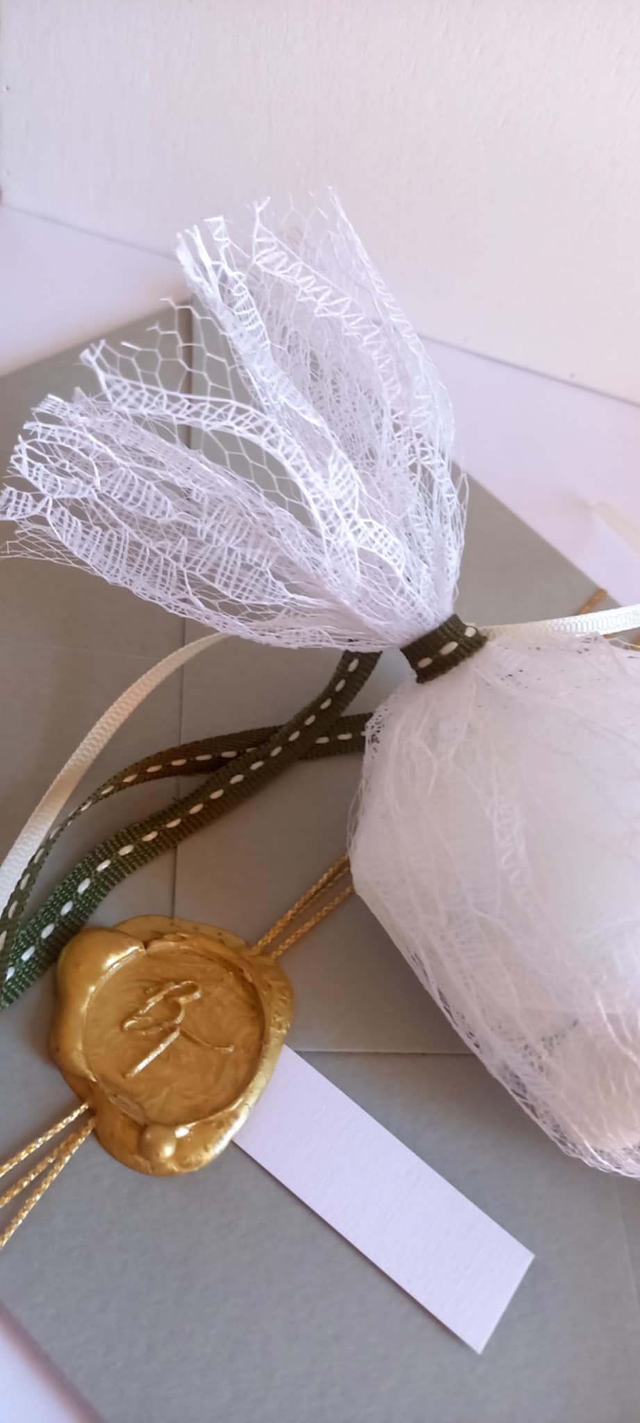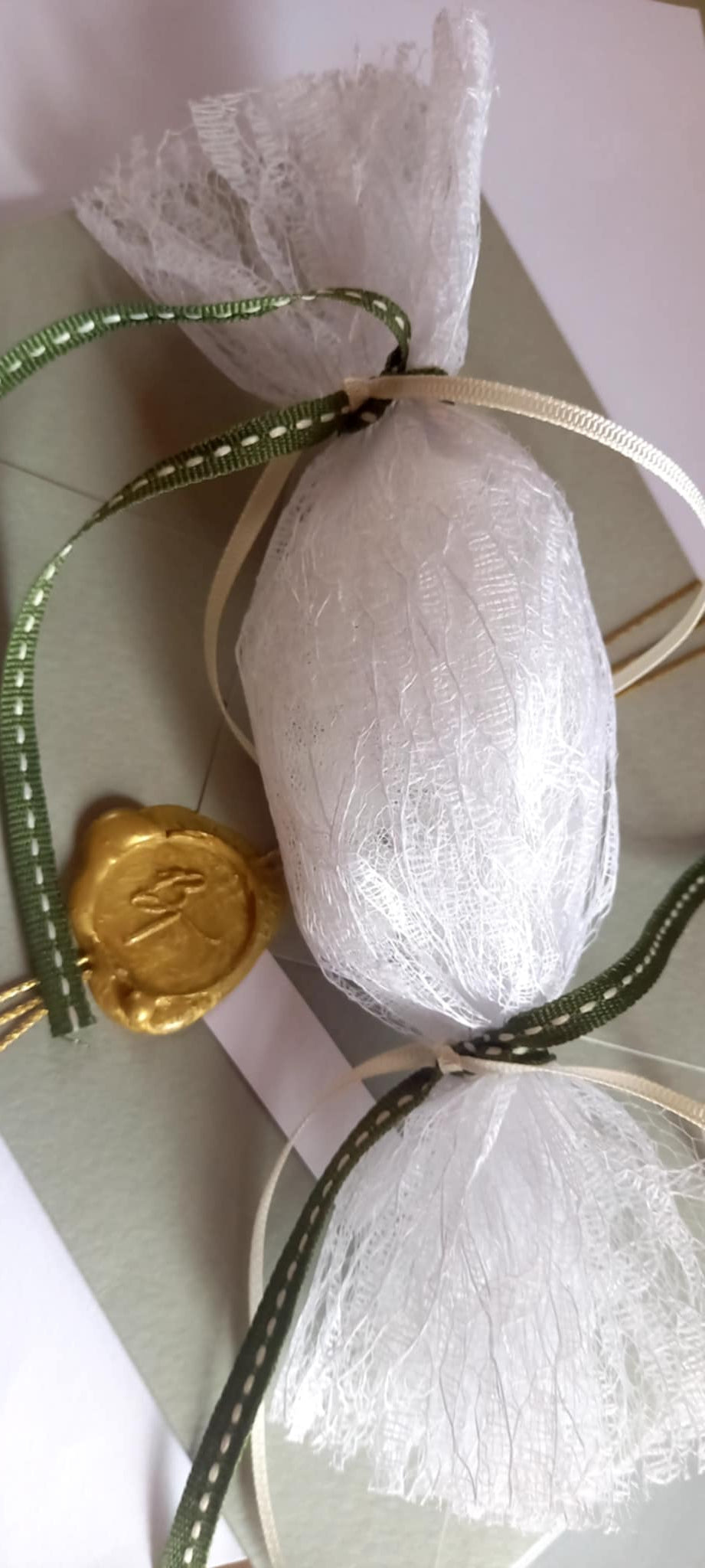 Μπομπονιέρα γάμου - βάπτισης καραμέλα με δαντέλα σε λευκό χρώμα και κορδέλες σε αποχρώσεις του πράσινου.
