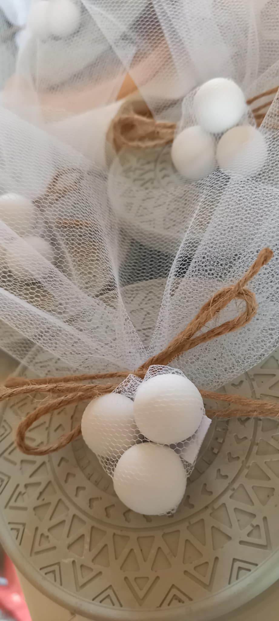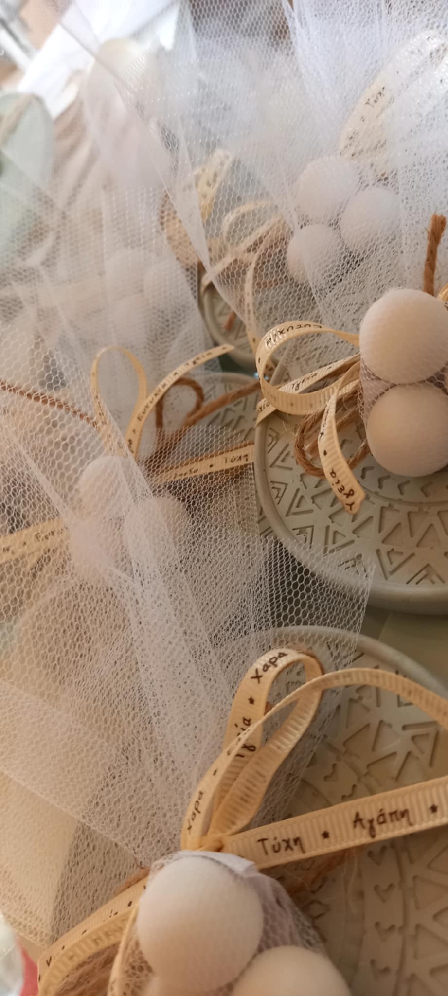 Χειροποίητη μπομπονιέρα γάμου - βάπτισης κεραμικό σουβέρ σε απαλό λαδί χρώμα και κομψό ανάγλυφο σχέδιο. Περιλαμβάνει τρία κουφέτα crispy Χατζηγιαννάκη σε λευκό χρώμα τυλιγμένα σε τούλι και δεμένα με κορδόνι λινάτσας και κορδέλα με ευχές.