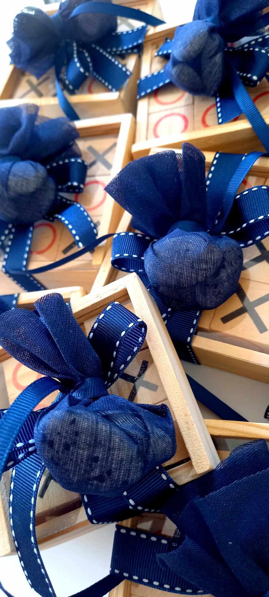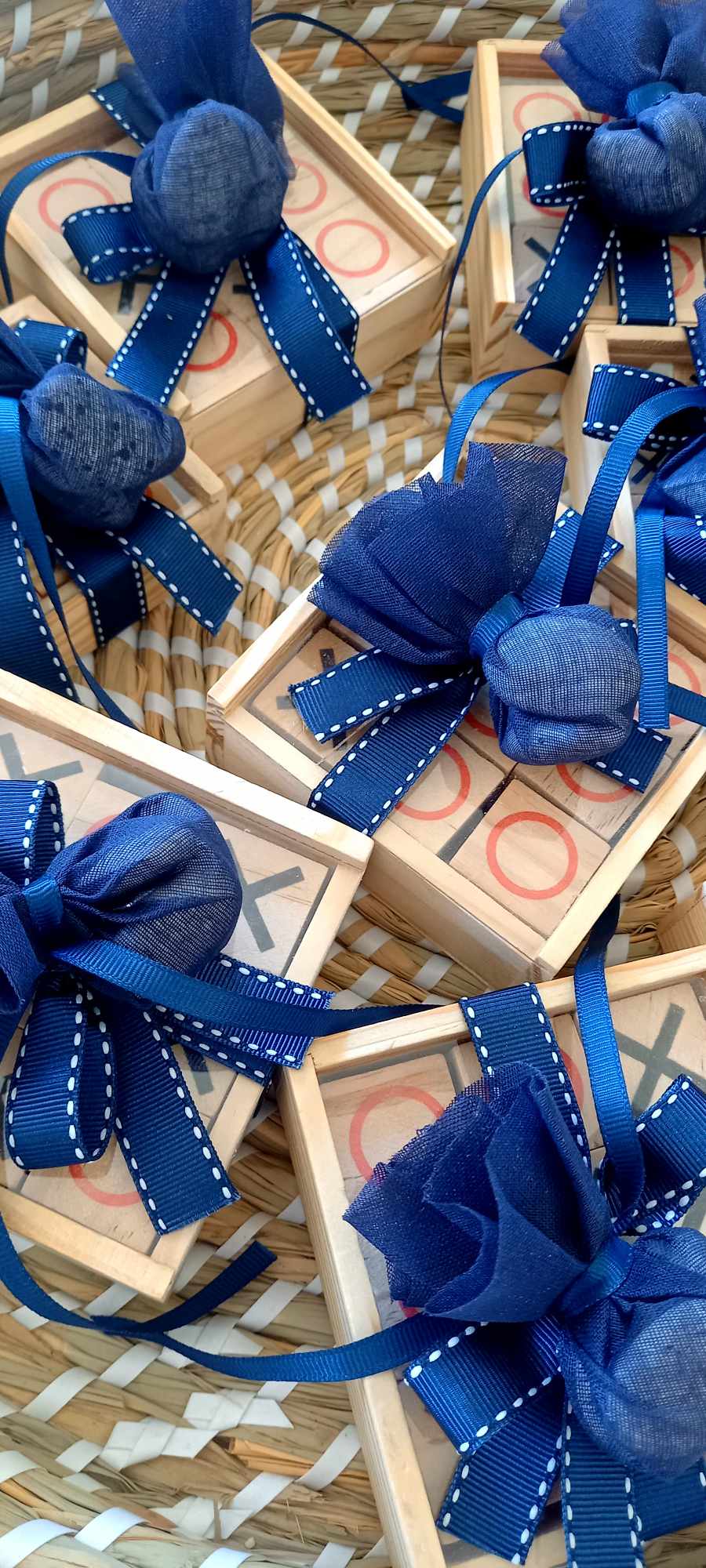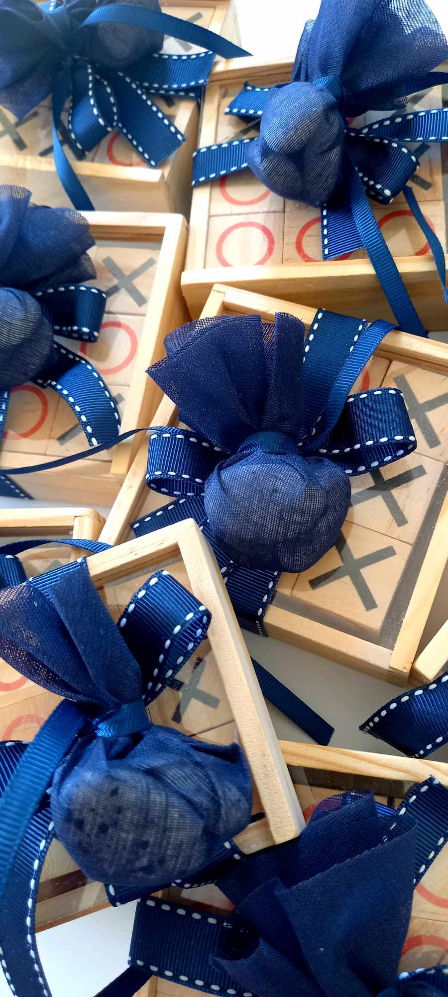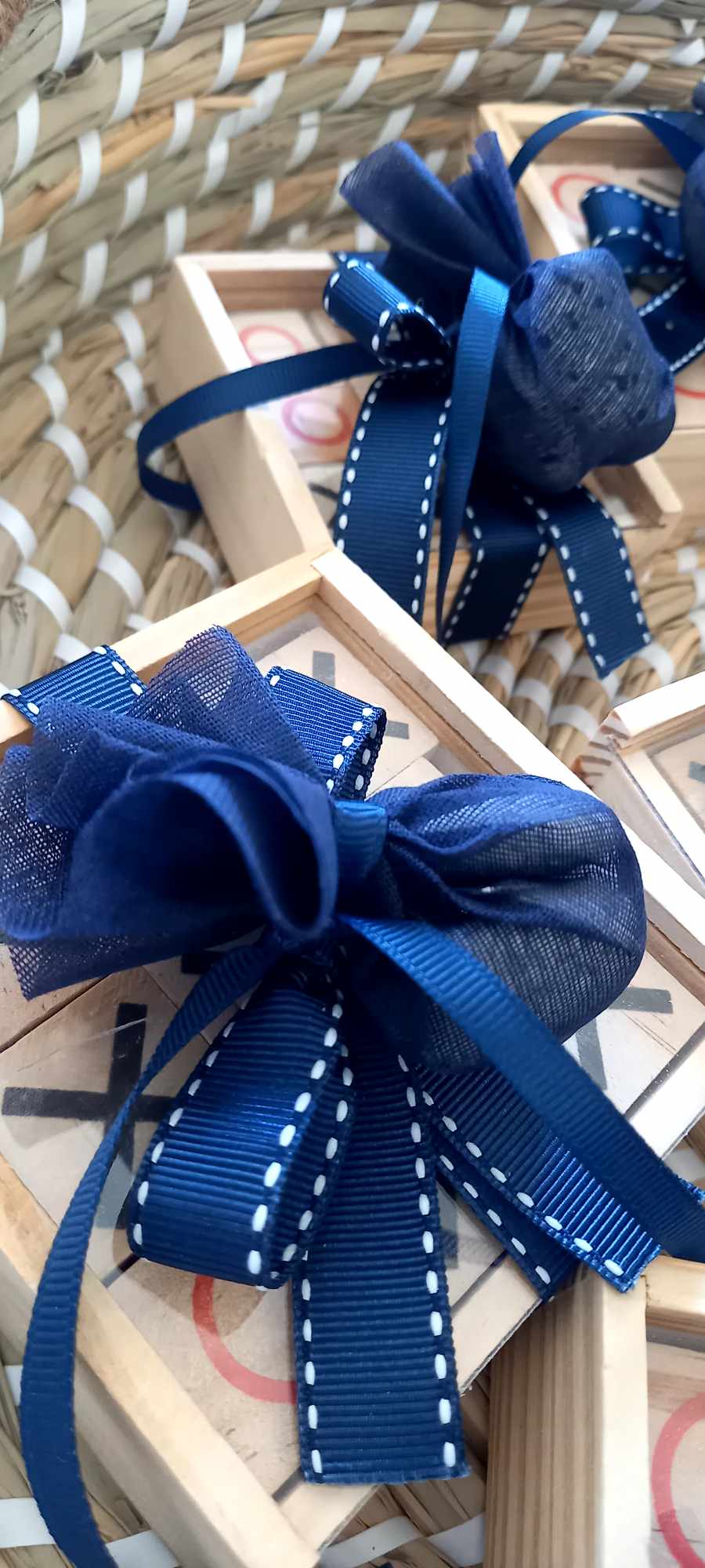 Περιλαμβάνει τρία κουφέτα crispy Χατζηγιαννάκη τυλιγμένα σε γάζα και δεμένα με γκρο κορδέλα σε απόχρωση navy blue και λευκή ραφή.
