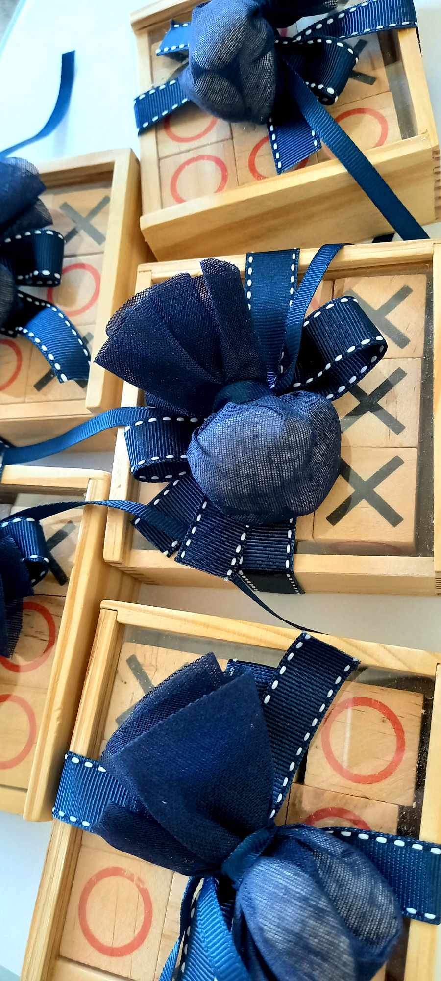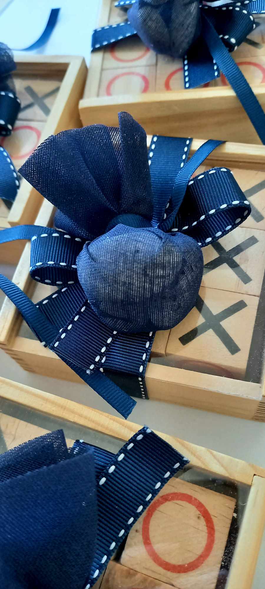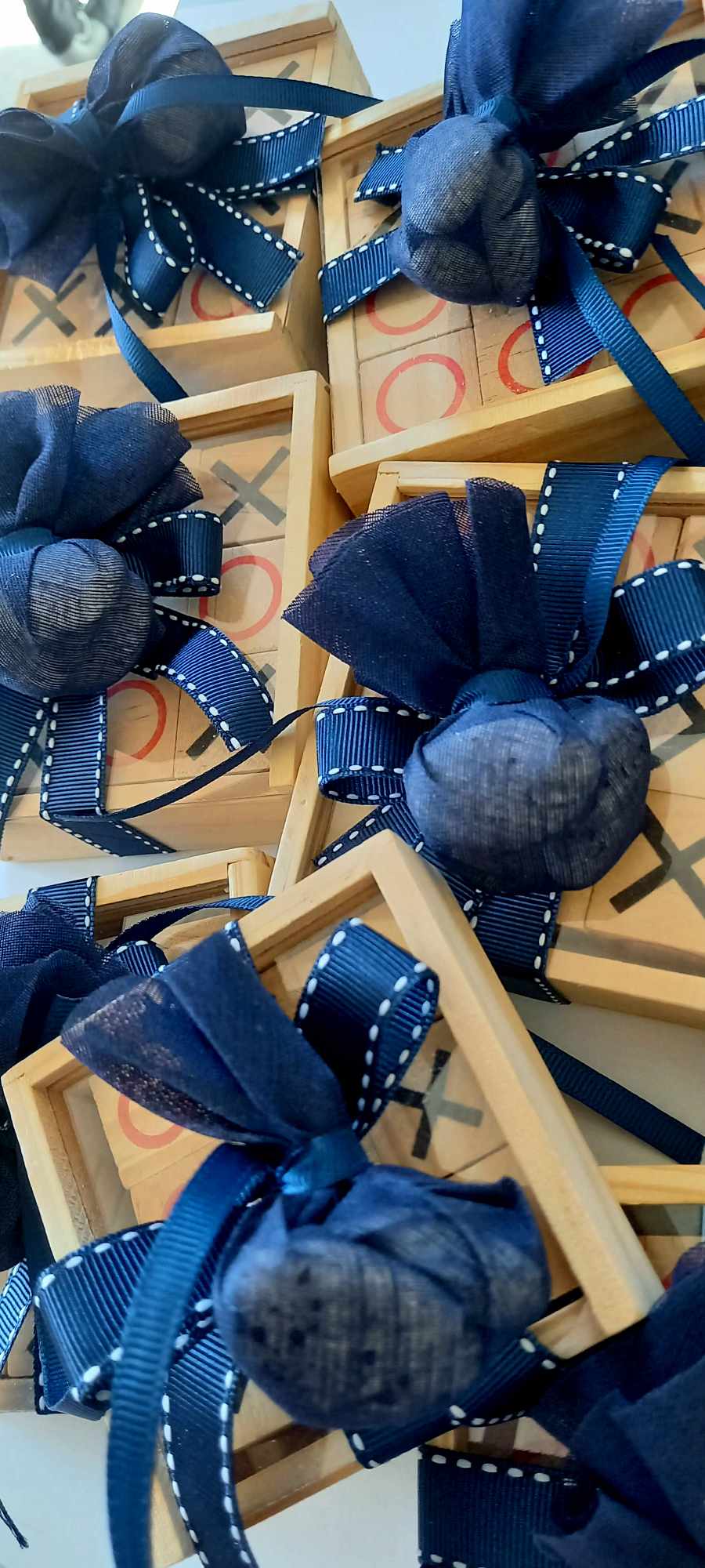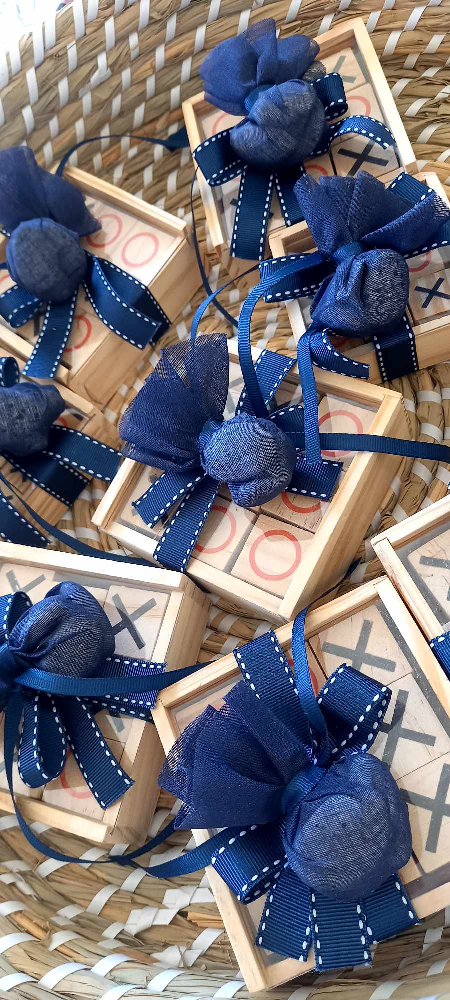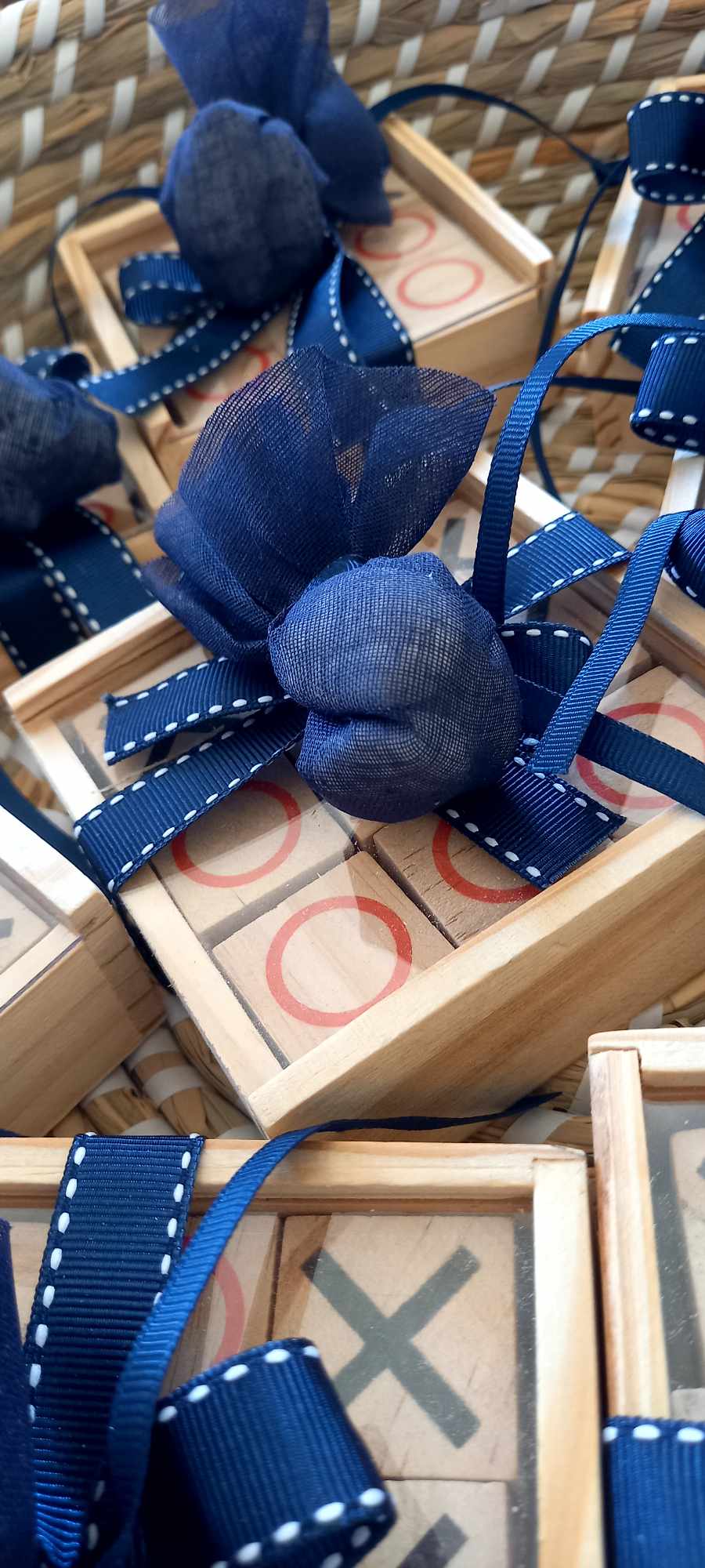 Περιλαμβάνει τρία κουφέτα crispy Χατζηγιαννάκη τυλιγμένα σε γάζα και δεμένα με γκρο κορδέλα σε απόχρωση navy blue και λευκή ραφή.