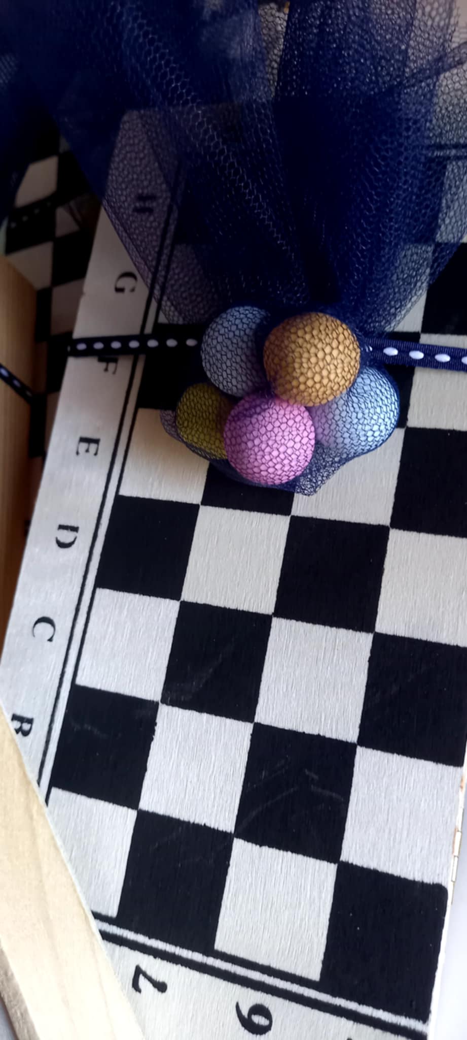 Μπορεί να περιλαμβάνει, εκτός από τα κουφέτα: 1. Ξύλινο σκάκι για τα μεγαλύτερα παιδιά, 2. Ξύλινο ντόμινο, 3. Ντόμινο και σουπλά που μπορεί να ζωγραφίσει το παιδί, μαζί με κηρομπογιές.