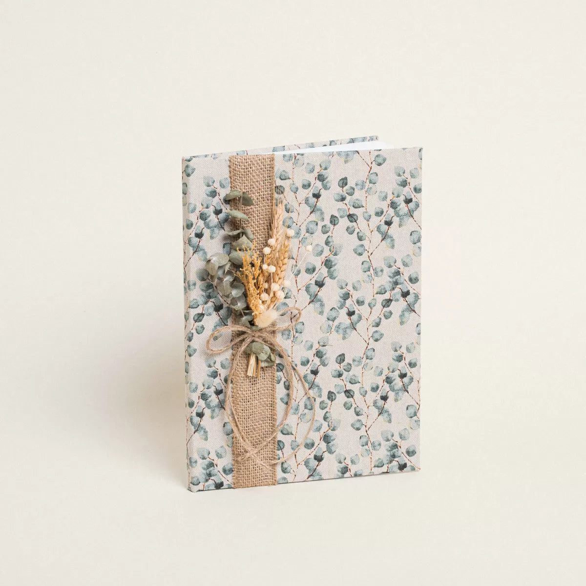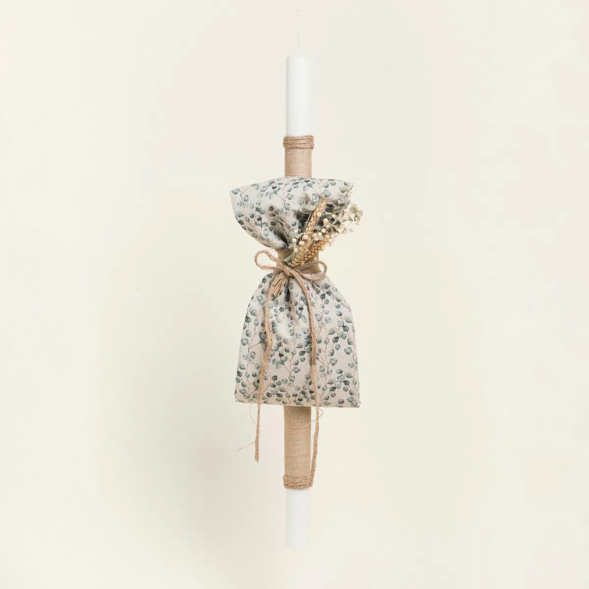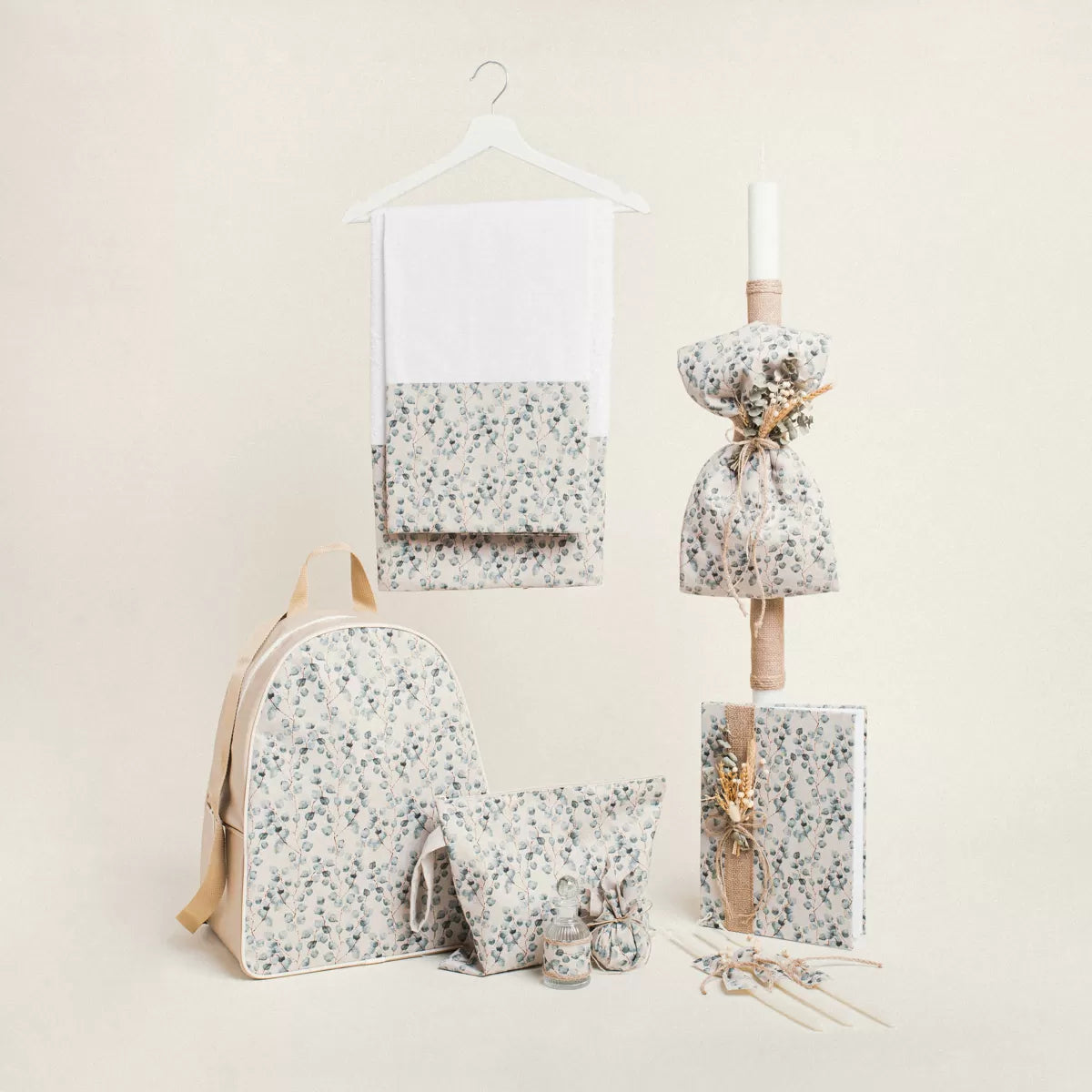 Κομψό σετ βάπτισης ευκάλυπτος σε γλυκιές αποχρώσεις του πράσινου με αποξηραμένα λουλουδάκια.