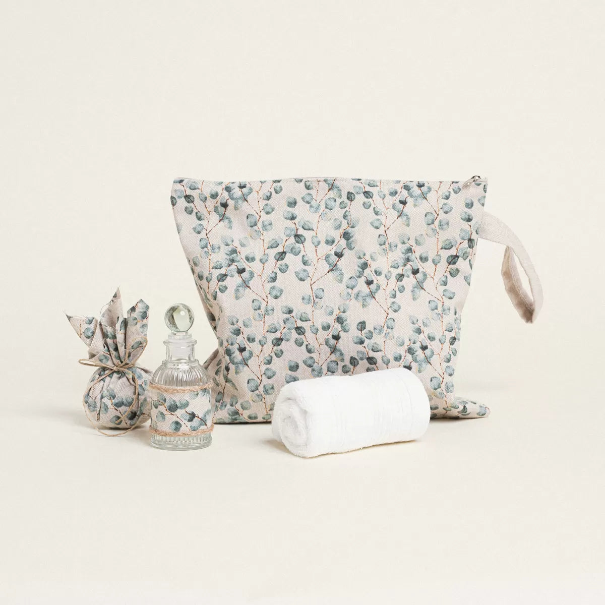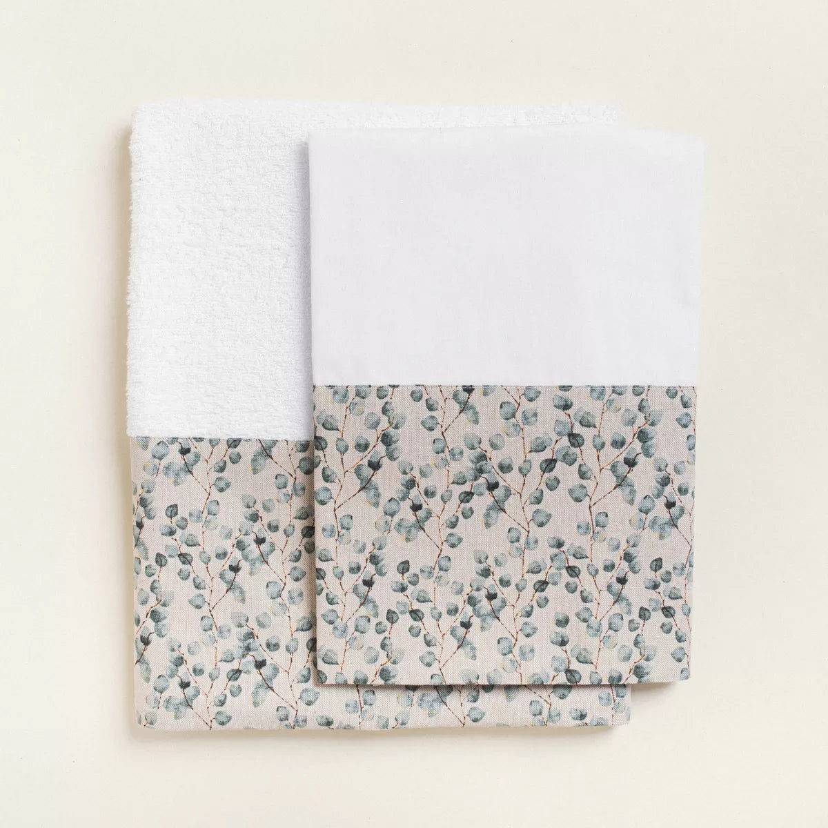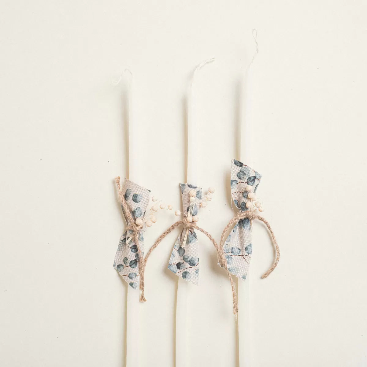 Κομψό σετ βάπτισης ευκάλυπτος σε γλυκιές αποχρώσεις του πράσινου με αποξηραμένα λουλουδάκια.