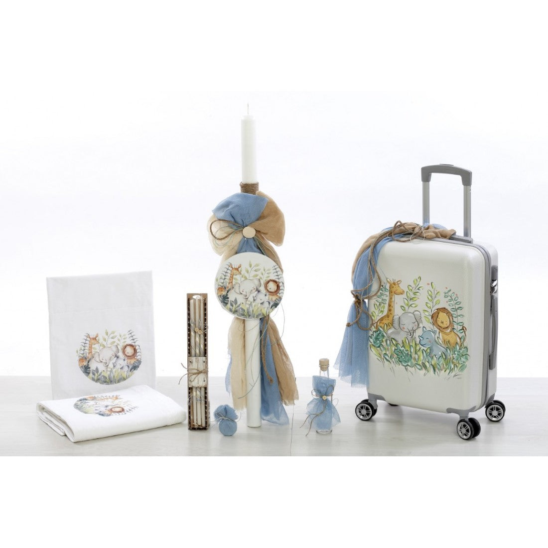 Σετ βάπτισης με θέμα ζωάκια ζούγκλας σε αποχρώσεις μπεζ και γαλάζιου.