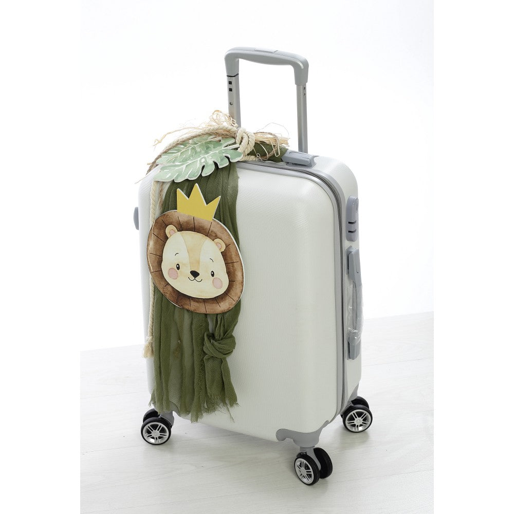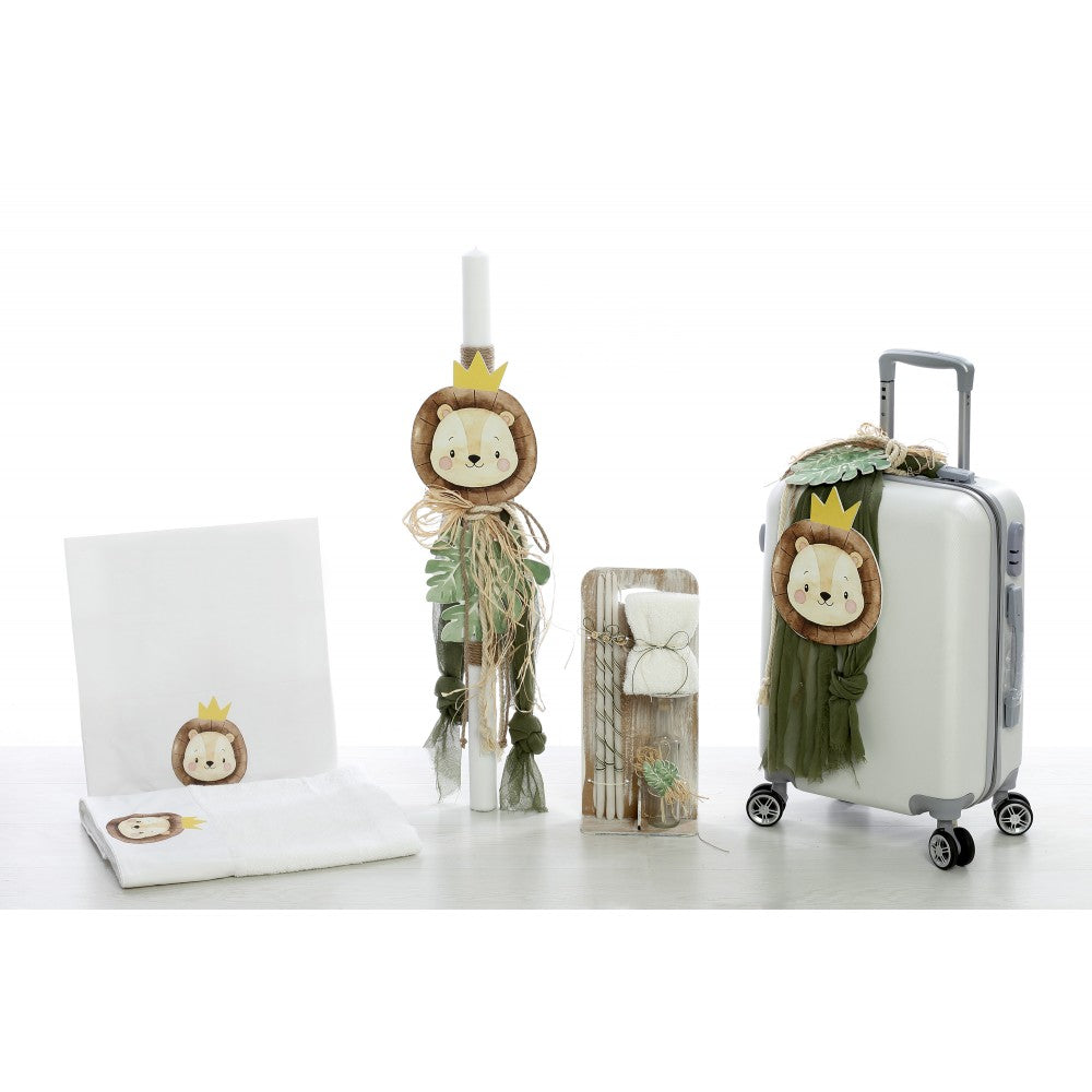 Σετ βάπτισης με θέμα λιονταράκι με κορώνα σε γήινους τόνους. Περιλαμβάνει: 1. Λαμπάδα με ξύλινη παράσταση, γάζα σε πράσινο χρώμα, κορδέλες και σχοινιά, 2. Βαλίτσα με την ίδια διακόσμηση, 3. Λαδόπανα (μικρή πετσέτα, μεγάλη πετσέτα), 4. Λαδοσέτ (σαπουνάκι, κεράκια, μπουκαλάκι λαδιού).