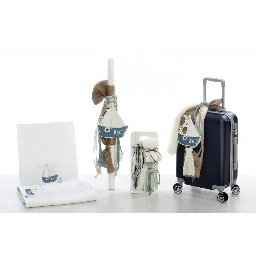 Περιλαμβάνει: 1. Λαμπάδα με ξύλινο καραβάκι, 2. Βαλίτσα σε μπλε σκούρο χρώμα με ξύλινο καραβάκι, λινά υφάσματα και κορδέλες, 3. Λαδόπαν0, 4. Λαδοσέτ (σαπουνάκι, μπουκαλάκι λαδιού, κεράκια).