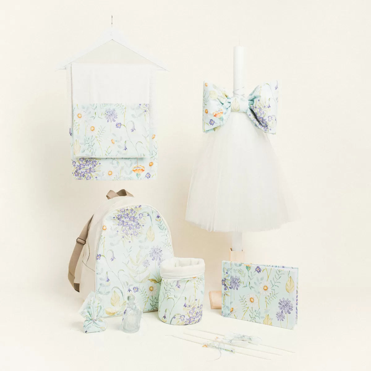 Υπέροχο ρομαντικό σετ βάπτισης με λουλούδια σε βεραμάν φόντο.