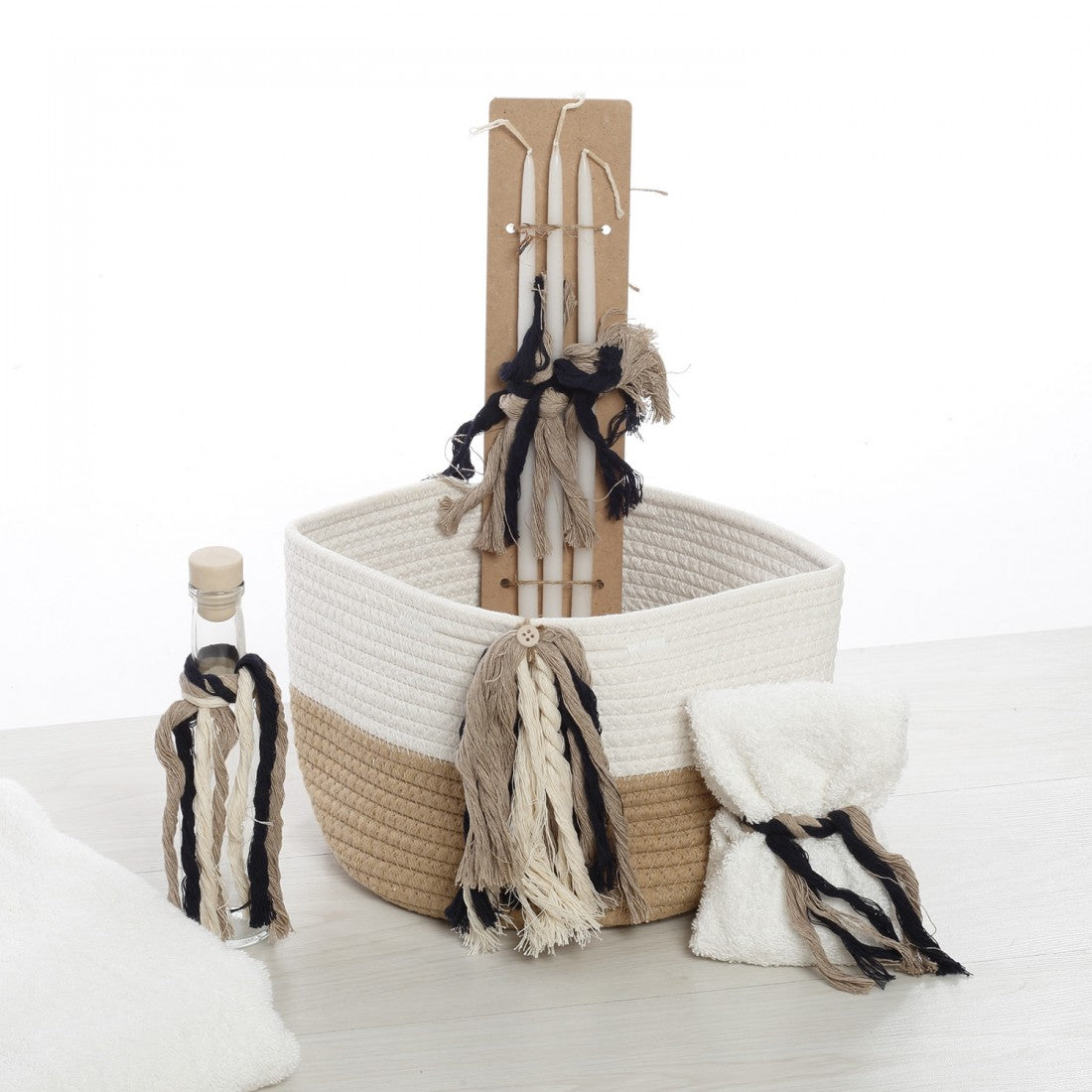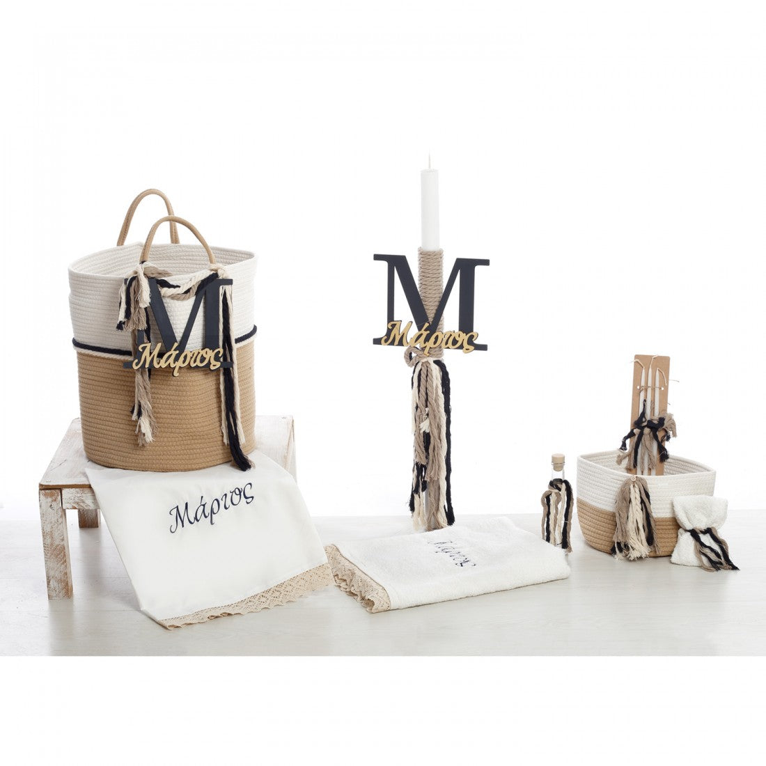Περιλαμβάνει: 1. Δίχρωμο χειροποίητο καλάθι από βαμβακερό σχοινί (φυσικό/λευκό). Διαθέτει εντυπωσιακό στολισμό με χοντρά ναυτικά σχοινιά και  επιβλητικό χρυσό plexiglass ξύλινο μονόγραμμα/αρχικό της επιλογής σας (διαστάσεις 50cm x 40cm x 40cm). 2. Λαμπάδα στολισμένη με navy blue ύφασμα, σχοινιά και το αντίστοιχο χρυσό plexiglass ξύλινο αρχικό του παιδιού. 3. Λαδόπανα: Πλήρες σετ (πετσέτες, εσώρουχα) από 100% βαμβάκι εξαιρετικής ποιότητας, με κεντημένο ή τυπωμένο το όνομα του παιδιού σε navy απόχρωση. 4. Σετ Λαδιού (σε μικρό καλάθι), μπουκάλι λαδιού, σαπούνι και  κεράκια, όλα ασορτί διακοσμημένα με navy κορδέλες και χρυσές λεπτομέρειες.