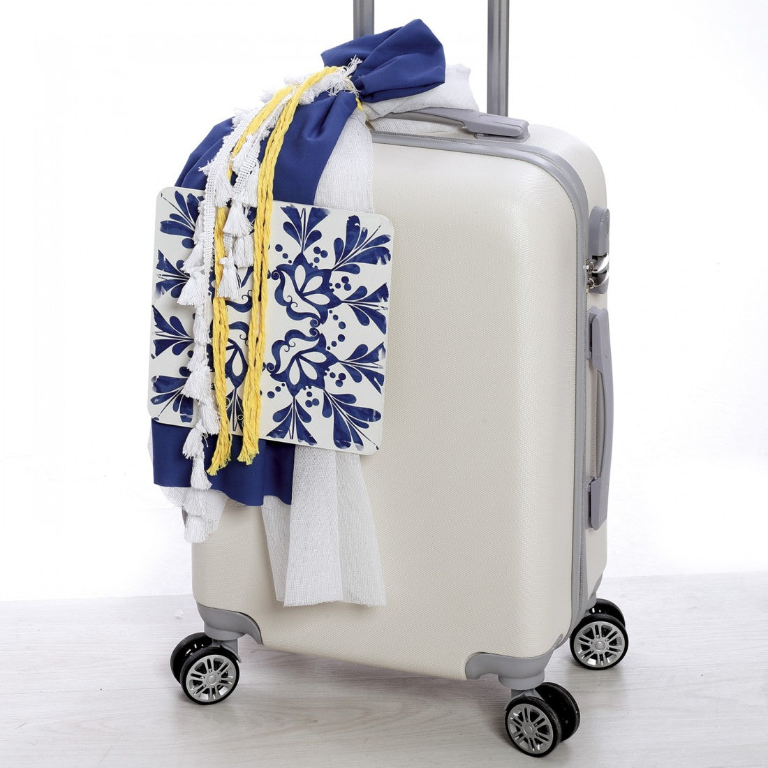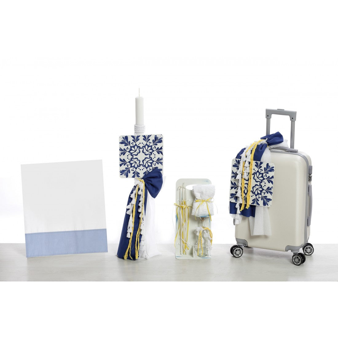 Περιλαμβάνει: 1. Σκληρή βαλίτσα (57Χ40Χ22 εκ) με υφάσματα, σχοινιά και κορδέλες σε λευκό-μπλε και κίτρινο, 2. Λαδόπανα από 100% βαμβάκι σε λευκό-γαλάζιο, 3. Λαμπάδα με ασορτί διακόσμηση, 4. Σετ λαδιού (μπουκαλάκι λαδιού, κεράκια, σαπουνάκι, πετσέτα).