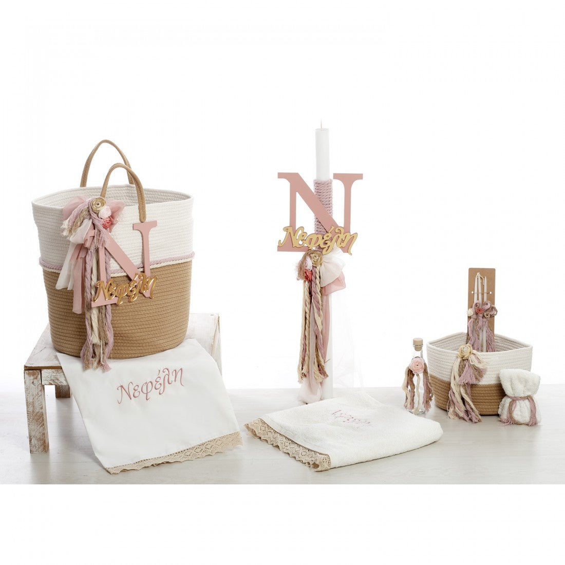 Κομψό σετ βάπτισης σε στυλ boho με μονόγραμμα σε αποχρώσεις λευκού και dusty pink.