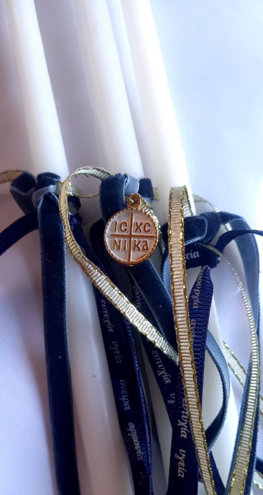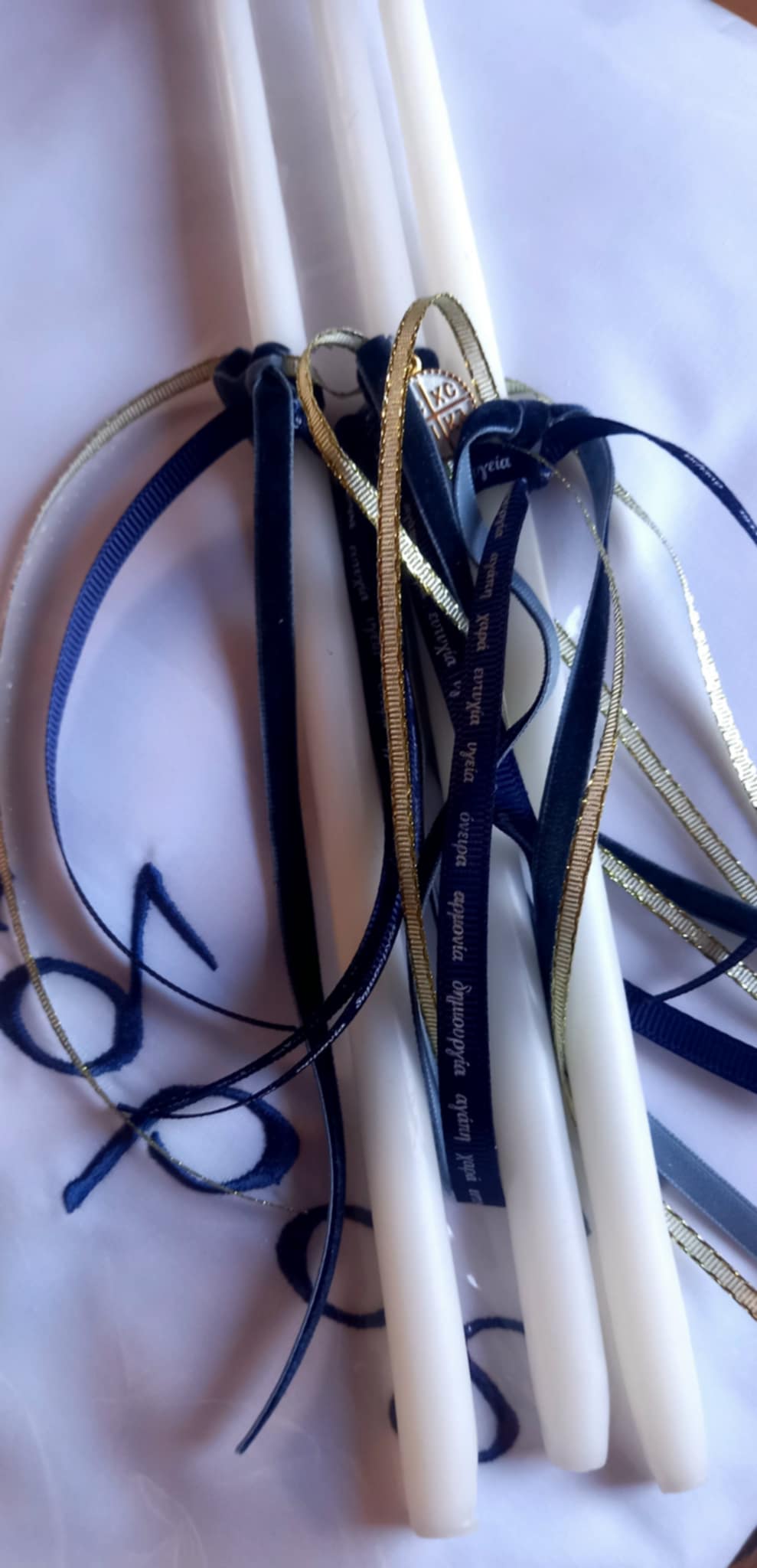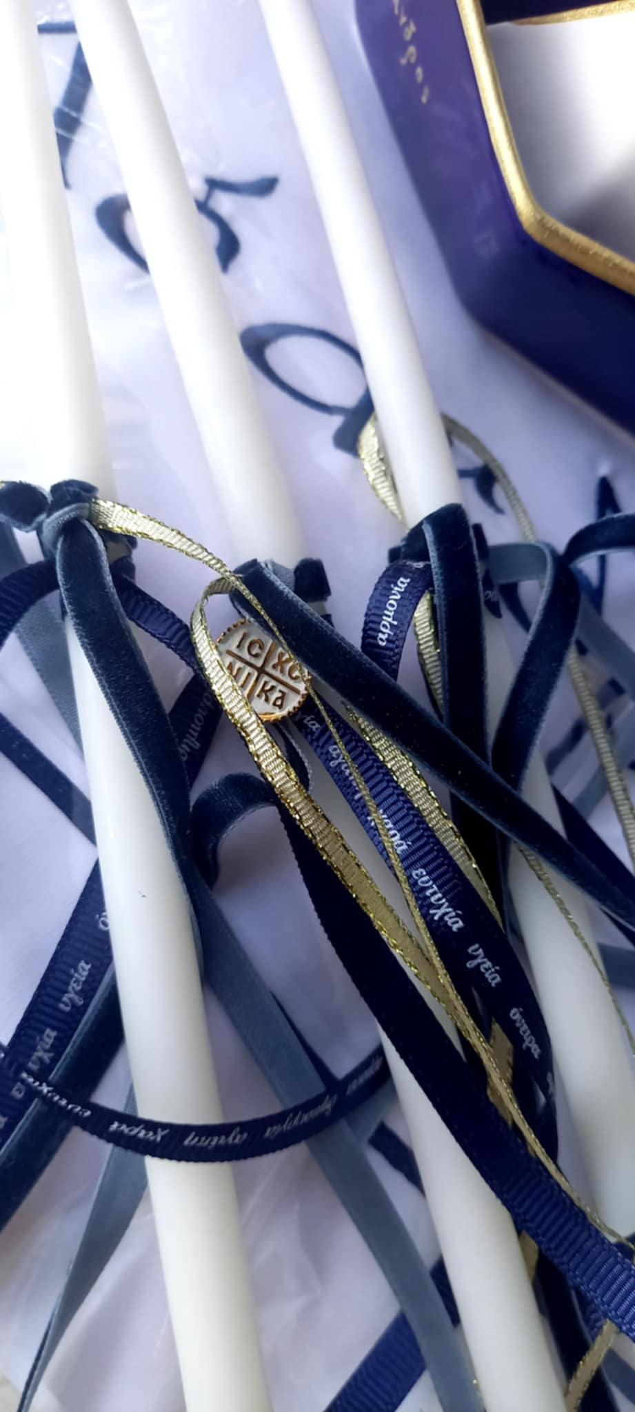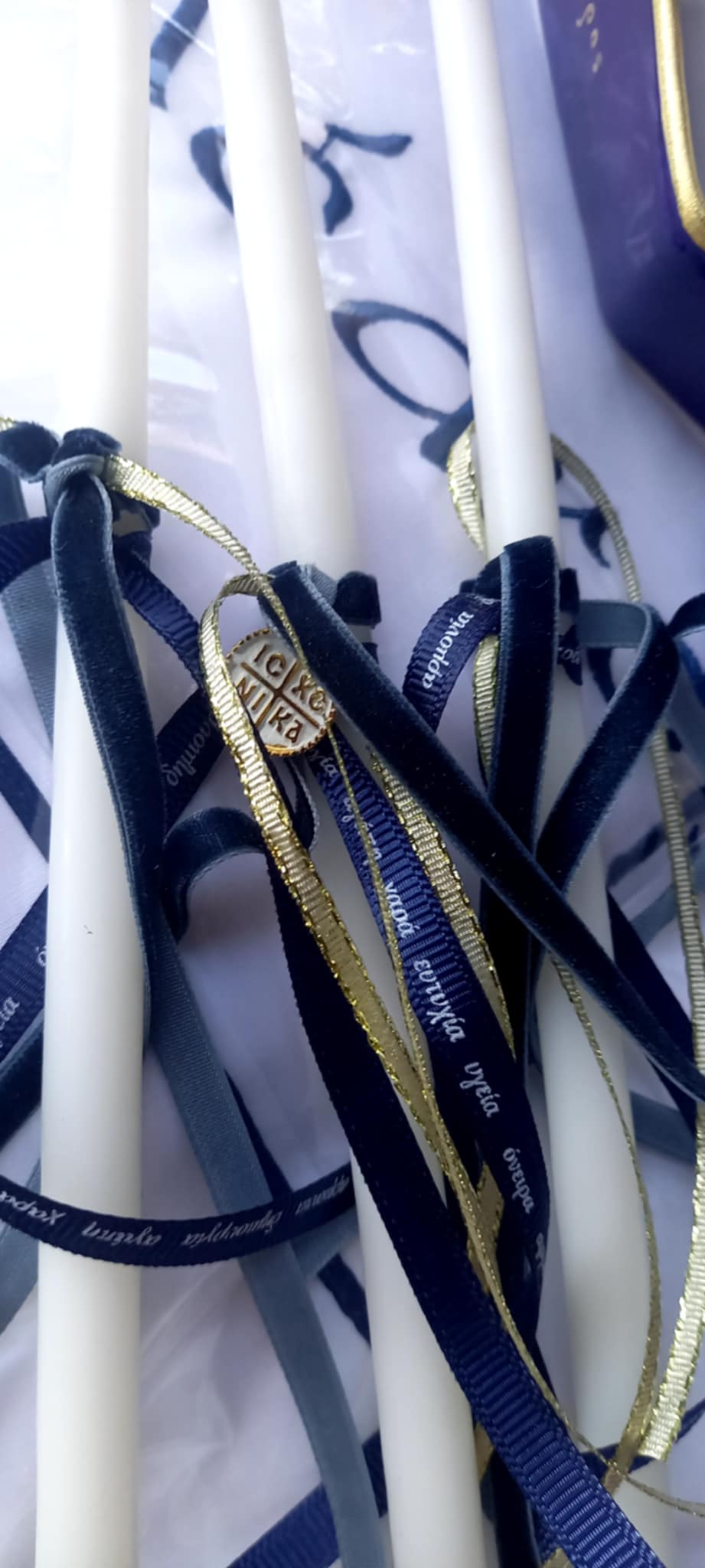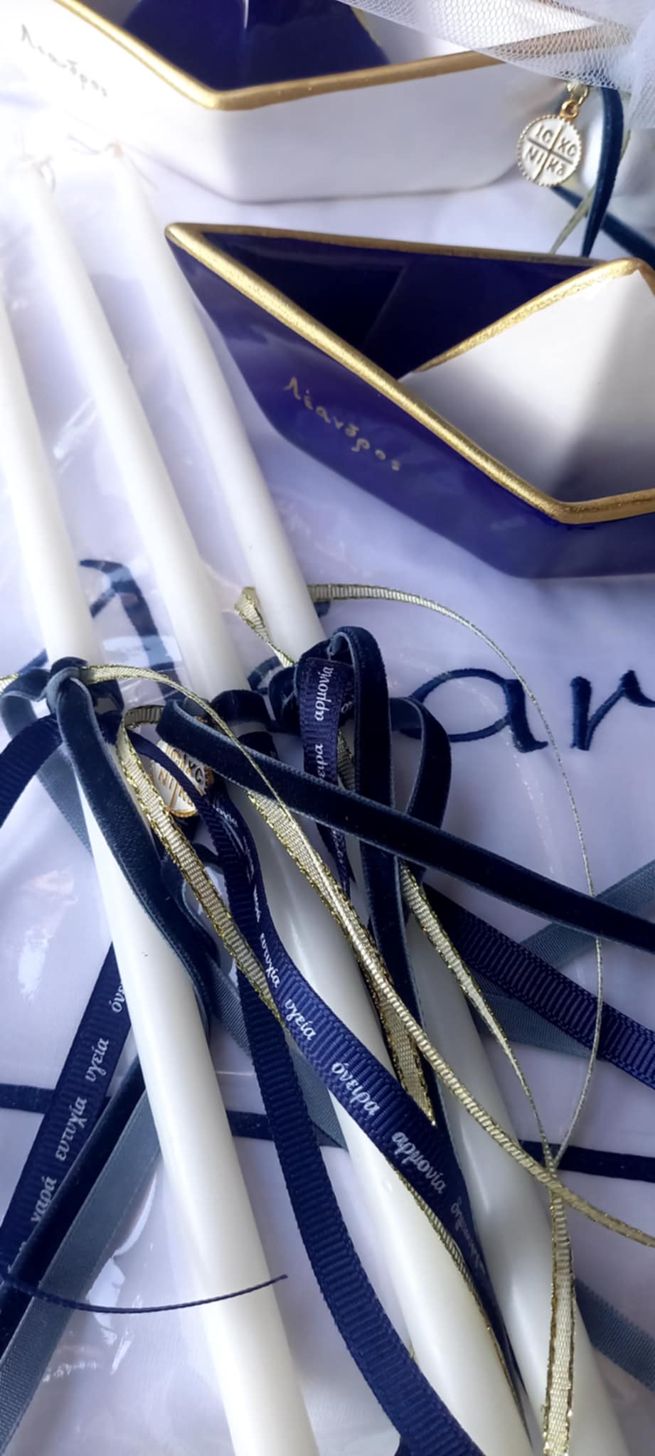 Σετ λαδιού με κωνσταντινάτο φλουρί, βελούδινη μπλε κορδέλα και χρυσή κορδελίτσα.