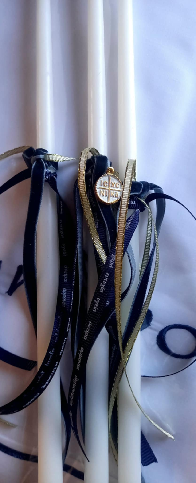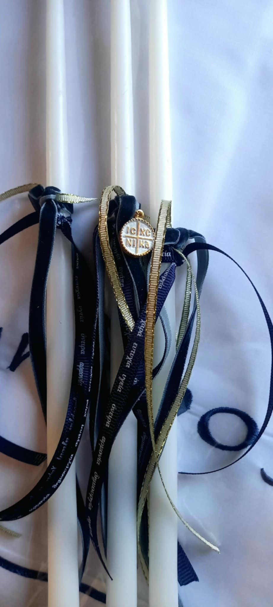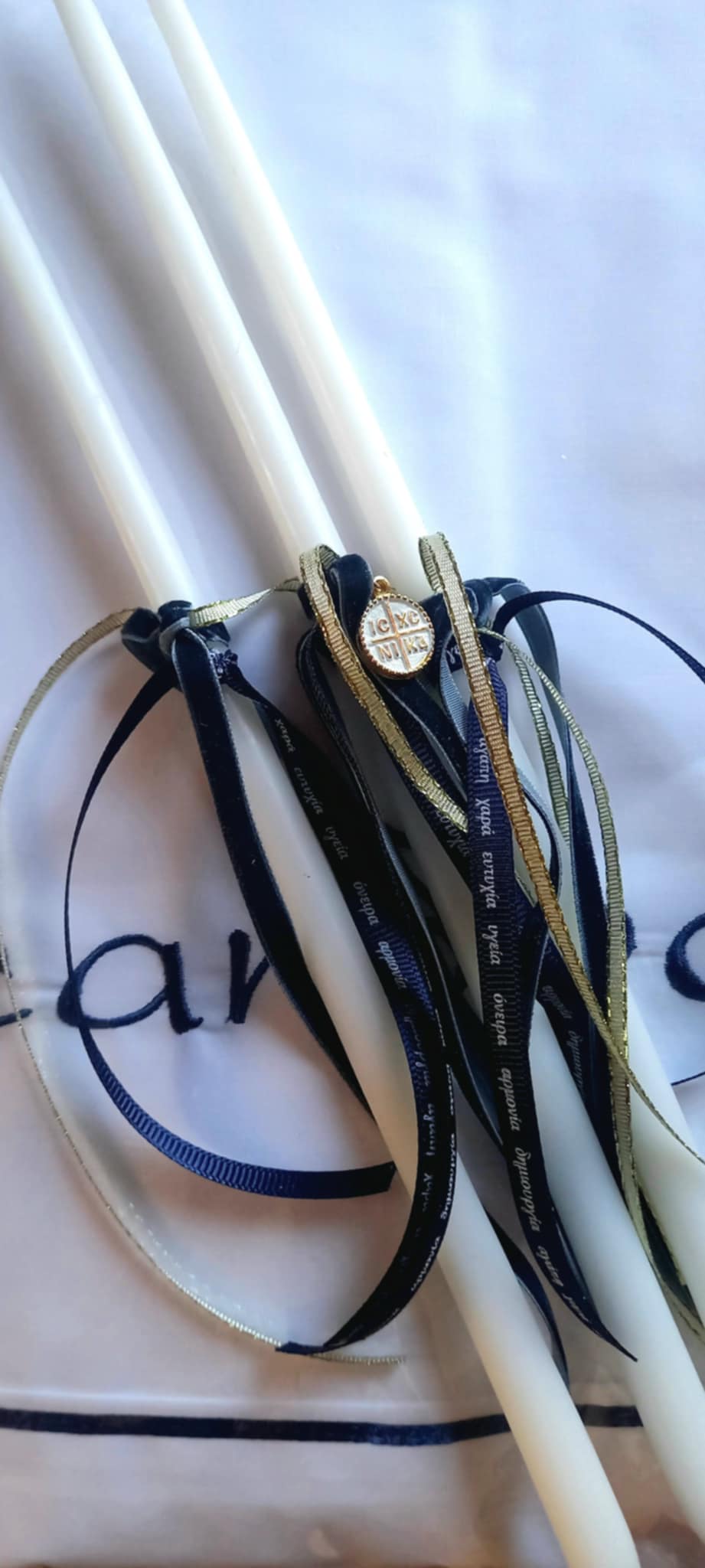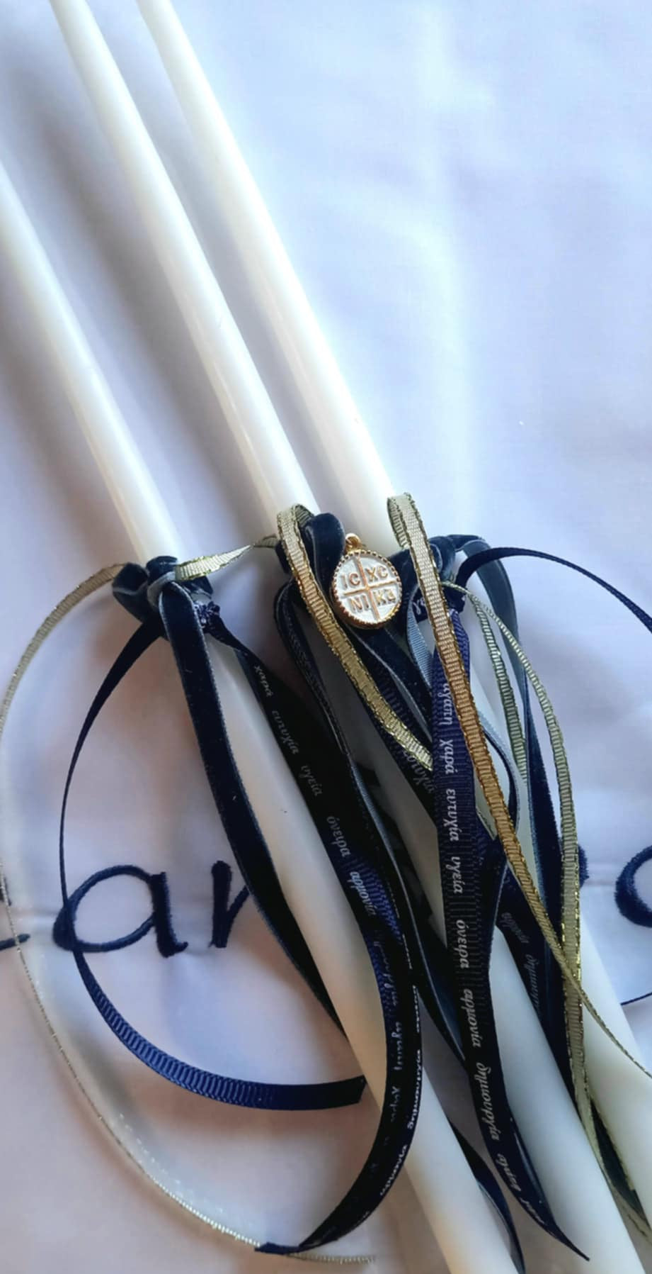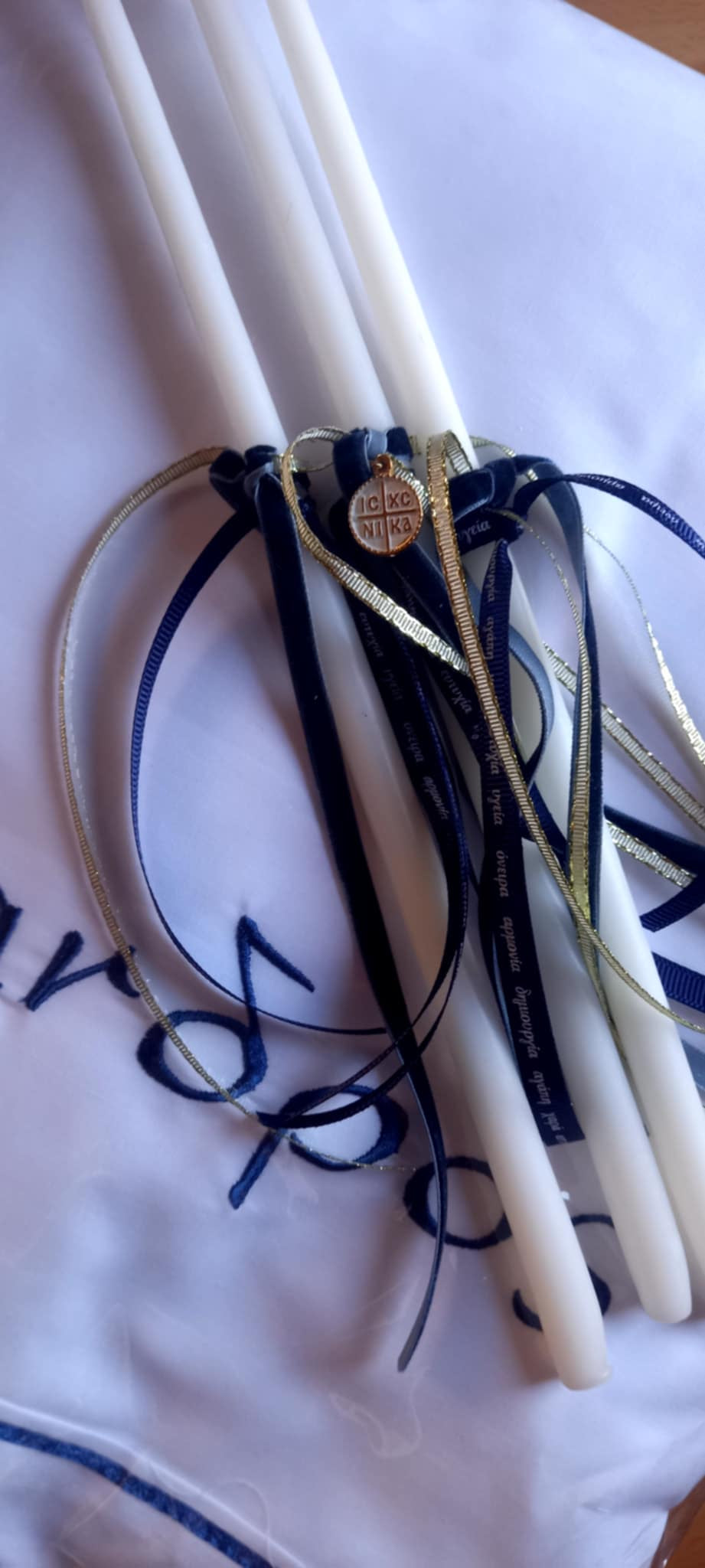 Σετ λαδιού με κωνσταντινάτο φλουρί, βελούδινη μπλε κορδέλα και χρυσή κορδελίτσα.