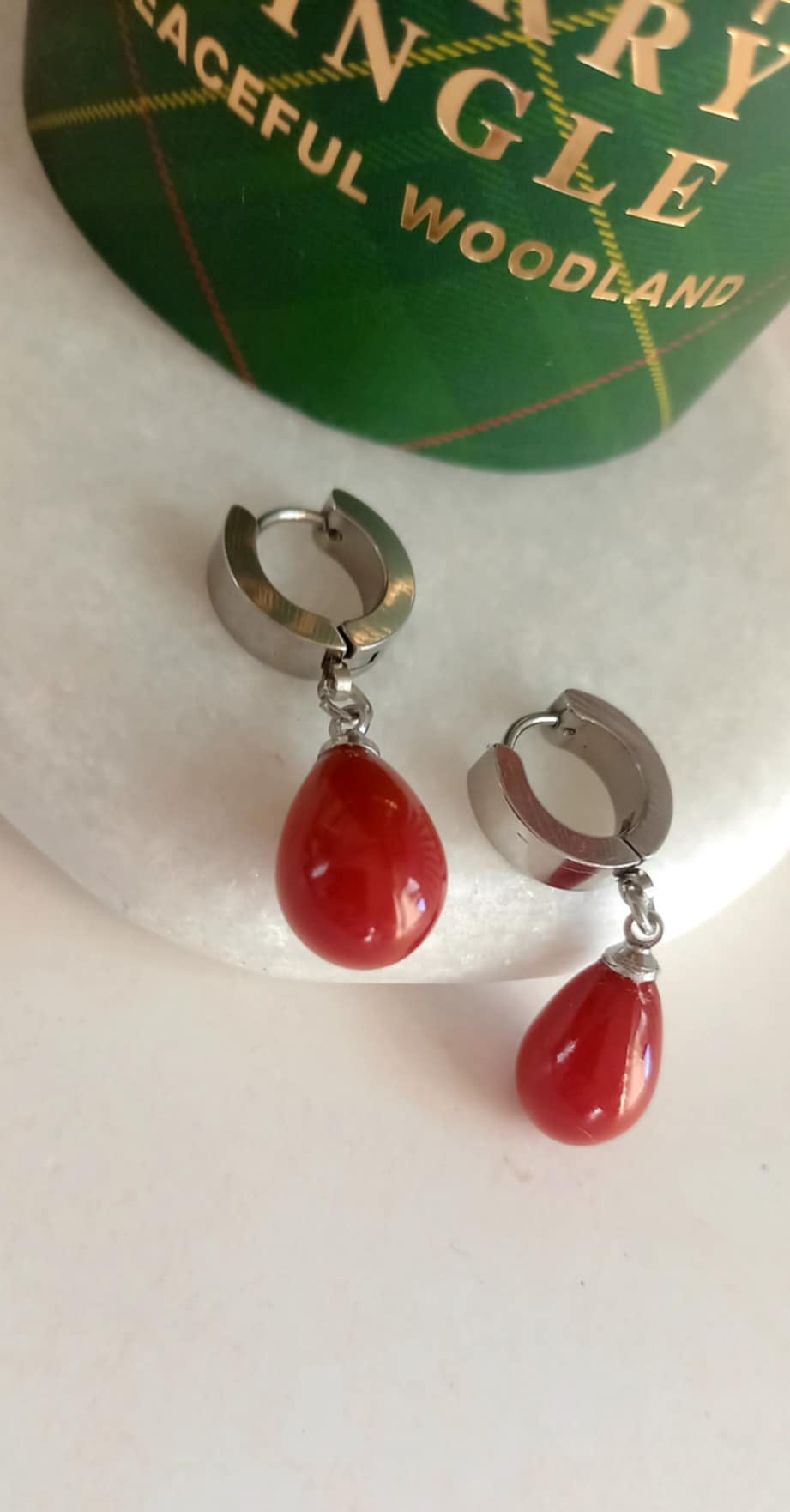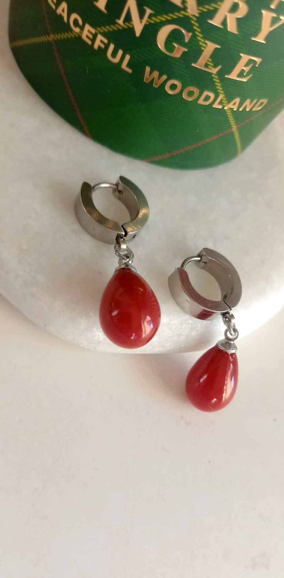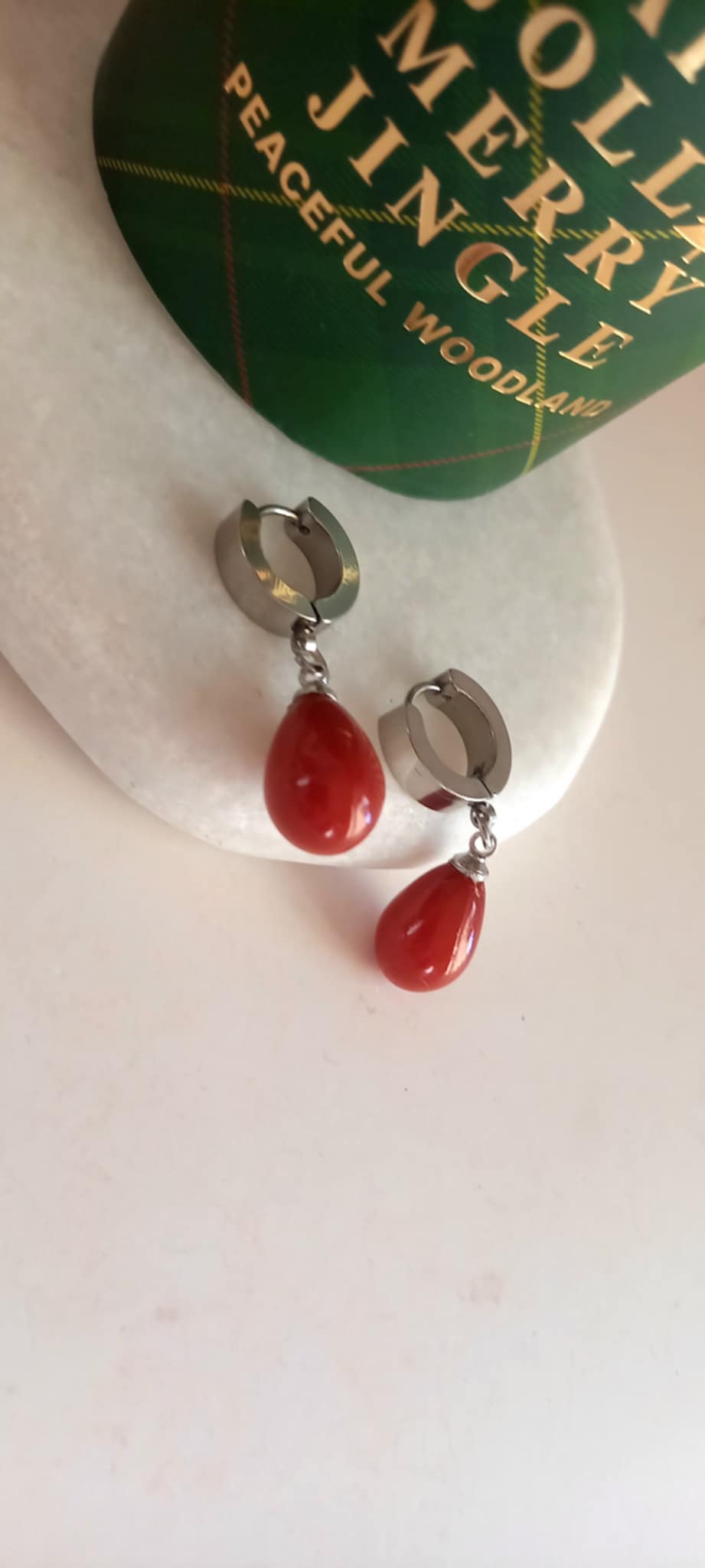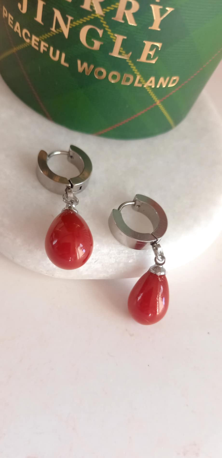 Σκουλαρίκια από ατσάλι με μοτίφ πέρλα σε μπορντώ-κόκκινο χρώμα.