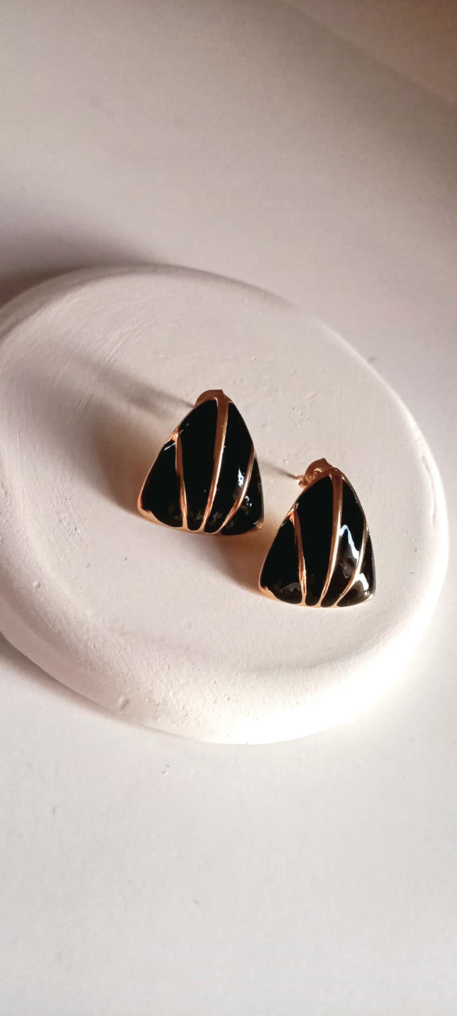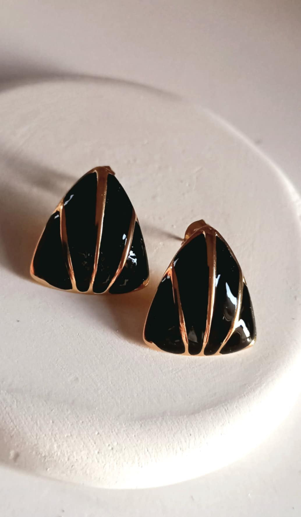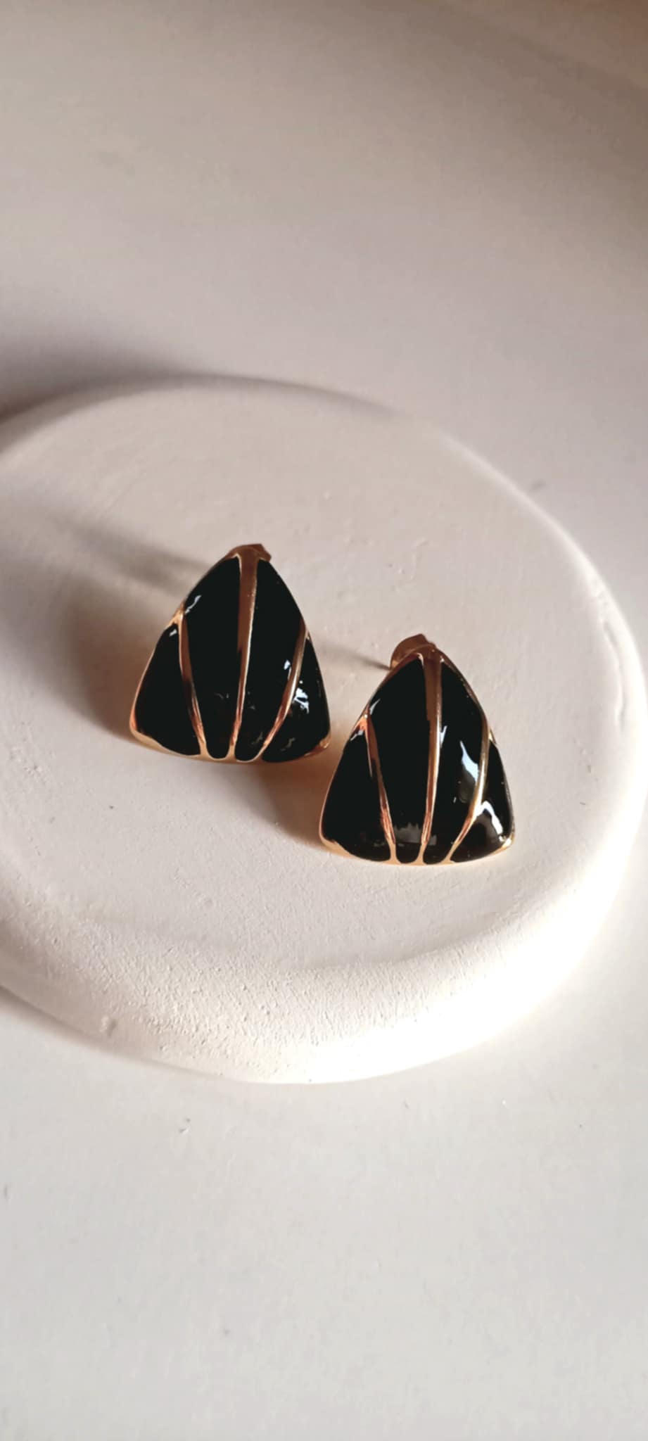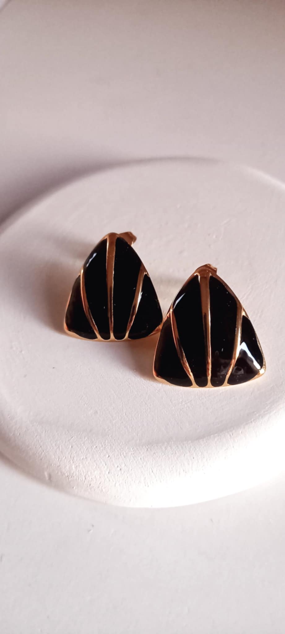 Κομψά σκουλαρίκια από επιχρυσωμένο ατσάλι με σμάλτο σε τριγωνικό σχήμα και μαύρο χρώμα.
