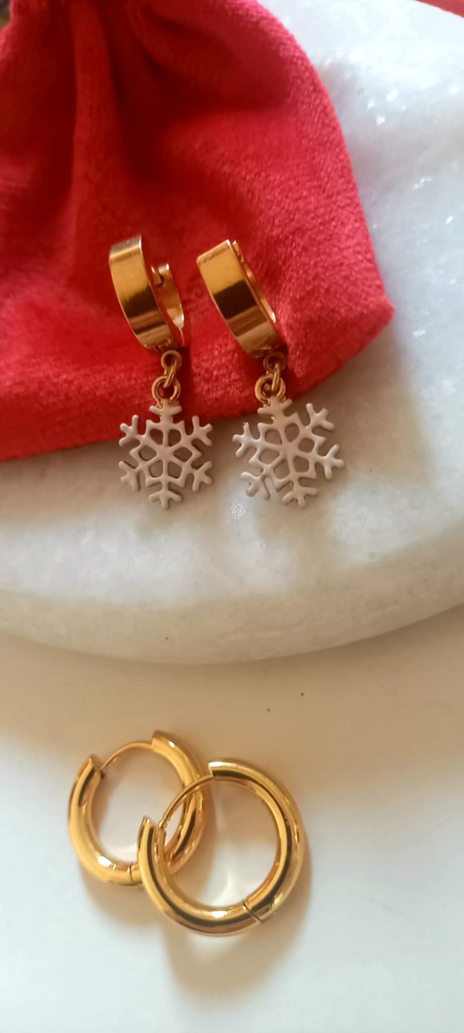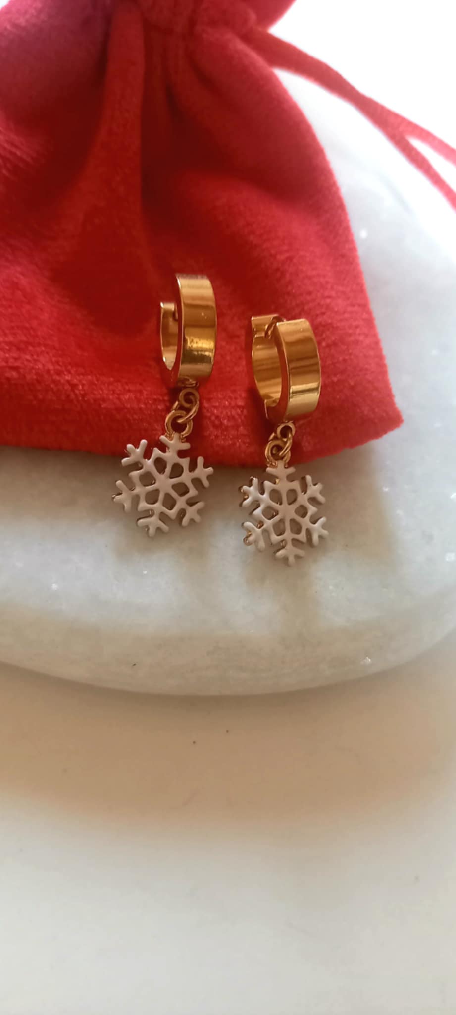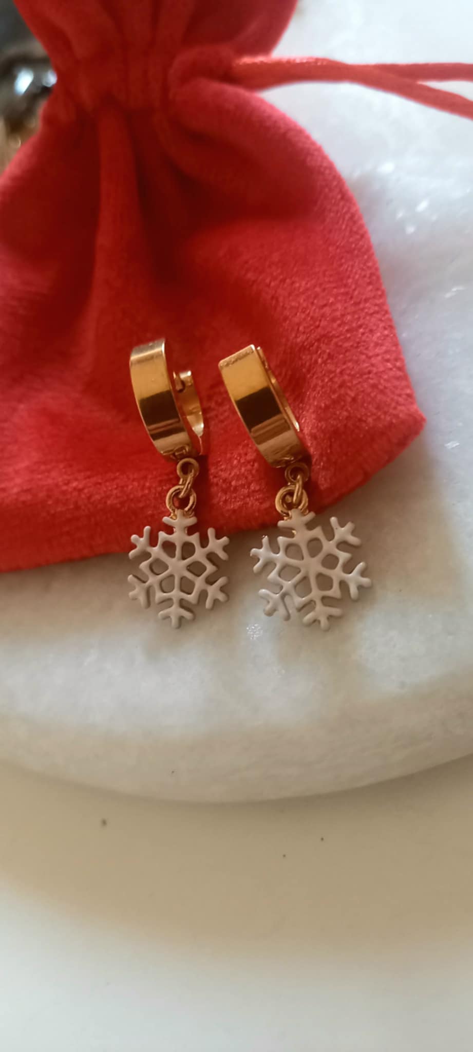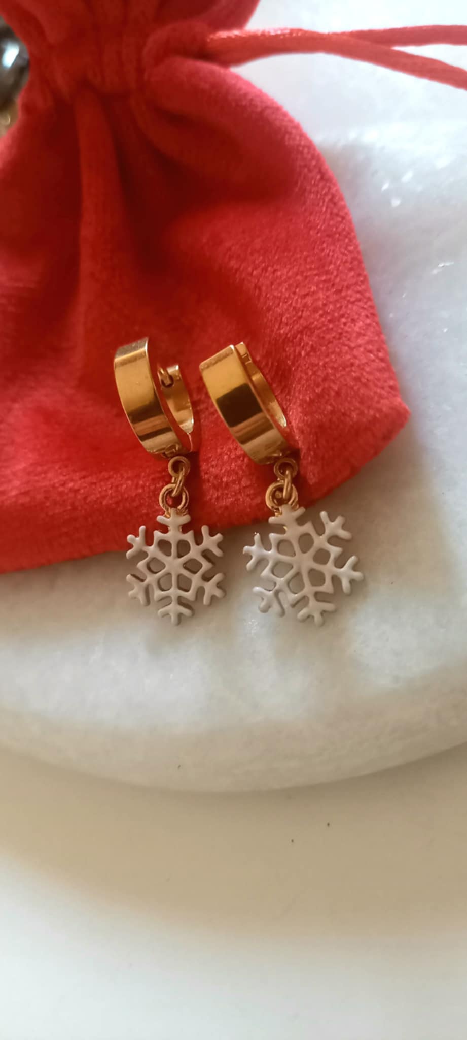 Κομψά ατσάλινα σκουλαρίκια με κρικάκι και επιχρυσωμένο μοτίφ χιονονιφάδα με σμάλτο σε λευκό χρώμα.