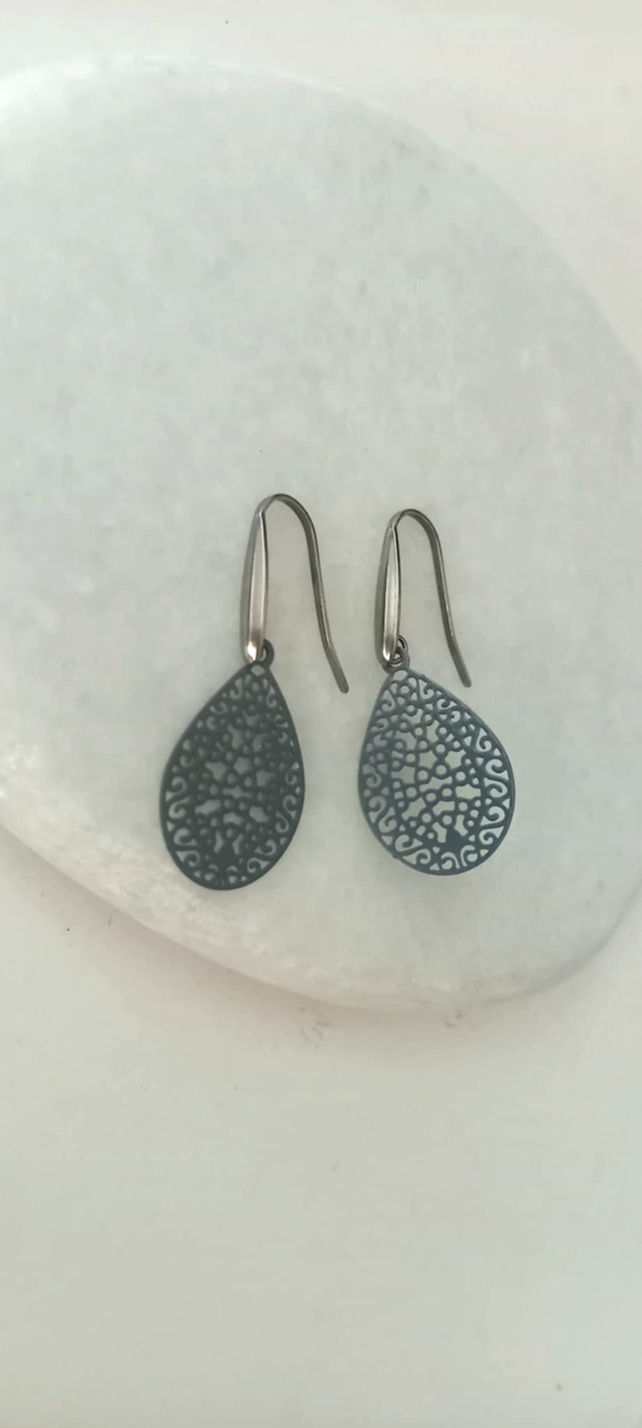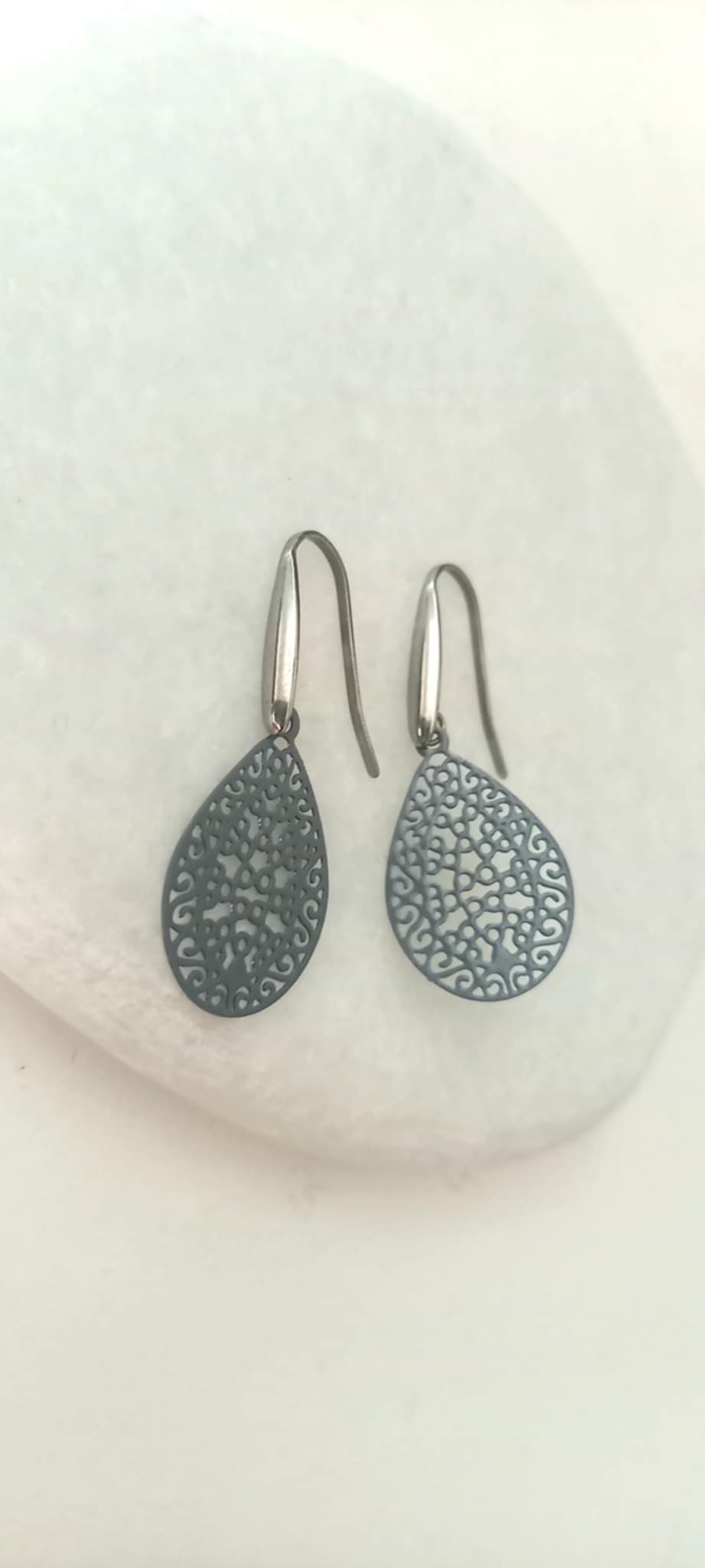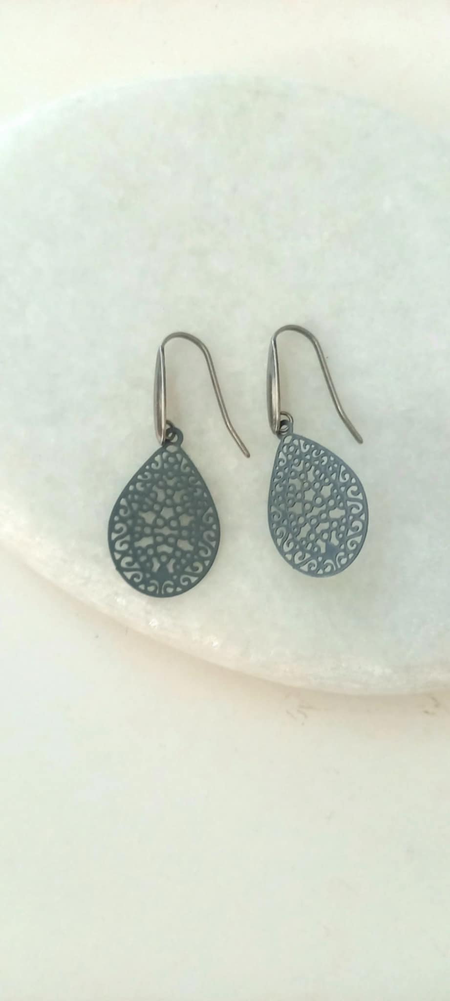 Κομψά κρεμαστά σκουλαρίκια φιλιγκρί σε γκρι απόχρωση. Διαθέσιμα με ασημί ή χρυσό γαντζάκι.