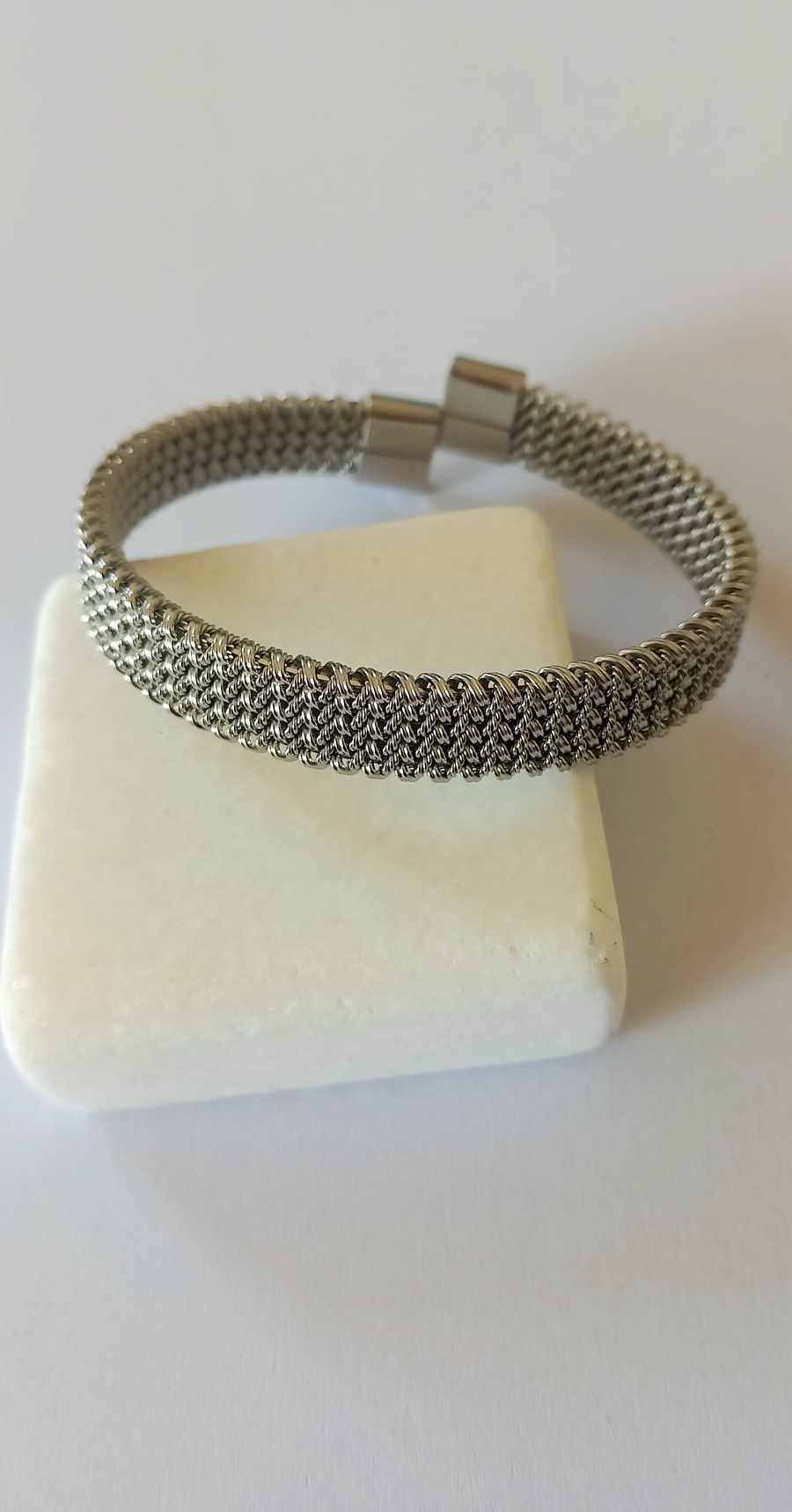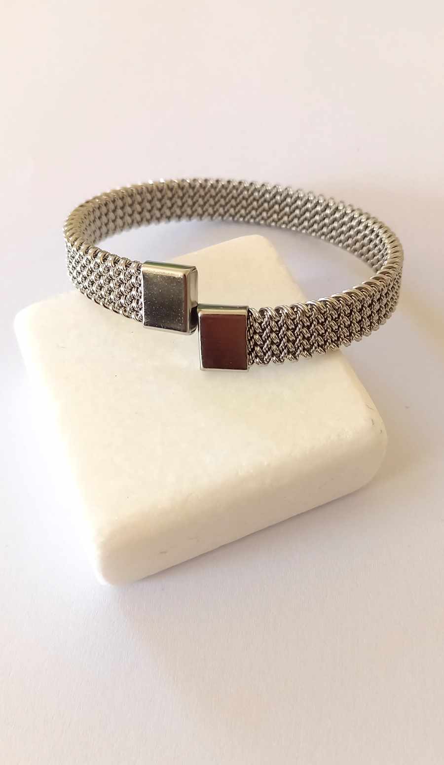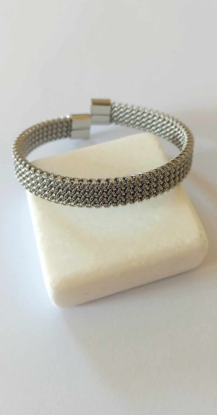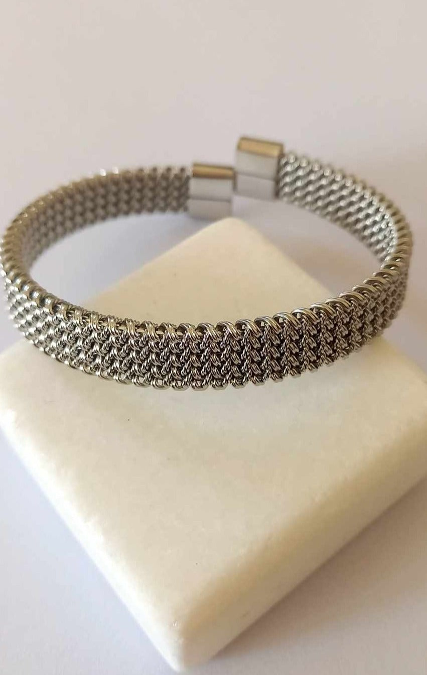 Κομψή χειροπέδα από ατσάλι σε ασημί χρώμα.
