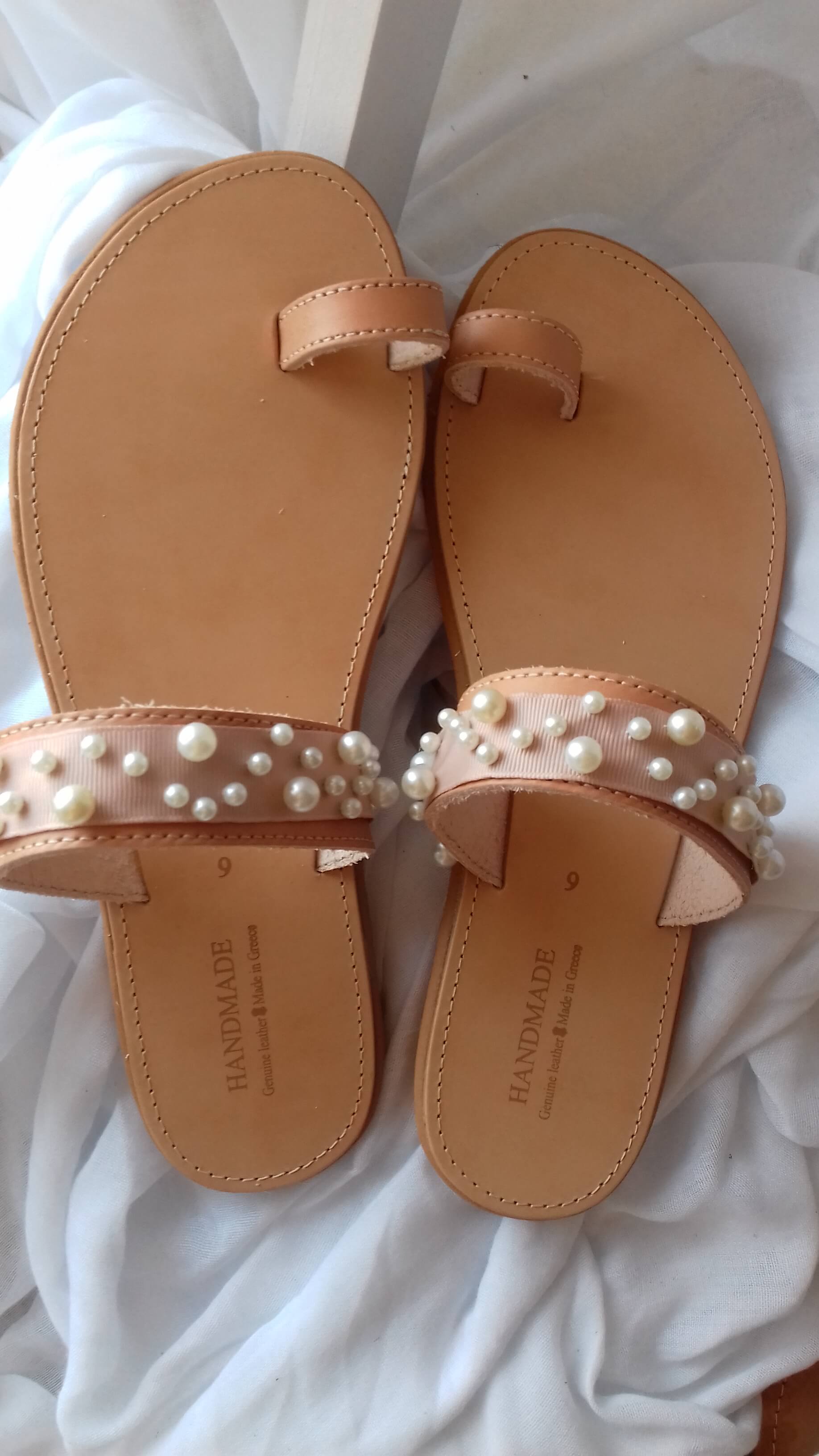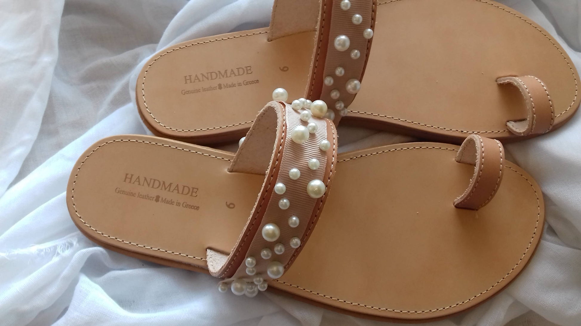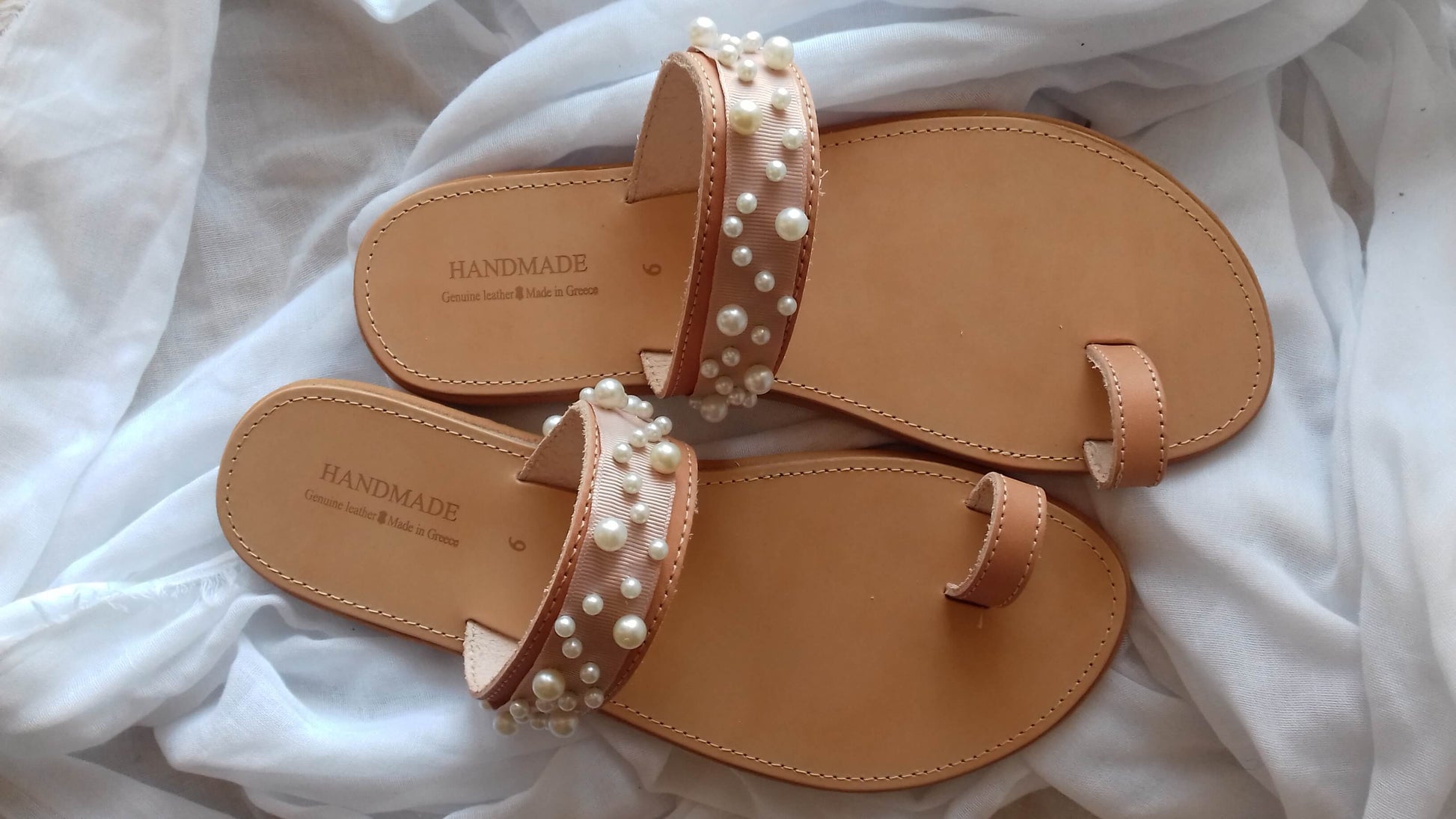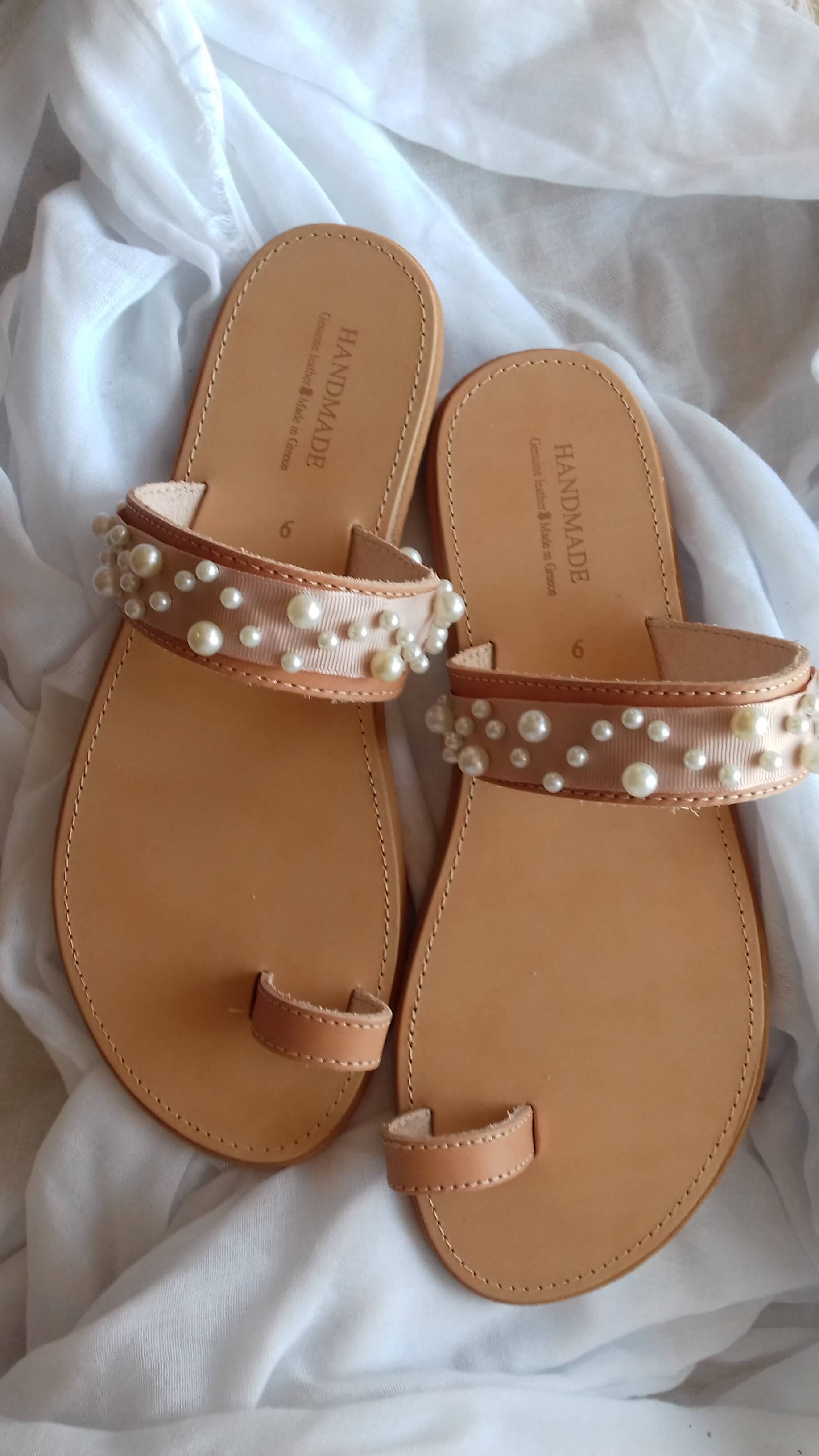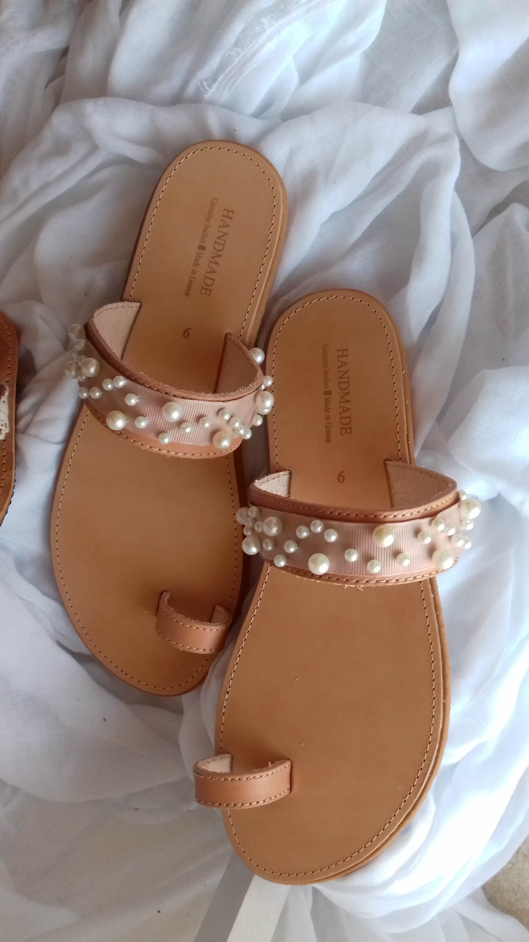 Χειροποίητα δερμάτινα γυναικεία σανδάλια με πέρλες. Κομψά και ουδέτερα, θα τα συνδυάσετε με όλα σας τα καλοκαιρινά σύνολα!