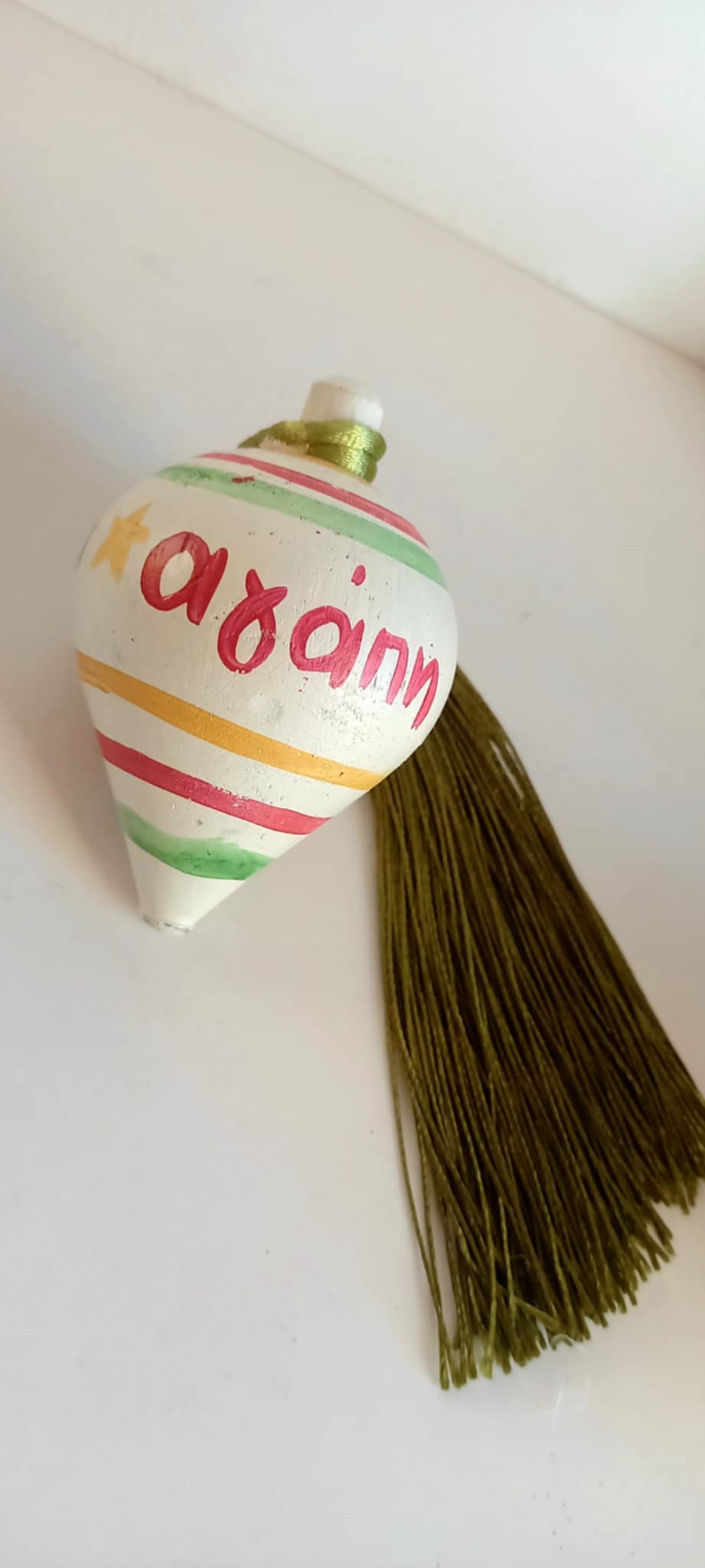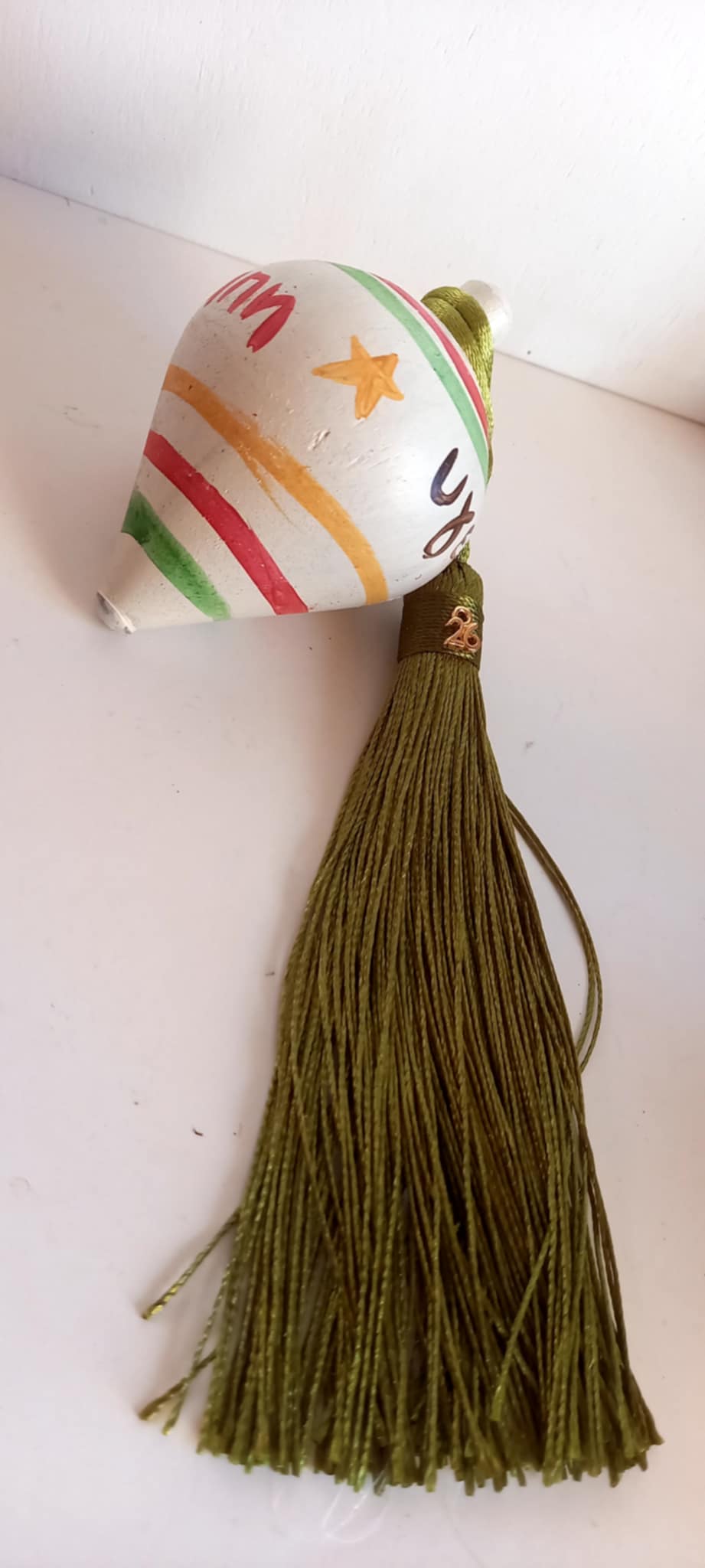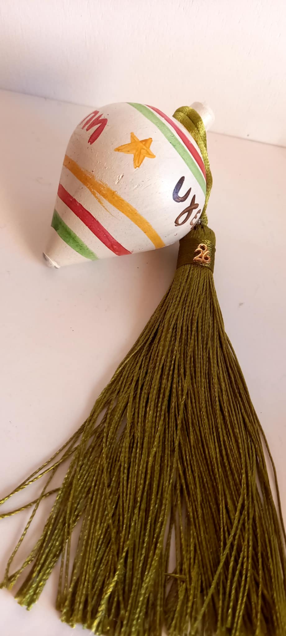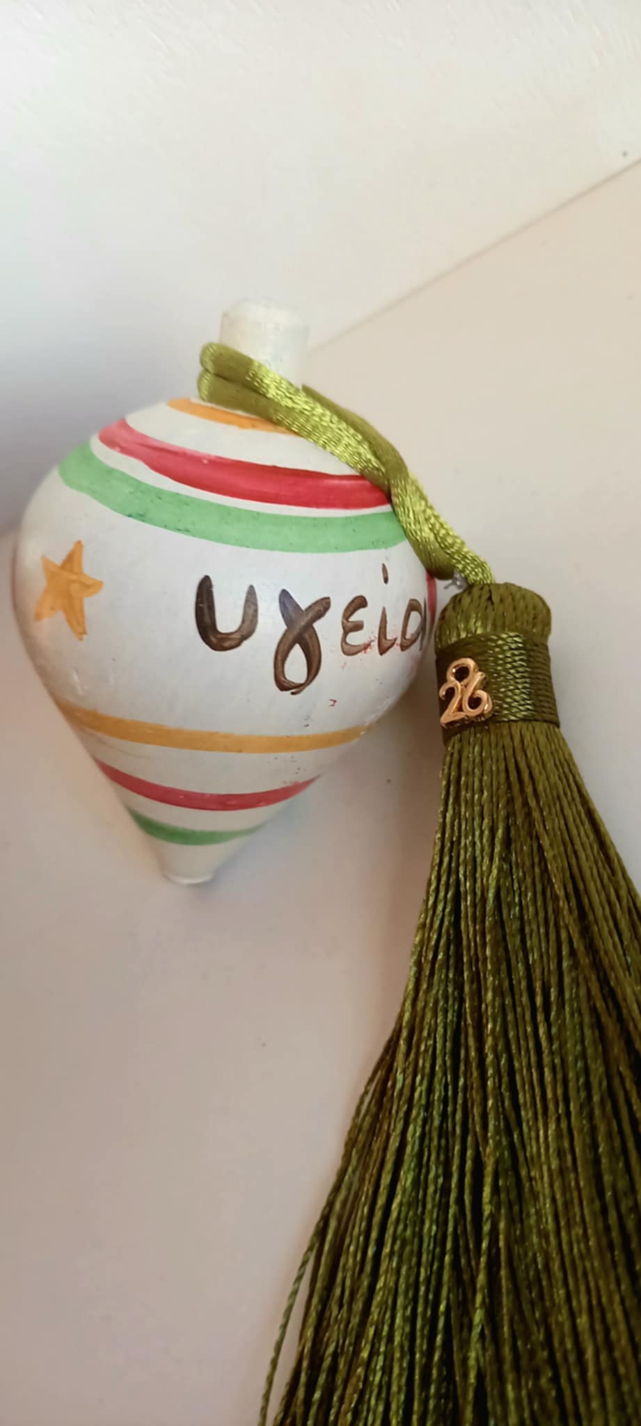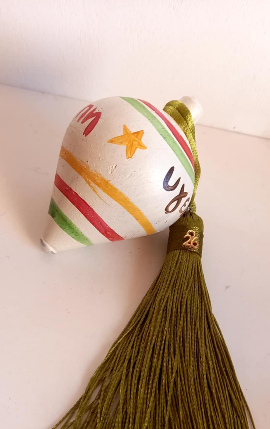 Σβούρα γούρι 2026 ζωγραφισμένη στο χέρι με τις ευχές "Αγάπη" και "υγεία" και μεγάλη φούντα σε πράσινο χρώμα.