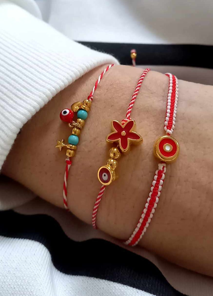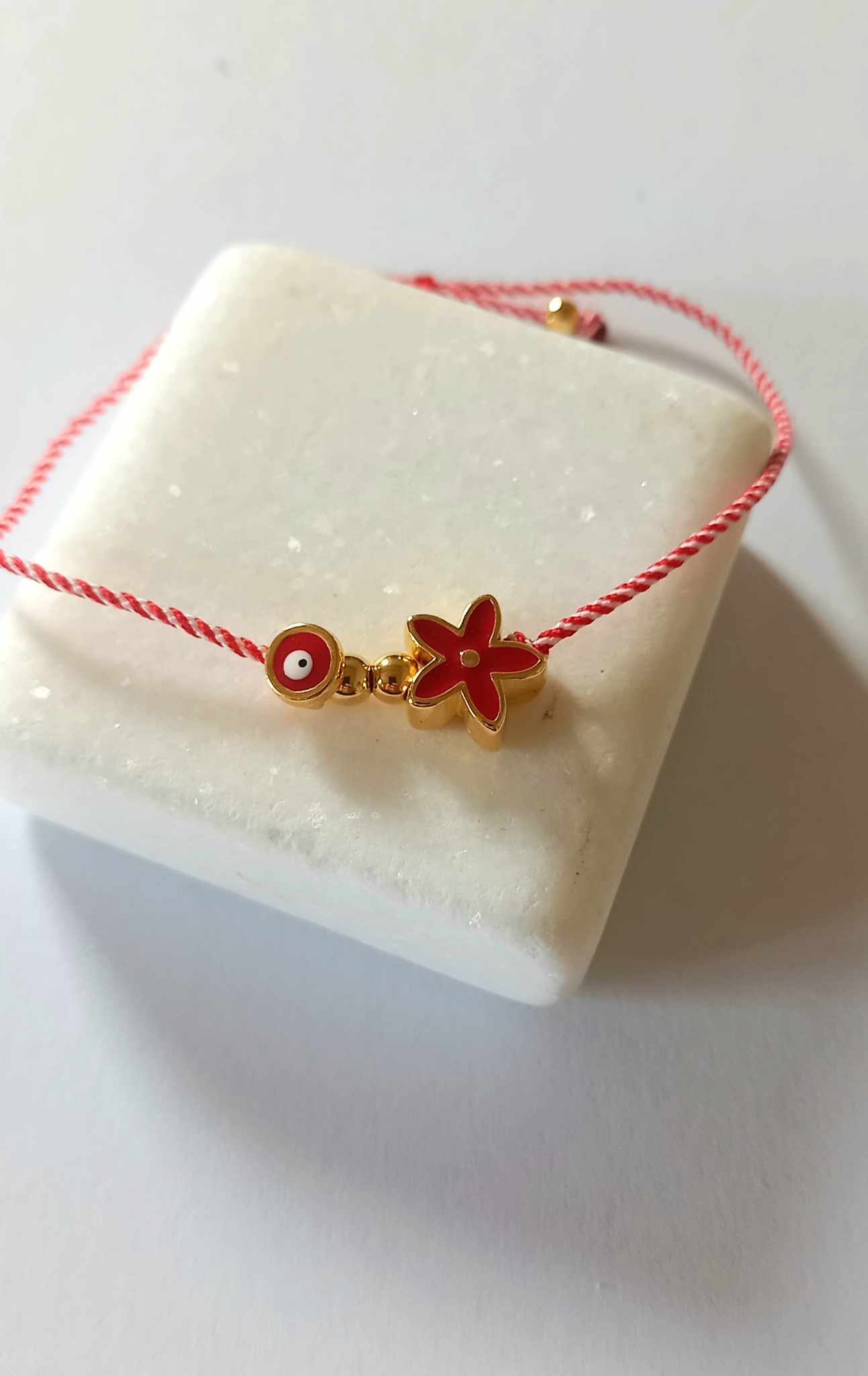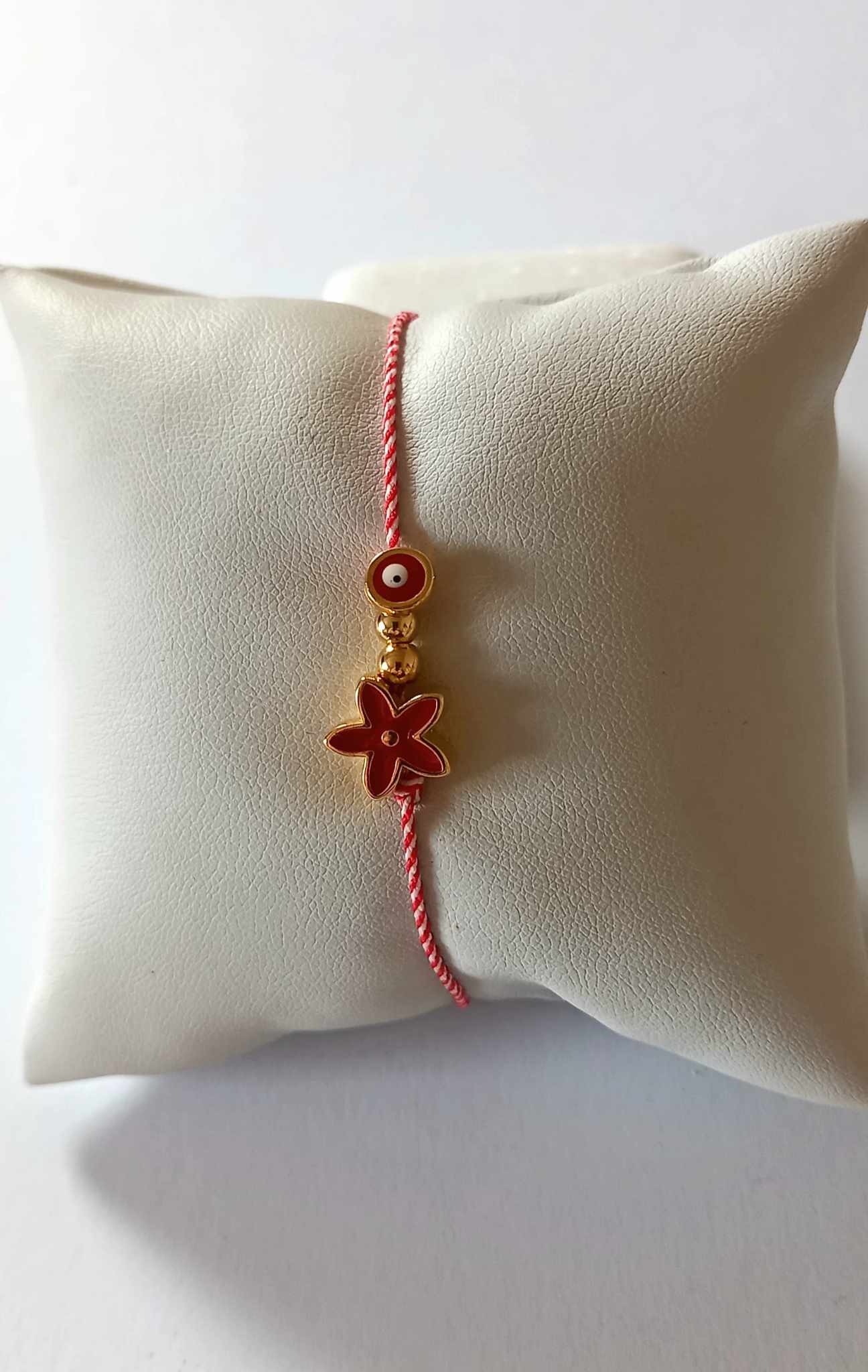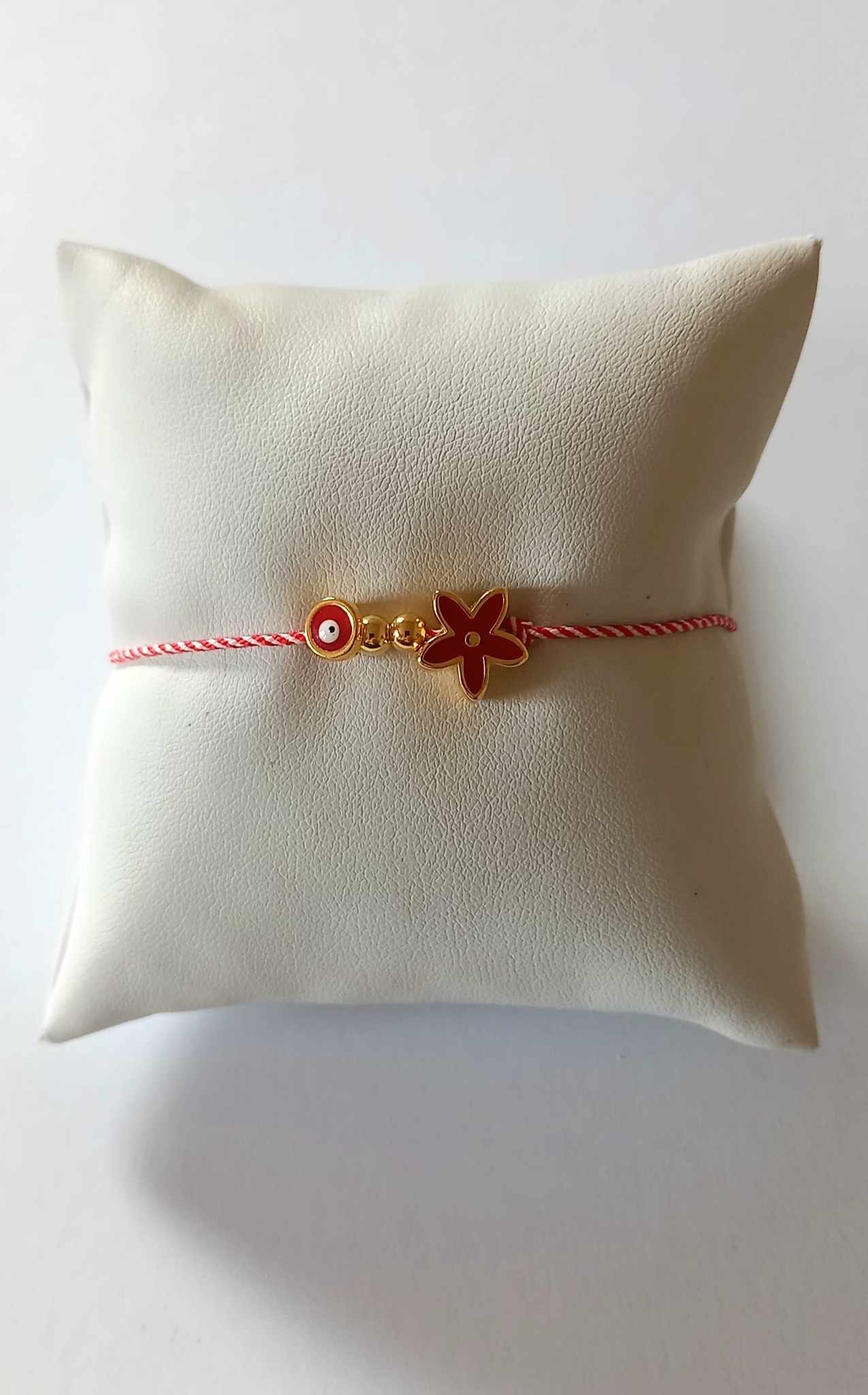 Χειροποίητο βραχιόλι μαρτάκι με λευκό - κόκκινο κορδόνι, επιχρυσωμένο στοιχείο λουλούδι με σμάλτο σε κόκκινο χρώμα και ματάκι στην ίδια απόχρωση.