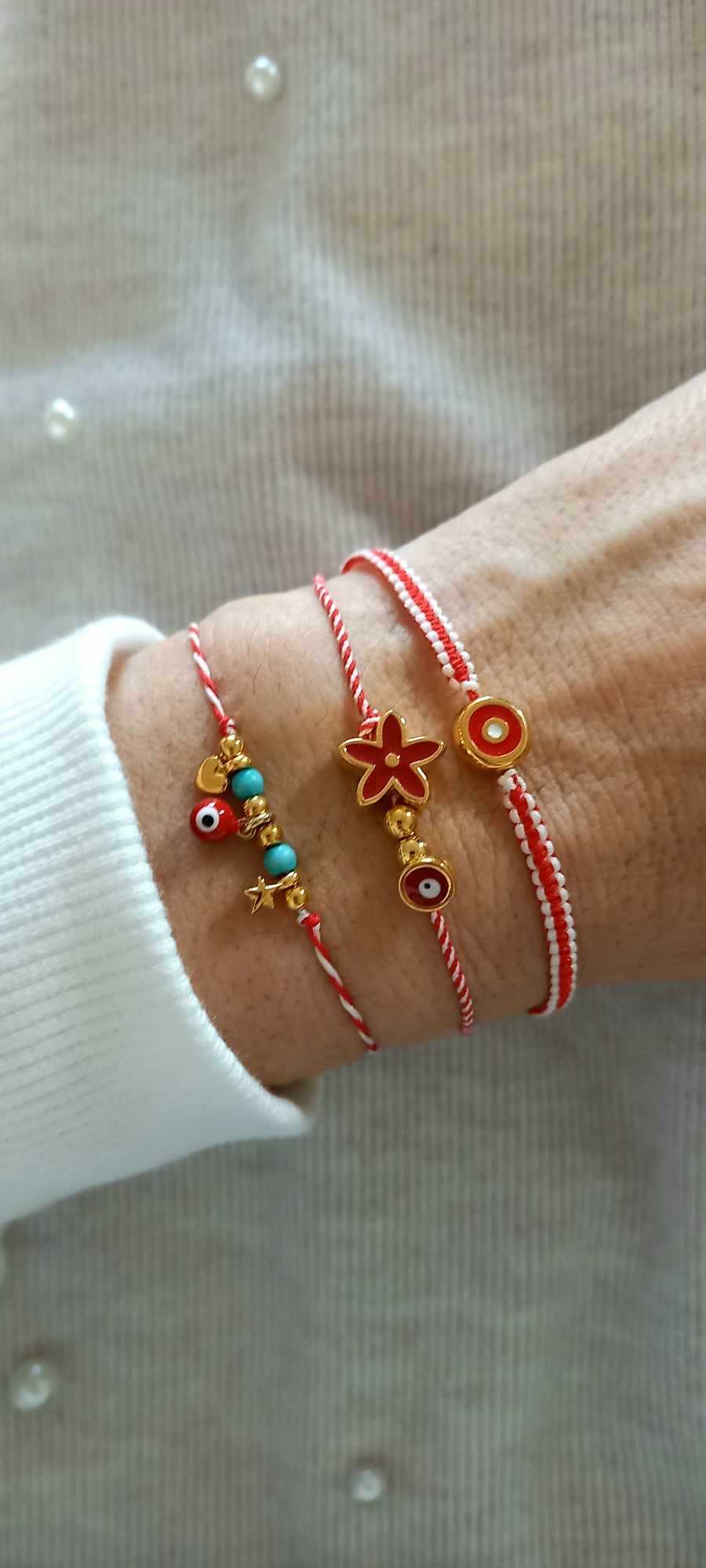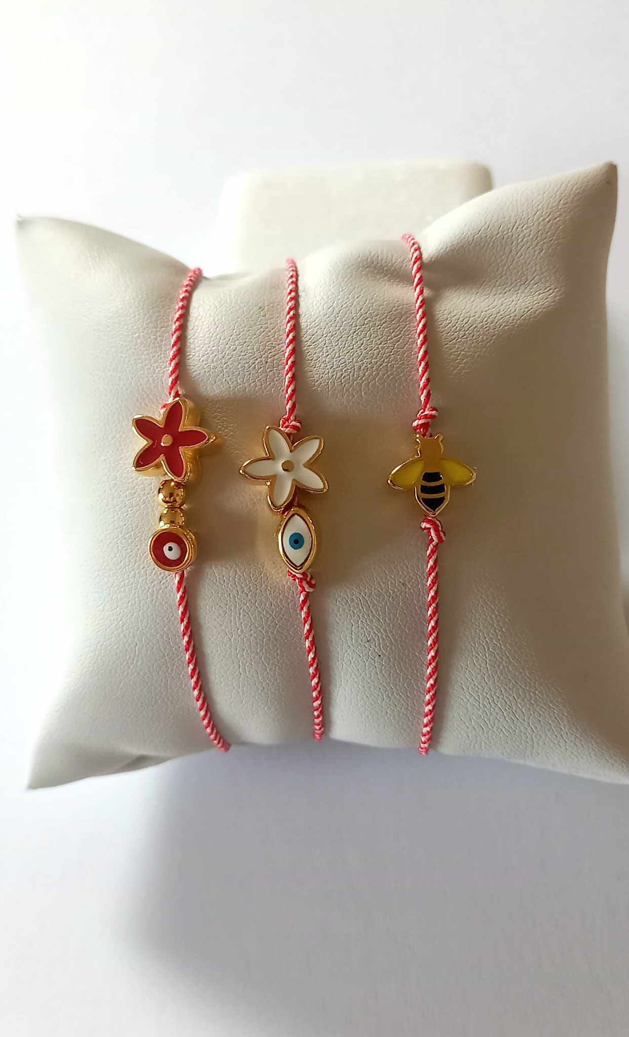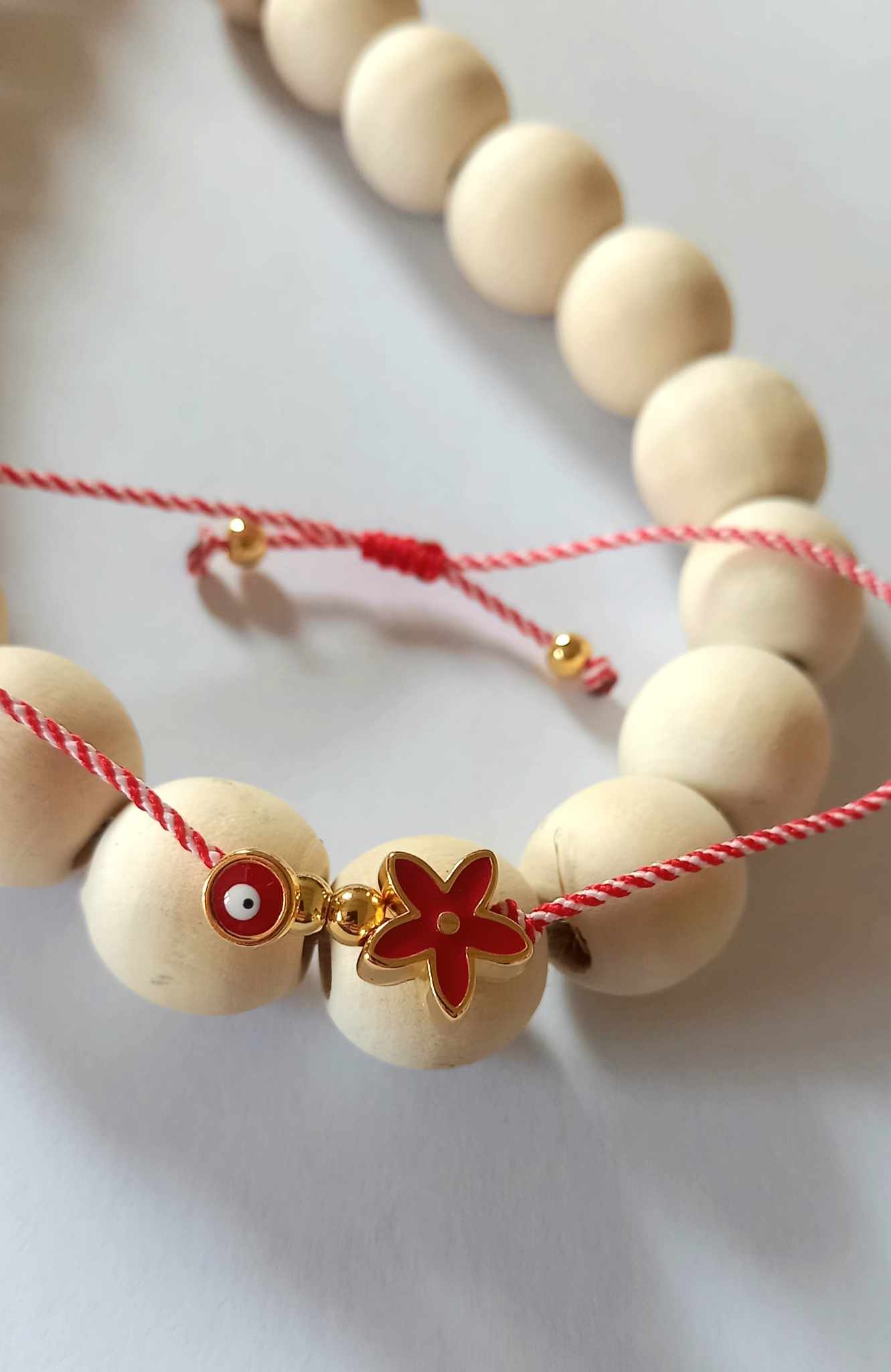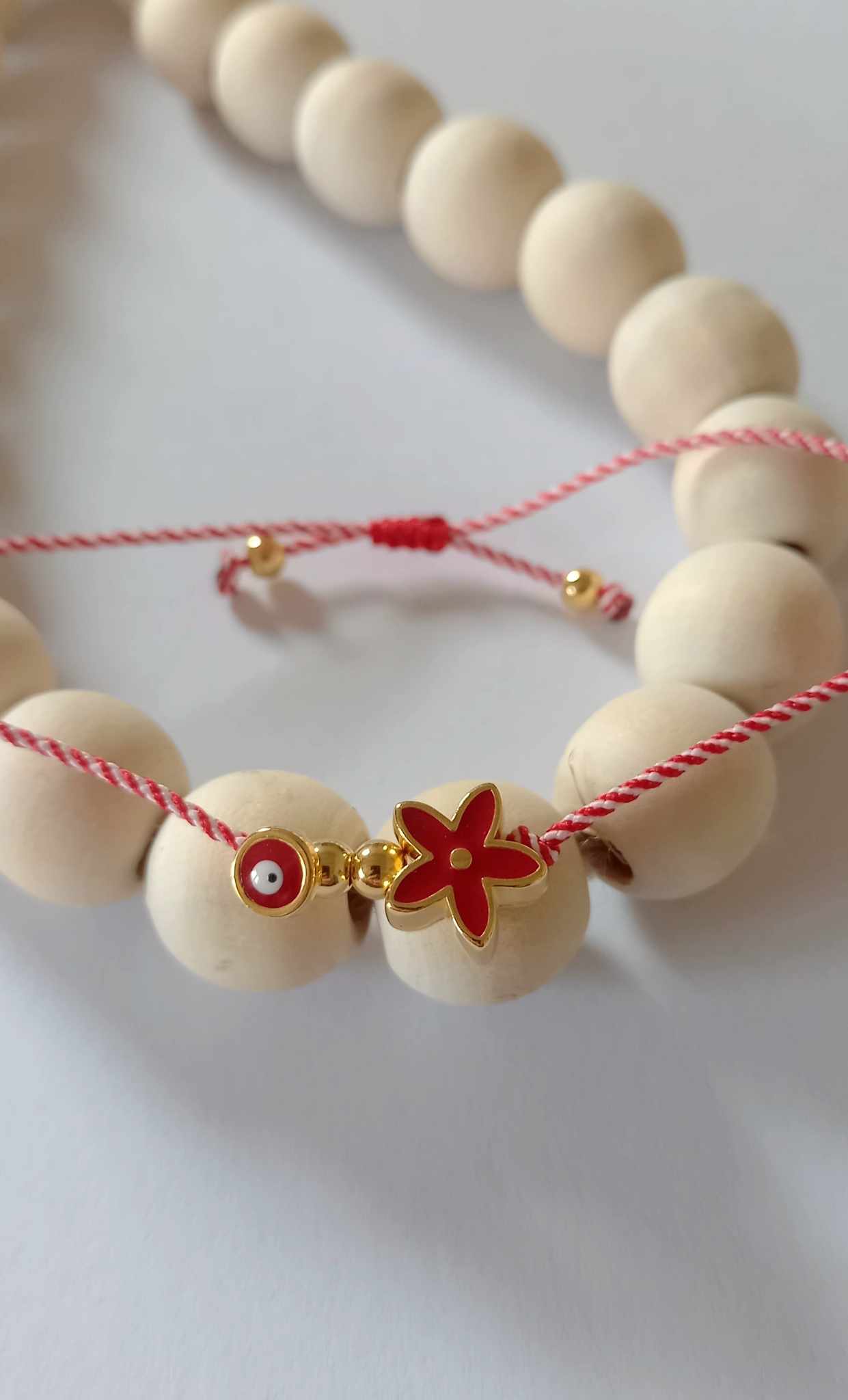 Χειροποίητο βραχιόλι μαρτάκι με λευκό - κόκκινο κορδόνι, επιχρυσωμένο στοιχείο λουλούδι με σμάλτο σε κόκκινο χρώμα και ματάκι στην ίδια απόχρωση.