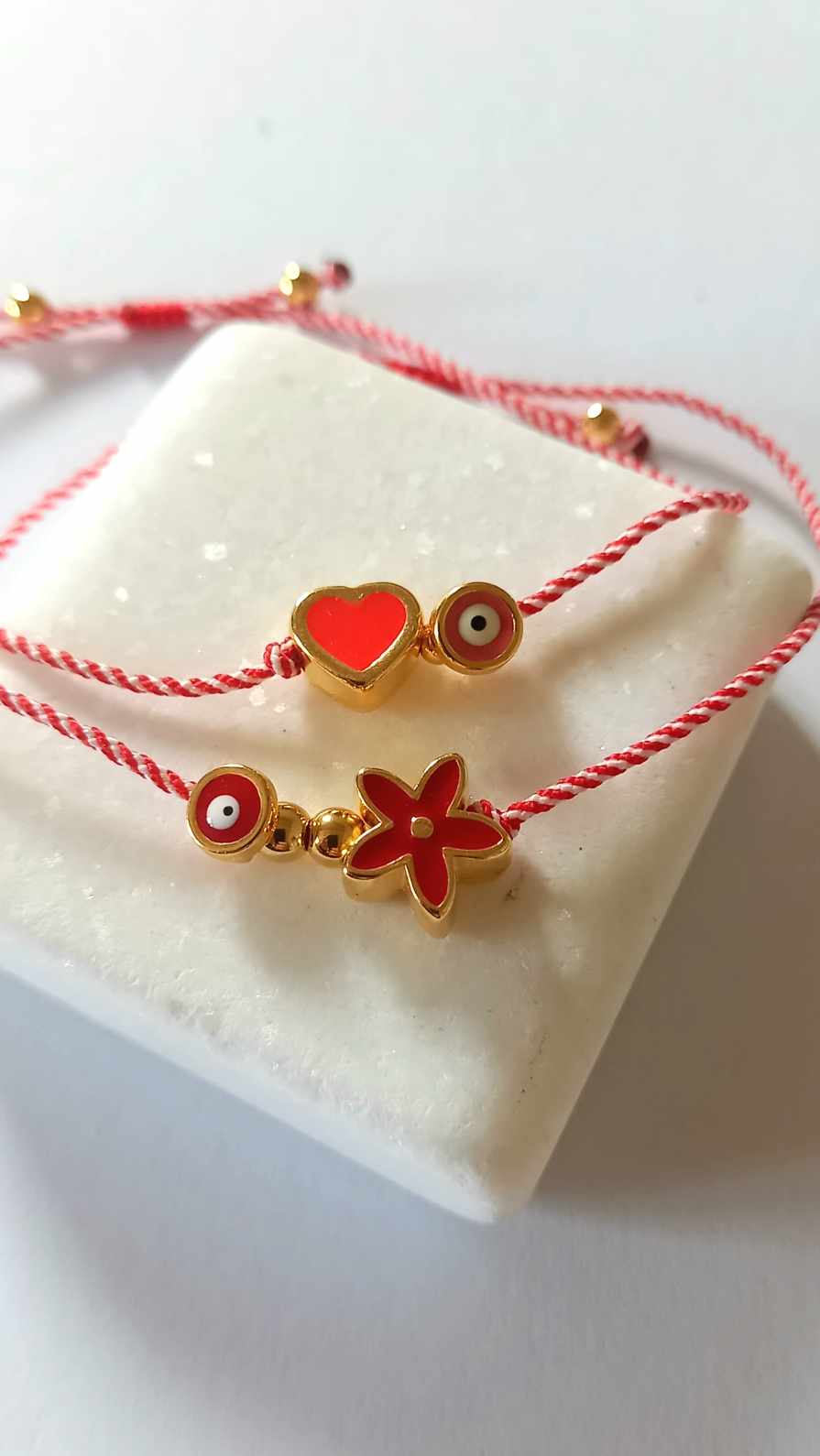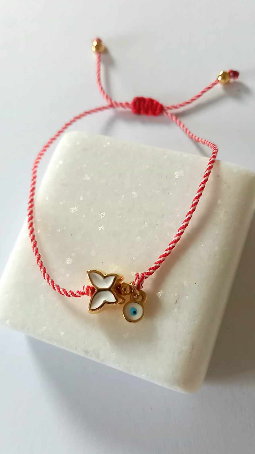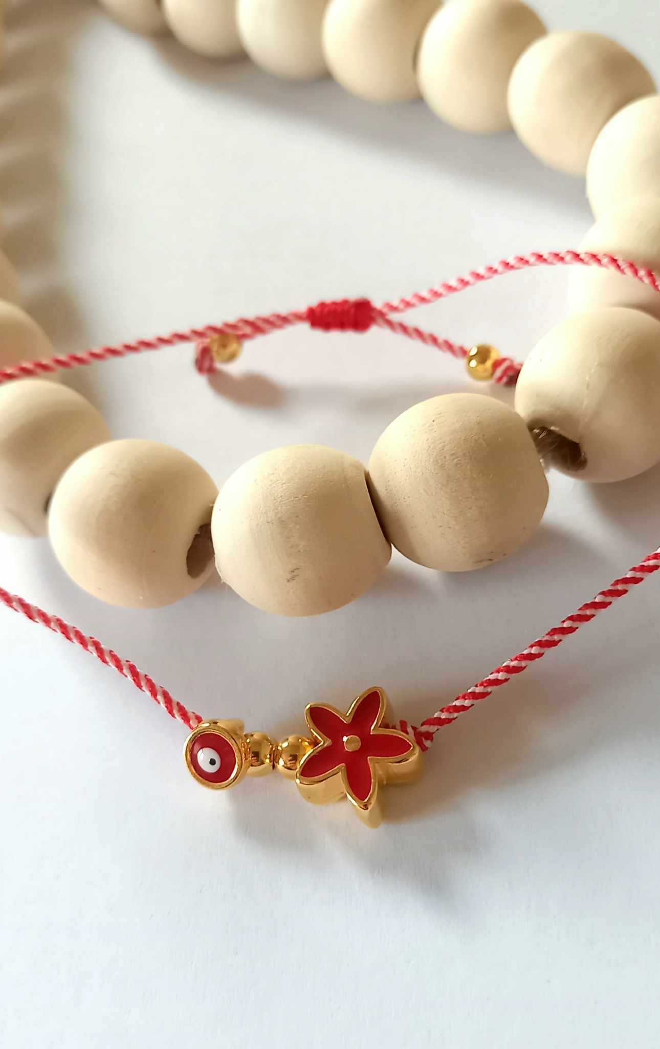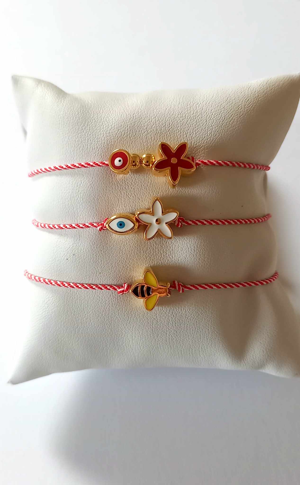Χειροποίητο βραχιόλι μαρτάκι με λευκό - κόκκινο κορδόνι, επιχρυσωμένο στοιχείο λουλούδι με σμάλτο σε κόκκινο χρώμα και ματάκι στην ίδια απόχρωση.