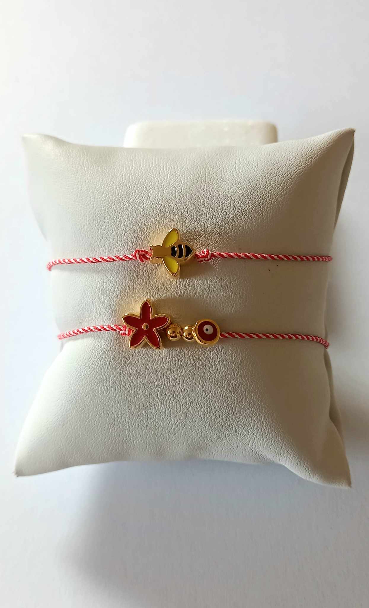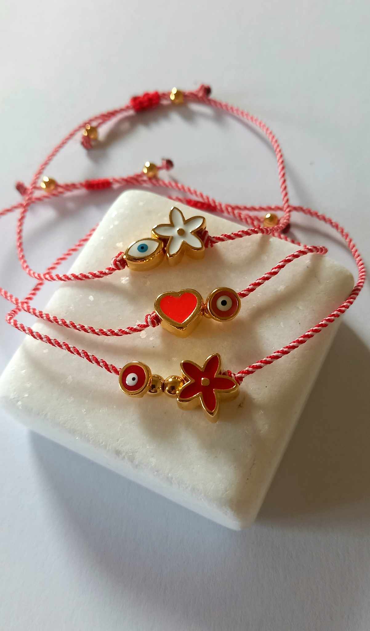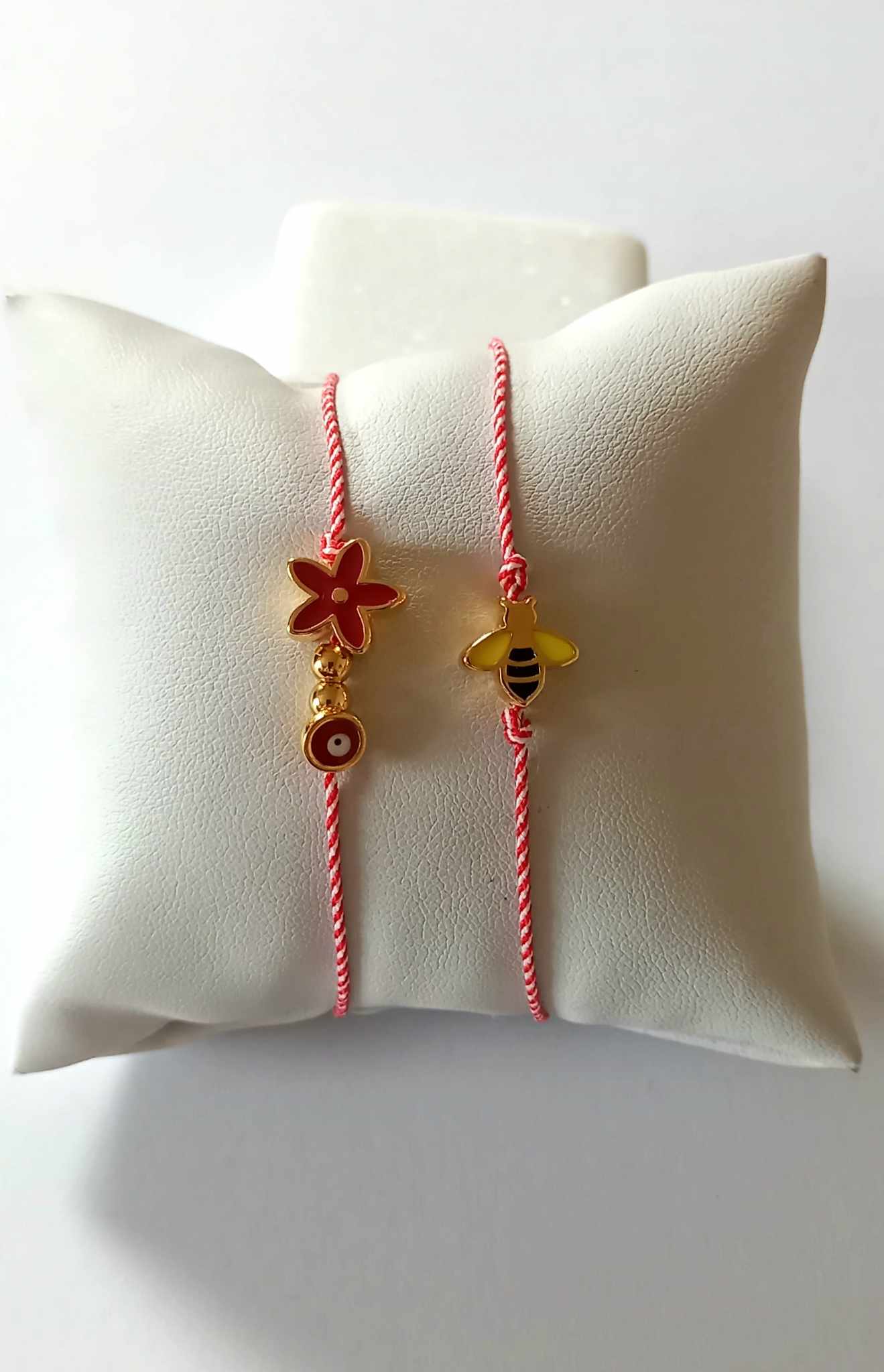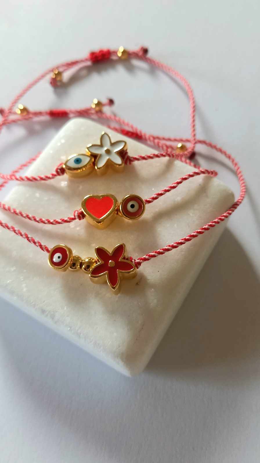 Χειροποίητο βραχιόλι μαρτάκι με λευκό - κόκκινο κορδόνι, επιχρυσωμένο στοιχείο λουλούδι με σμάλτο σε κόκκινο χρώμα και ματάκι στην ίδια απόχρωση.