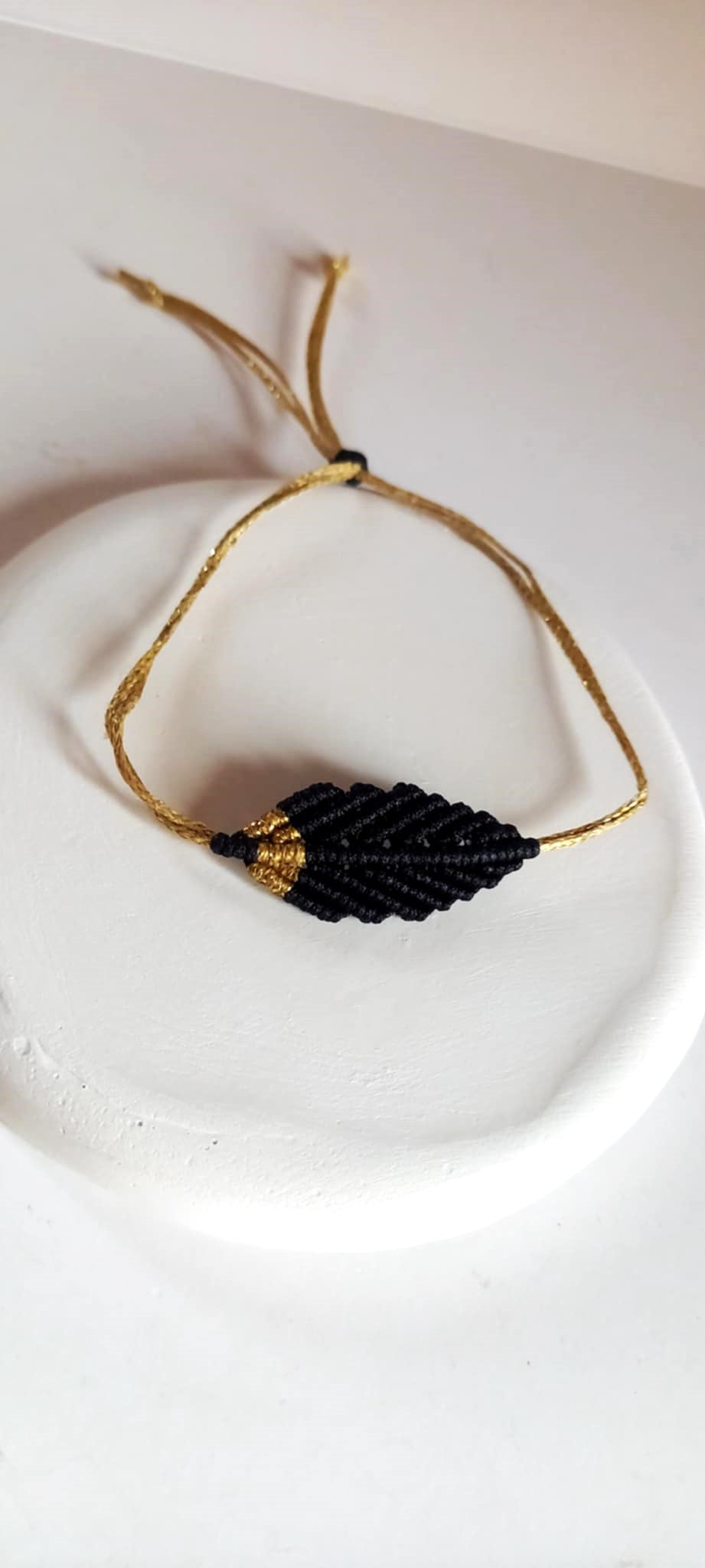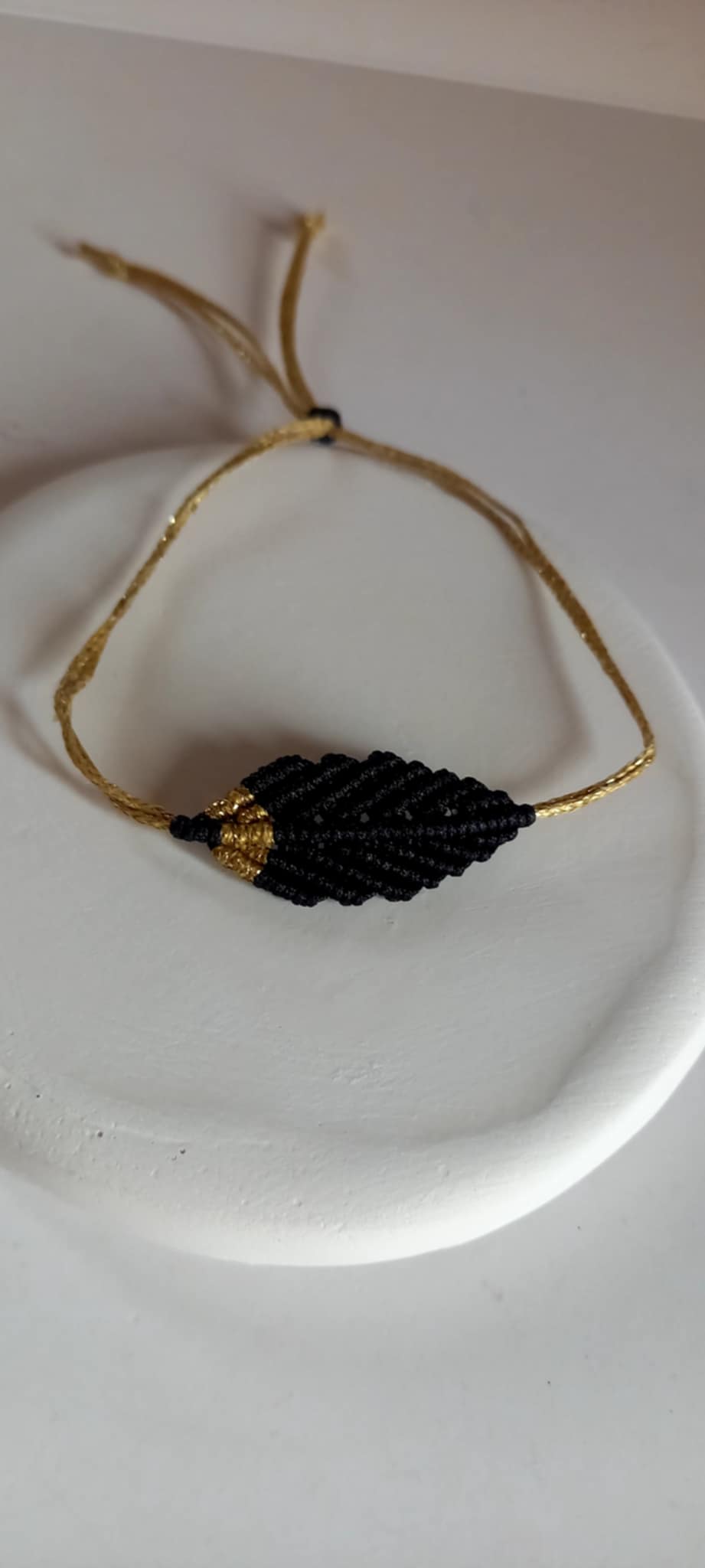 Χειροποίητο βραχιόλι με κερωμένο κορδόνι σε χρυσό χρώμα και μακραμέ φύλλο σε δύο χρώματα.
