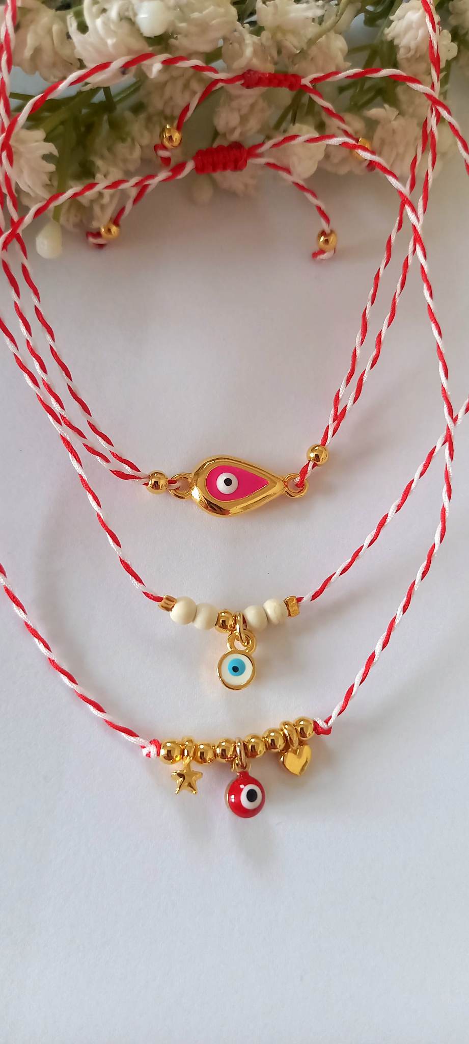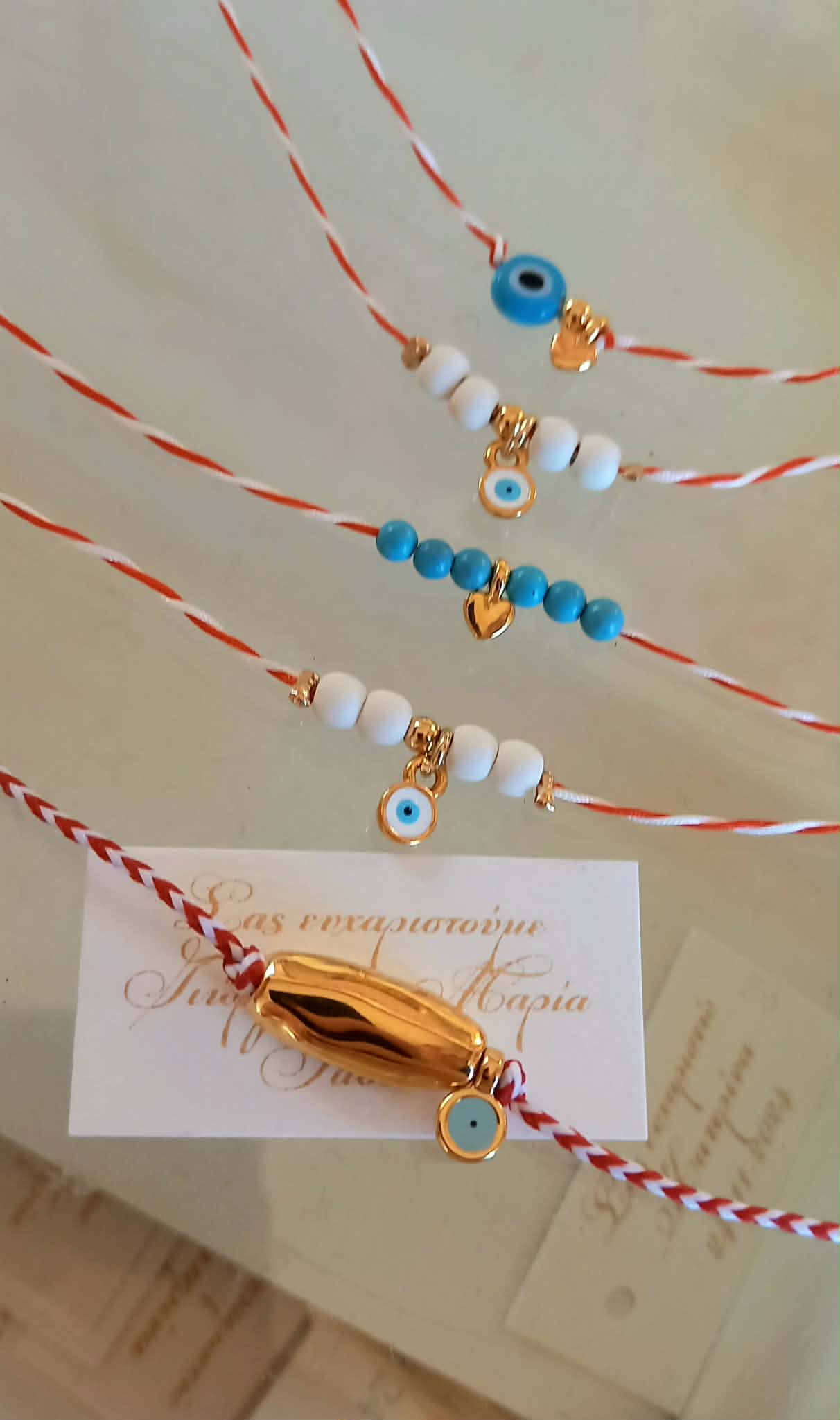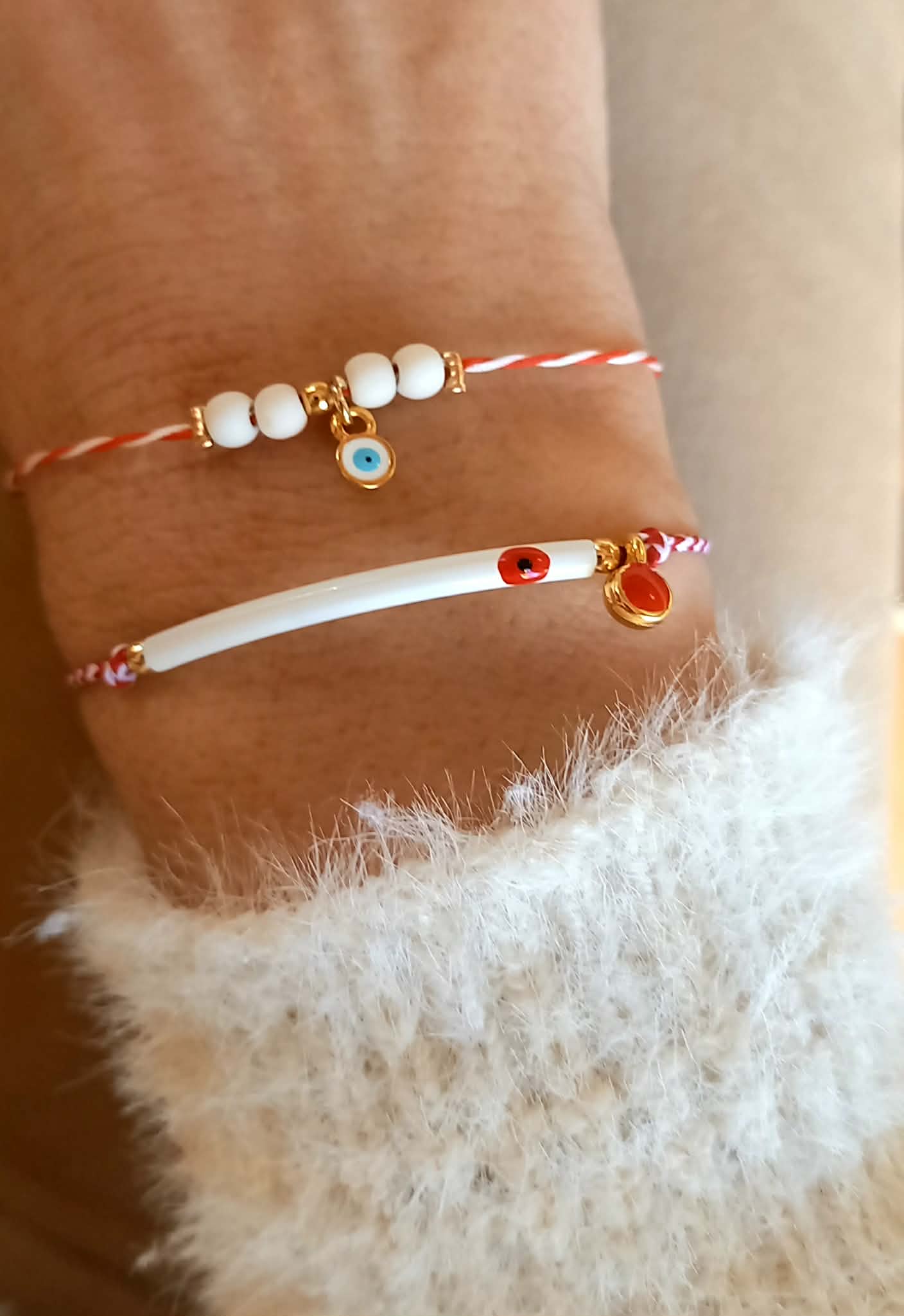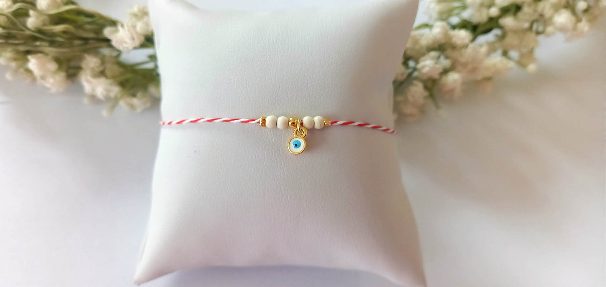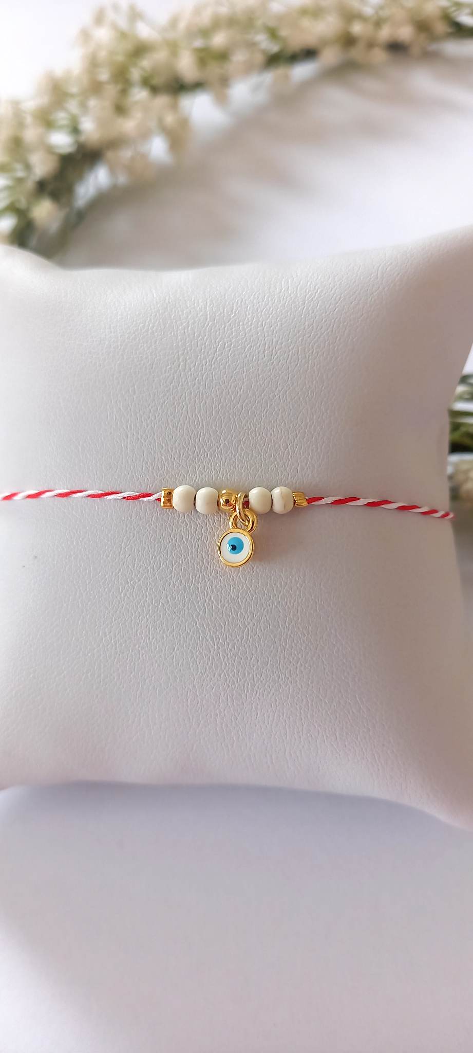 Χειροποίητο μαρτάκι με λεπτό λευκό-κόκκινο κορδόνι, ημιπολύτιμες πέτρες χαολίτη σε λευκό χρώμα, επιχρυσωμένο ματάκι με λευκό σμάλτο και χρυσή λεπτομέρεια.