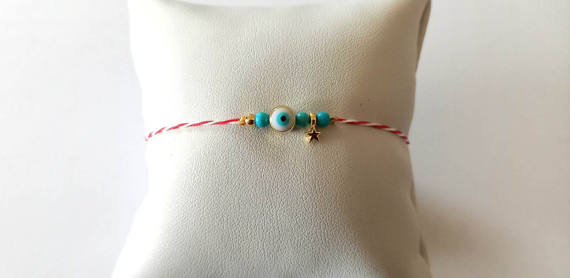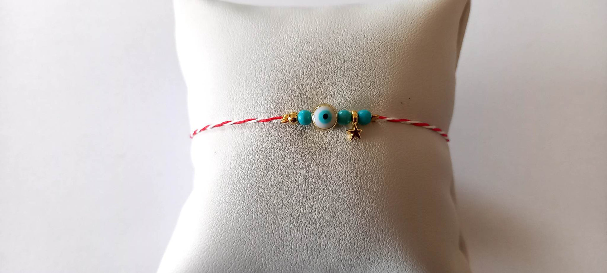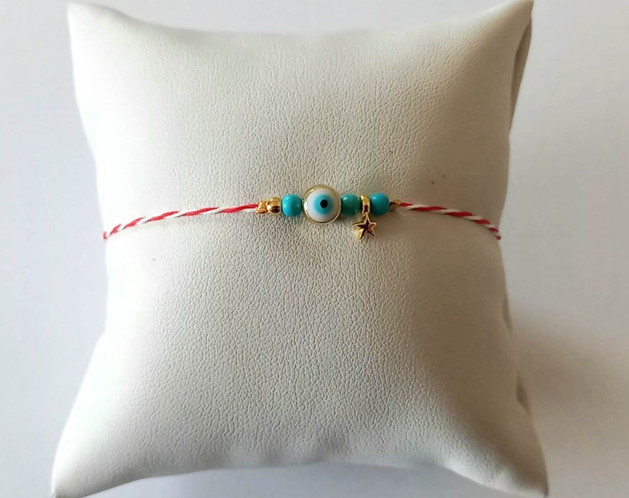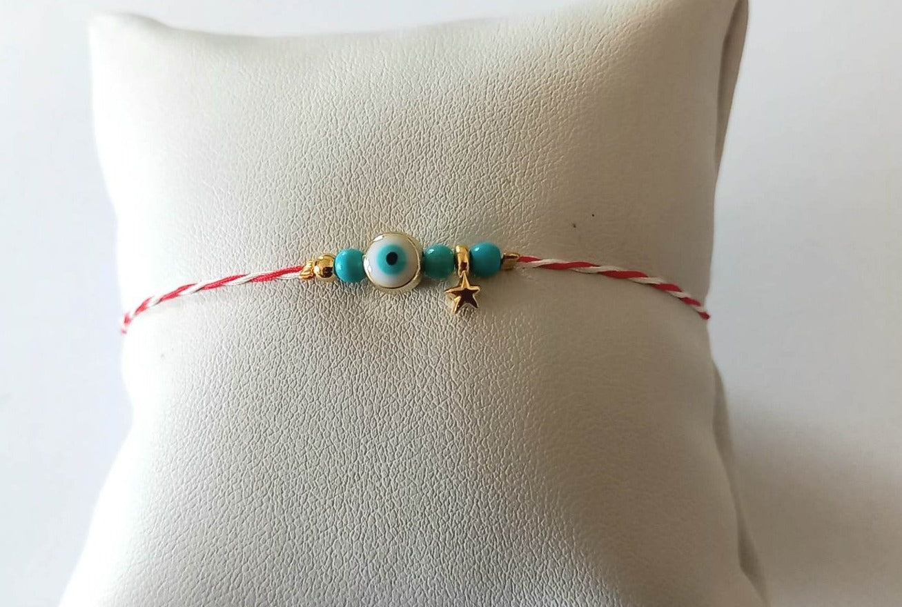 Χειροποίητο μαρτάκι με μάτι με λευκό σμάλτο, ημιπολύτιμες πέτρες χαολίτη σε τυρκουάζ χρώμα και χρυσές λεπτομέρειες.