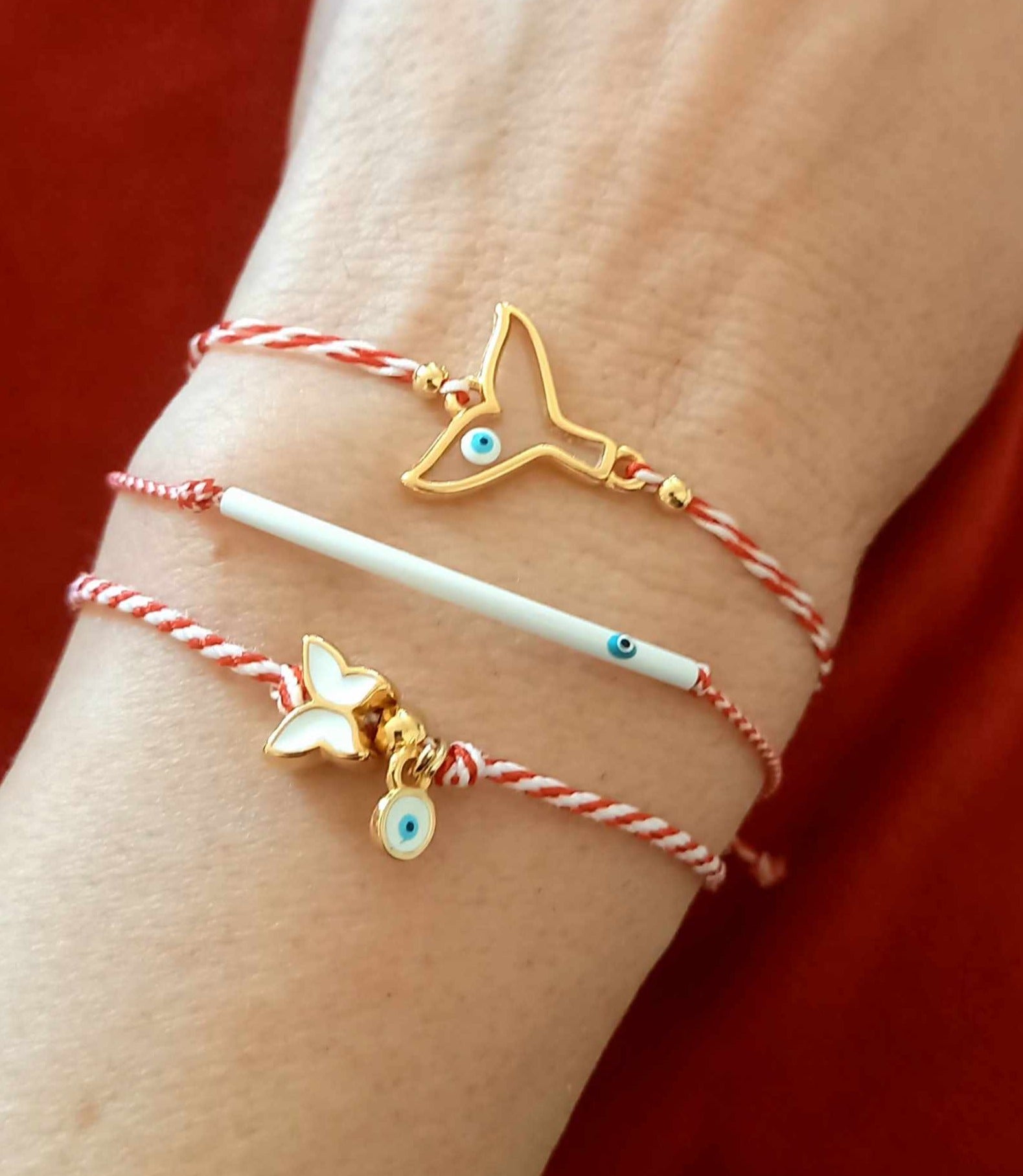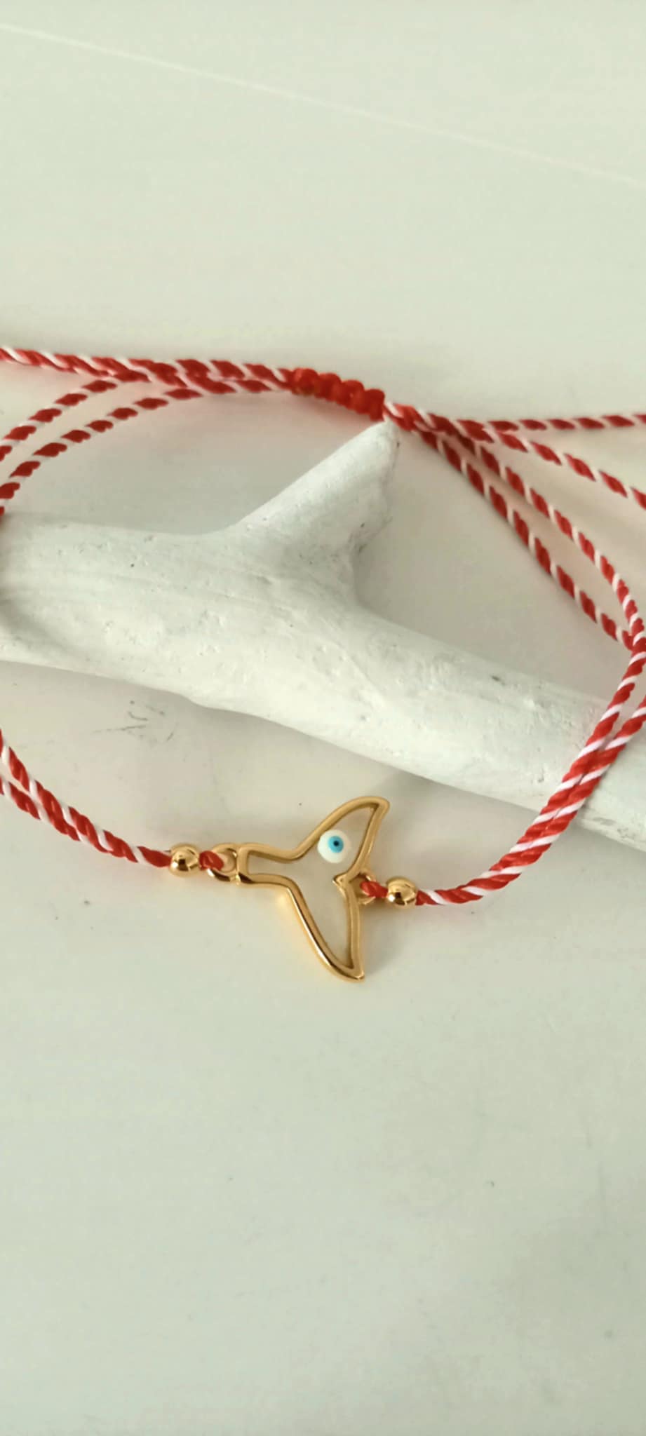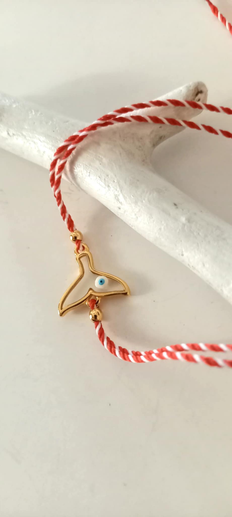 Χειροποίητο μαρτάκι με λεπτό κόκκινο-λευκό κορδόνι και μοτίφ ουρά γοργόνας με μάτι με λευκό σμάλτο.