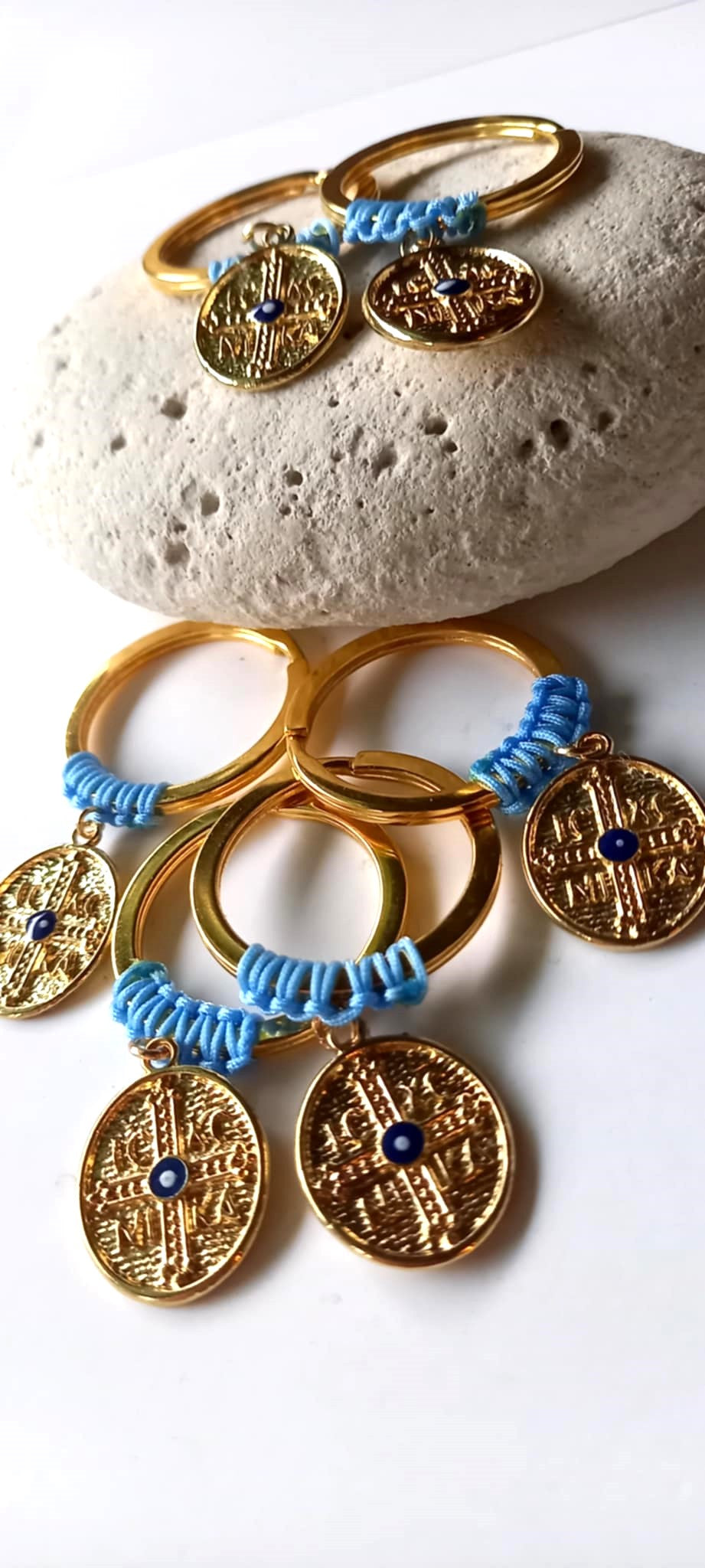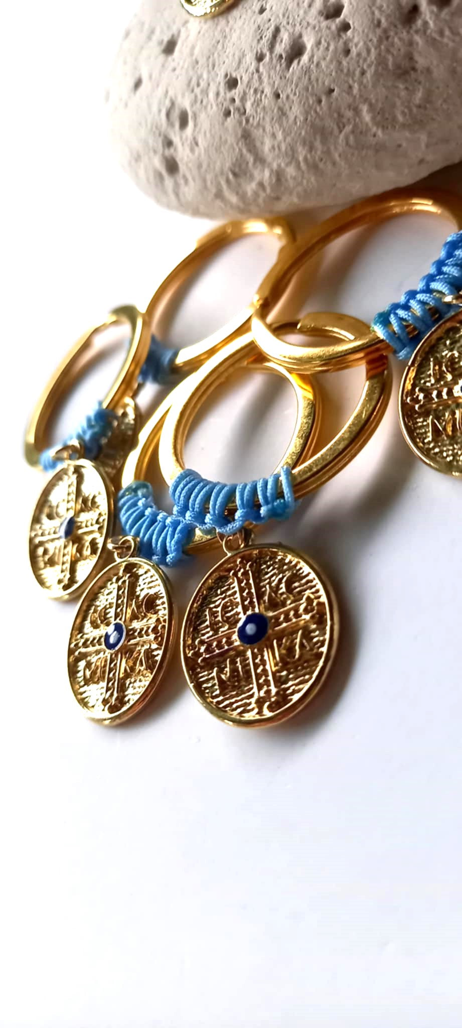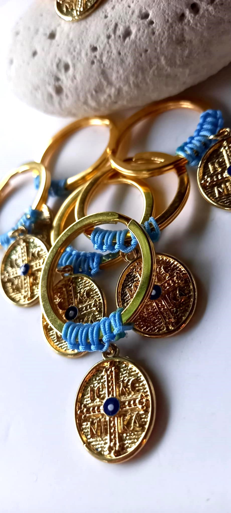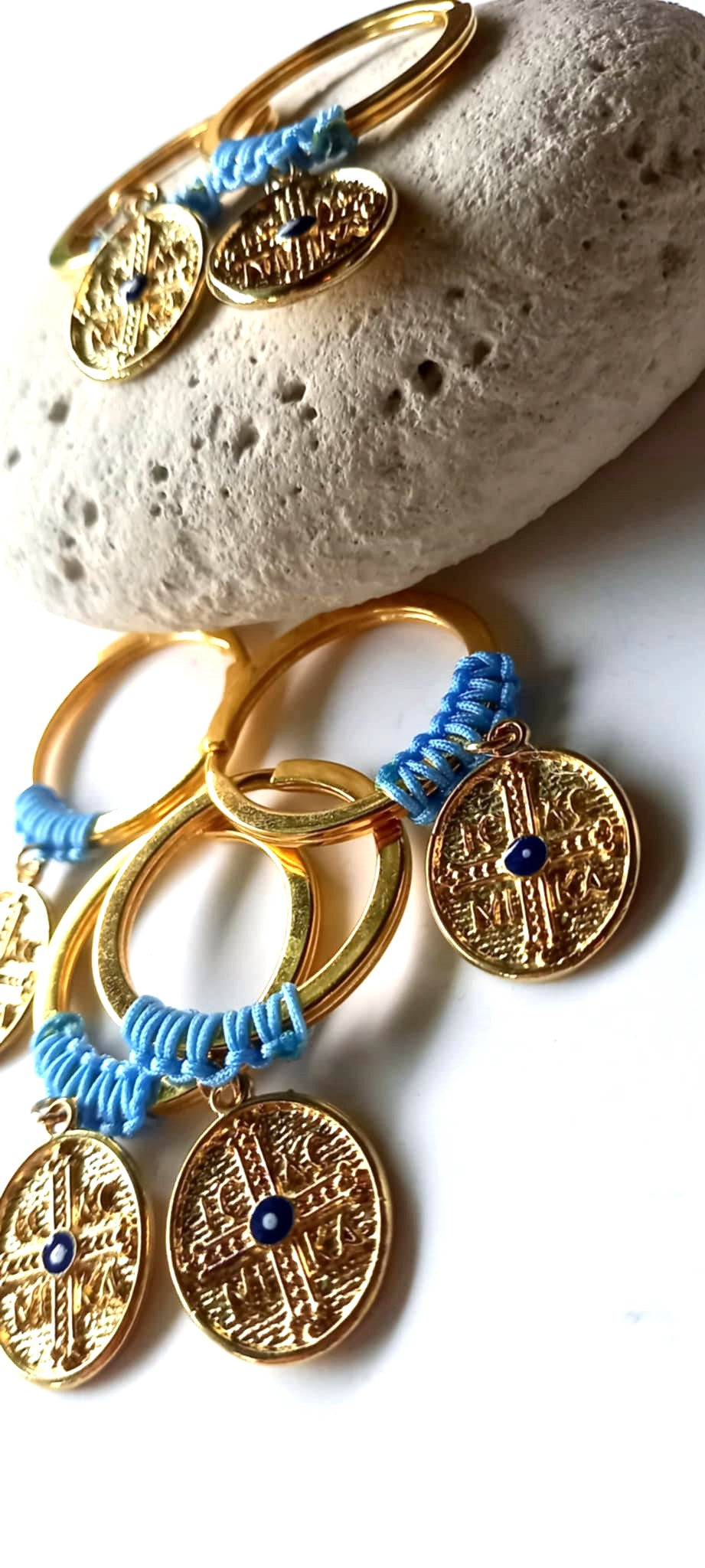 Χειροποίητο μαρτυρικό βάπτισης μπρελόκ με επιχρυσωμένο κωνσταντινάτο με μάτι με μπλε σμάλτο και γαλάζιο μακραμέ.